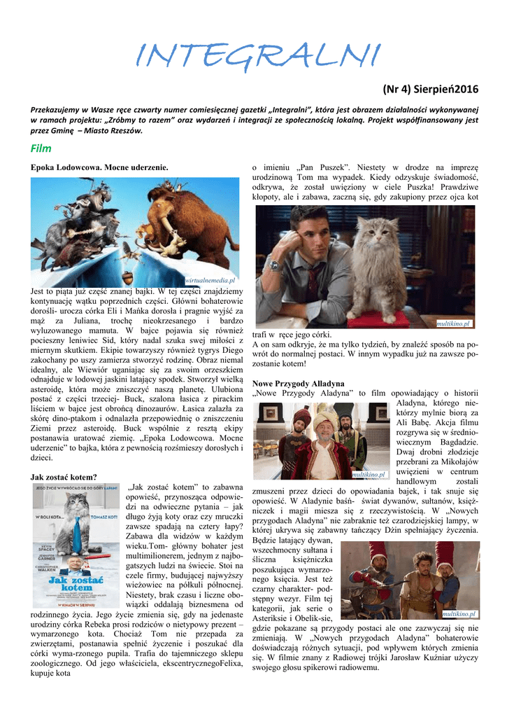 INTEGRALNI (Nr 4) Sierpień2016 Przekazujemy w Wasze ręce czwarty numer comiesięcznej gazetki „Integralni”, która jest obrazem działalności wykonywanej w ramach projektu: „Zróbmy to razem” oraz wydarzeń i integracji ze społecznością lokalną. Projekt współfinansowany jest przez Gminę – Miasto Rzeszów. Film o imieniu „Pan Puszek”. Niestety w drodze na imprezę urodzinową Tom ma wypadek. Kiedy odzyskuje świadomość, odkrywa, że został uwięziony w ciele Puszka! Prawdziwe kłopoty, ale i zabawa, zaczną się, gdy zakupiony przez ojca kot Epoka Lodowcowa. Mocne uderzenie. wirtualnemedia.pl Jest to piąta już część znanej bajki. W tej części znajdziemy kontynuację wątku poprzednich części. Główni bohaterowie dorośli- urocza córka Eli i Mańka dorosła i pragnie wyjść za mąż za Juliana, trochę nieokrzesanego i bardzo wyluzowanego mamuta. W bajce pojawia się również pocieszny leniwiec Sid, który nadal szuka swej miłości z miernym skutkiem. Ekipie towarzyszy również tygrys Diego zakochany po uszy zamierza stworzyć rodzinę. Obraz niemal idealny, ale Wiewiór uganiając się za swoim orzeszkiem odnajduje w lodowej jaskini latający spodek. Stworzył wielką asteroidę, która może zniszczyć naszą planetę. Ulubiona postać z części trzeciej- Buck, szalona łasica z pirackim liściem w bajce jest obrońcą dinozaurów. Łasica zalazła za skórę dino-ptakom i odnalazła przepowiednię o zniszczeniu Ziemi przez asteroidę. Buck wspólnie z resztą ekipy postanawia uratować ziemię. „Epoka Lodowcowa. Mocne uderzenie” to bajka, która z pewnością rozśmieszy dorosłych i dzieci. Jak zostać kotem? „Jak zostać kotem” to zabawna opowieść, przynosząca odpowiedzi na odwieczne pytania – jak długo żyją koty oraz czy mruczki zawsze spadają na cztery łapy? Zabawa dla widzów w każdym wieku.Tom- główny bohater jest multimilionerem, jednym z najbogatszych ludzi na świecie. Stoi na czele firmy, budującej najwyższy wieżowiec na półkuli północnej. Niestety, brak czasu i liczne obowiązki oddalają biznesmena od rodzinnego życia. Jego życie zmienia się, gdy na jedenaste urodziny córka Rebeka prosi rodziców o nietypowy prezent – wymarzonego kota. Chociaż Tom nie przepada za zwierzętami, postanawia spełnić życzenie i poszukać dla córki wyma-rzonego pupila. Trafia do tajemniczego sklepu zoologicznego. Od jego właściciela, ekscentrycznegoFelixa, kupuje kota multikino.pl trafi w ręce jego córki. A on sam odkryje, że ma tylko tydzień, by znaleźć sposób na powrót do normalnej postaci. W innym wypadku już na zawsze pozostanie kotem! Nowe Przygody Alladyna „Nowe Przygody Aladyna” to film opowiadający o historii Aladyna, którego niektórzy mylnie biorą za Ali Babę. Akcja filmu rozgrywa się w średniowiecznym Bagdadzie. Dwaj drobni złodzieje przebrani za Mikołajów uwięzieni w centrum multikino.pl handlowym zostali zmuszeni przez dzieci do opowiadania bajek, i tak snuje się opowieść. W Aladynie baśń- świat dywanów, sułtanów, księżniczek i magii miesza się z rzeczywistością. W „Nowych przygodach Aladyna” nie zabraknie też czarodziejskiej lampy, w której ukrywa się zabawny tańczący Dżin spełniający życzenia. Będzie latający dywan, wszechmocny sułtana i śliczna księżniczka poszukująca wymarzonego księcia. Jest też czarny charakter- podstępny wezyr. Film tej kategorii, jak serie o multikino.pl Asteriksie i Obelik-sie, gdzie pokazane są przygody postaci ale one zazwyczaj się nie zmieniają. W „Nowych przygodach Aladyna” bohaterowie doświadczają różnych sytuacji, pod wpływem których zmienia się. W filmie znany z Radiowej trójki Jarosław Kuźniar użyczy swojego głosu spikerowi radiowemu. Poezja Doznanie Anioła O Panie! Tęsknota Niezwykłość kadru sprawia że nie ma początku i końca jest bezkres nieba i grawitacja myśli szybujących ponad Koroną Bieszczad a wystarczyło dogadać się z pogodą i zaufać Caryńskiej wchodząc od Brzegów Górnych Gdy wołam: „Panie, ratuj mnie!’’, W morzu głęboko, Na środku łąki… Czuję Twą bliskość, O Panie! Zatopię się w bladej nicości, Wchłonę chaos I ogarnę spojrzeniem Nieogarnione Twe wejrzenie, O Panie! Zamieszkał we mnie cud wiary, Jak ziarno je pielęgnuję! Dzięki Ci, O Panie! Alicja Ludzie przychodzą i odchodzą góry zostają góry pamiętają ludzi a ludzie zakochują sie już na pierwszej randce i tęsknią za Bieszczadami w mślach słowach fotografiach i planują powrót przecież każda miłość czeka na spełnienie kochanków krajobrazu na tle czekającego Nieba Janek Borcz Janek Borcz Nasze prace Opowiadania SYN WANDY Legenda o Wandzie, co nie chciała Niemca Rozdział II Ratunek Pan Janek, wraz z nastaniem świtu, postanowił złożyć wizytę swoim sąsiadom. Tym razem nie były to miłe odwiedziny.Drewniany domek, nieopodal rzeczki Dębinki, był miejscem urokliwym, lecz tym razem przybysz nie miał siły ani ochoty kontemplować jego piękna. Jego serce cały czas było przy najstarszym synu, którego los leżał w rękach mało ugodowych gestapowców.Stanisław Sobocki był mężczyzną w kwiecie wieku, bardzo mądrym, można by rzec, wydającym Salomonowe widoki, tym większa była nadzieja pana Wilczyńskiego. Dodajmy, że pan Staszek cenił sąsiadów, jak własną rodzinę. - Pochwalony niech będzie!- przywitał serdecznie pana Jana. - Pochwalony, sąsiedzie! – odezwał się ojciec Juliana- Mam ważną sprawę do Ciebie. - Słucham, mój złoty! I tu w dużym skrócie zostały przedstawione losy młodego Wilczyńskiego. - Na to jest jedna rada- powiedział po dłuższej chwili zastanowienia Sobocki- Hm mm… pieniądze… - Wyjdzie z aresztu? - Nie, ale uniknie wyroku śmierci. W najlepszym razie zostanie wysłany na przymusowe roboty do Niemiec. - W najlepszym razie?! Co to ma być? - Mam Ci mówić, co ja przeżyłem?!- oburzył się pan Stanisław