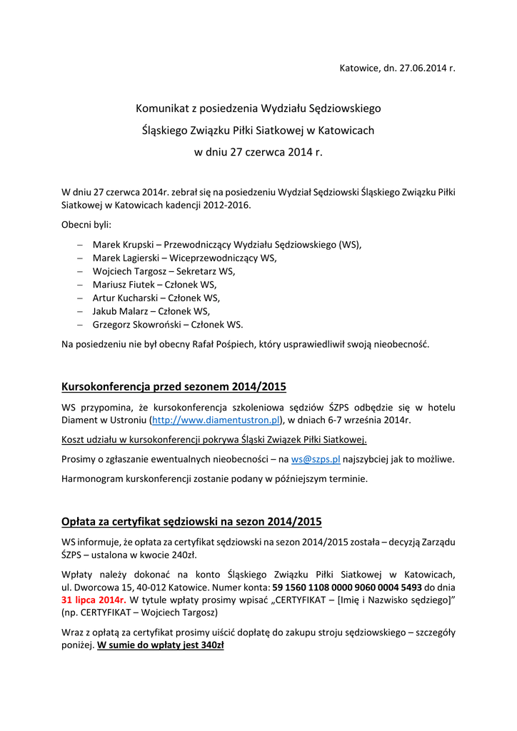 Katowice, dn. 27.06.2014 r. Komunikat z posiedzenia Wydziału Sędziowskiego Śląskiego Związku Piłki Siatkowej w Katowicach w dniu 27 czerwca 2014 r. W dniu 27 czerwca 2014r. zebrał się na posiedzeniu Wydział Sędziowski Śląskiego Związku Piłki Siatkowej w Katowicach kadencji 2012-2016. Obecni byli: − − − − − − − Marek Krupski – Przewodniczący Wydziału Sędziowskiego (WS), Marek Lagierski – Wiceprzewodniczący WS, Wojciech Targosz – Sekretarz WS, Mariusz Fiutek – Członek WS, Artur Kucharski – Członek WS, Jakub Malarz – Członek WS, Grzegorz Skowroński – Członek WS. Na posiedzeniu nie był obecny Rafał Pośpiech, który usprawiedliwił swoją nieobecność. Kursokonferencja przed sezonem 2014/2015 WS przypomina, że kursokonferencja szkoleniowa sędziów ŚZPS odbędzie się w hotelu Diament w Ustroniu (http://www.diamentustron.pl), w dniach 6-7 września 2014r. Koszt udziału w kursokonferencji pokrywa Śląski Związek Piłki Siatkowej. Prosimy o zgłaszanie ewentualnych nieobecności – na [email protected] najszybciej jak to możliwe. Harmonogram kurskonferencji zostanie podany w późniejszym terminie. Opłata za certyfikat sędziowski na sezon 2014/2015 WS informuje, że opłata za certyfikat sędziowski na sezon 2014/2015 została – decyzją Zarządu ŚZPS – ustalona w kwocie 240zł. Wpłaty należy dokonać na konto Śląskiego Związku Piłki Siatkowej w Katowicach, ul. Dworcowa 15, 40-012 Katowice. Numer konta: 59 1560 1108 0000 9060 0004 5493 do dnia 31 lipca 2014r. W tytule wpłaty prosimy wpisać „CERTYFIKAT – [Imię i Nazwisko sędziego]” (np. CERTYFIKAT – Wojciech Targosz) Wraz z opłatą za certyfikat prosimy uiścić dopłatę do zakupu stroju sędziowskiego – szczegóły poniżej. W sumie do wpłaty jest 340zł Zakup sprzętu sędziowskiego WS podjął decyzje o zakupie sprzętu sędziowskiego na sezon 2014/2015. Sędziowie zostaną wyposażeni w nowy sprzęt firmy Errea: koszulkę polo, spodnie, bluzę dresową i torbę sportową. Dopłata do sprzętu sędziowskiego została ustalona w kwocie 100zł od osoby. Prosimy o wpłatę tej kwoty razem z opłatą za certyfikat sędziowski na sezon 2014/2015 na konto ŚZPS. Istnieje możliwość zakupu DRUGIEJ KOSZULKI POLO wraz z nadrukami. Koszt zakupu drugiej koszulki wynosi 60zł. Jeśli ktoś chce otrzymać od razu dwie koszulki, to należy powiększyć wpłatę o ww. kwotę (w sumie do wpłaty 400zł) oraz przesłać informację o tym fakcie na [email protected] O możliwości dokonania przymiarki strojów poinformujemy w najbliższym czasie pocztą elektroniczną. Planowana jest możliwość przymiarki w 3 lokalizacjach: w biurze ŚZPS, w Bielsku-Białej oraz w Częstochowie (w każdym miejscu przez około 1 tydzień). W związku z zakupem sprzętu firmy Errea, każdy sędzia otrzyma indywidualny kod rabatowy na kolejne zakupy w sklepie internetowym www.errea-sklep.pl Nowe licencje sędziowskie – karty plastikowe WS postanowił, że od sezonu 2014/2015 wszyscy sędziowie ŚZPS będą się posługiwać licencjami sędziowskimi w formie karty plastikowej. W związku z tym bardzo prosimy wszystkich sędziów o niezwłoczne (najpóźniej do połowy sierpnia) przesłanie zdjęcia legitymacyjnego w formie elektronicznej na adres [email protected] Osoby, które nie wyślą zdjęcia, zostaną sfotografowane na kursokonferencji w Ustroniu i otrzymają licencję w późniejszym terminie. Nowe stawki ryczałtów za sędziowanie WS postanowił zwrócić się do Zarządu ŚZPS o zatwierdzenie nowych stawek ryczałtów za sędziowanie zawodów: Stawka meczowa Rodzaj rozgrywek Funkcja Stawka brutto Rozgrywki młodzieżowe Rozgrywki seniorskie 3 liga S1, S2, SG SS, SL S1, S2 SS, SL SG 90 60 160 90 130 Rozgrywki seniorskie 4 liga S1, S2 SS, SL SG 140 80 130 Stawka turniejowa Rodzaj rozgrywek Funkcja Rozgrywki młodzieżowe Rozgrywki seniorskie 3 liga, 4 liga S1, S2 SS, SL SG S1, S2 SS, SL SG Stawka brutto 115 80 135 210 130 170 Wniosek o przyjęcie nowych sędziów Po zakończonym w maju 2014r. kursie podstawowym na sędziego piłki siatkowej, WS postanowił zwrócić się do Zarządu ŚZPS o wydanie licencji 25 kandydatom: Broniszewski Michał Czyszczon Karol Dudzik Kamila Gajda Mateusz Gałaszek Krystian Górski Mateusz Hazuka Miłosz Janeczek Igor Łozińska Anna Łoziński Mariusz Łyczko Kamil Marcinkowska Katarzyna Milczanowski Kamil Olchawa Anna Olma Katarzyna Olma Anna Paprzycki Piotr Polak Piotr Różacka Marta Skroban Łukasz Sładczyk Dawid Sobierajska Paulina Tobór Beata Waloszczyk Łukasz Wyderka Wojciech Wniosek o skreślenie z listy sędziów Ze względu na niespełnienie limitu spotkań, WS postanowił zwrócić się do Zarządu ŚZPS o skreślenie z listy sędziów następujących osób: • • • • • • • • • Paweł Bajtlik Paula Broncel Michał Burdziński Piotr Józefowski Sandra Knop Mateusz Mnich Anna Nowicka Mateusz Skowron Katarzyna Tomaszewska Wniosek o nadanie nowych klas sędziowskich WS postanowił zwrócić się do Zarządu ŚZPS o nadanie nowych klas sędziowskich: Klasa I: Fortuna Bartłomiej Koperski Piotr Moczek Katarzyna Niemczura Tomasz Sajdok Katarzyna Włodyka Włodzimierz Klasa II: Waluś Rafał Wniosek o zatwierdzenie list uprawnień na sezon 2014/2015 WS postanowił zwrócić się do Zarządu ŚZPS o zatwierdzenie list uprawnień na sezon 2014/2015: Uprawnienia „J”: 1 2 3 4 5 6 7 8 9 10 11 12 13 14 15 16 17 18 19 20 21 22 23 24 25 26 27 28 29 30 31 32 33 34 35 36 37 38 39 40 Broniszewski Bula Chojnacki Czyszczon Dobrzański Dudzik Dylczyk Gajda Gałaszek Godlewicz Goździcka Górski Grzegorczyk Hajduk Hawryło Hazuka Janeczek Jaroszek Jastrzębowska Kasica Kicun Kielan Kowalik Kuchna Kuchna Lisak Łaz Łozińska Łoziński Łyczko Macek Marcinkowska Michalik Milczanowski Minor Olchawa Olma Olma Ostrowski Pańkowska Michał Emilia Karol Karol Sebastian obniżenie - poprzednio "IV" Kamila Kacper Mateusz Krystian Tomasz obn