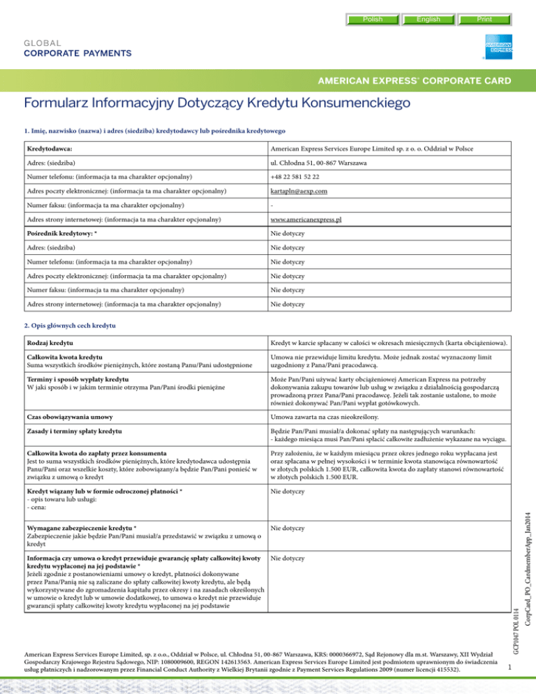 Polish English Print AMERICAN EXPRESS® CORPORATE CARD Wniosek o Informacyjny Formularz wydanie KartyDotyczący Korporacyjnej Kredytu American Konsumenckiego Express 1. Imię, nazwisko (nazwa) i adres (siedziba) kredytodawcy lub pośrednika kredytowego Kredytodawca: American Express Services Europe Limited sp. z o. o. Oddział w Polsce Adres: (siedziba) ul. Chłodna 51, 00-867 Warszawa Numer telefonu: (informacja ta ma charakter opcjonalny) +48 22 581 52 22 Adres poczty elektronicznej: (informacja ta ma charakter opcjonalny) [email protected] Numer faksu: (informacja ta ma charakter opcjonalny) - Adres strony internetowej: (informacja ta ma charakter opcjonalny) www.americanexpress.pl Pośrednik kredytowy: * Nie dotyczy Adres: (siedziba) Nie dotyczy Numer telefonu: (informacja ta ma charakter opcjonalny) Nie dotyczy Adres poczty elektronicznej: (informacja ta ma charakter opcjonalny) Nie dotyczy Numer faksu: (informacja ta ma charakter opcjonalny) Nie dotyczy Adres strony internetowej: (informacja ta ma charakter opcjonalny) Nie dotyczy Kredyt w karcie spłacany w całości w okresach miesięcznych (karta obciążeniowa). Całkowita kwota kredytu Suma wszystkich środków pieniężnych, które zostaną Panu/Pani udostępnione Umowa nie przewiduje limitu kredytu. Może jednak zostać wyznaczony limit uzgodniony z Pana/Pani pracodawcą. Terminy i sposób wypłaty kredytu W jaki sposób i w jakim terminie otrzyma Pan/Pani środki pieniężne Może Pan/Pani używać karty obciążeniowej American Express na potrzeby dokonywania zakupu towarów lub usług w związku z działalnością gospodarczą prowadzoną przez Pana/Pani pracodawcę. Jeżeli tak zostanie ustalone, to może również dokonywać Pan/Pani wypłat gotówkowych. Czas obowiązywania umowy Umowa zawarta na czas nieokreślony. Zasady i terminy spłaty kredytu Będzie Pan/Pani musiał/a dokonać spłaty na następujących warunkach: - każdego miesiąca musi Pan/Pani spłacić całkowite zadłużenie wykazane na wyciągu. Całkowita kwota do zapłaty przez konsumenta Jest to suma wszystkich środków pieniężnych, które kredytodawca udostępnia Panu/Pani oraz wszelkie koszty, które zobowiązany/a będzie Pan/Pani ponieść w związku z umową o kredyt Przy założeniu, że w każdym miesiącu przez okres jednego roku wypłacana jest oraz spłacana w pełnej wysokości i w terminie kwota stanowiąca równowartość w złotych polskich 1.500 EUR, całkowita kwota do zapłaty stanowi równowartość w złotych polskich 1.500 EUR. Kredyt wiązany lub w formie odroczonej płatności * - opis towaru lub usługi: - cena: Nie dotyczy Wymagane zabezpieczenie kredytu * Zabezpieczenie jakie będzie Pan/Pani musiał/a przedstawić w związku z umową o kredyt Nie dotyczy Informacja czy umowa o kredyt przewiduje gwarancję spłaty całkowitej kwoty Nie dotyczy kredytu wypłaconej na jej podstawie * Jeżeli zgodnie z postanowieniami umowy o kredyt, płatności dokonywane przez Pana/Panią nie są zaliczane do spłaty całkowitej kwoty kredytu, ale będą wykorzystywane do zgromadzenia kapitału przez okresy i na zasadach określonych w umowie o kredyt lub w umowie dodatkowej, to umowa o kredyt nie przewiduje gwarancji spłaty całkowitej kwoty kredytu wypłaconej na jej podstawie American Express Services Europe Limited, sp. z o.o., Oddział w Polsce, ul. Chłodna 51, 00-867 Warszawa, KRS: 0000366972, Sąd Rejonowy dla m.st. Warszawy, XII Wydział Gospodarczy Krajowego Rejestru Sądowego, NIP: 1080009600, REGON 142613563. American Express Services Europe Limited jest podmiotem uprawnionym do świadczenia usług płatniczych i nadzorowanym przez Financial Conduct Authority z Wielkiej Brytanii zgodnie z Payment Services Regulations 2009 (numer licencji 415532). 1 CorpCard_PO_CardmemberApp_Jan2014 Rodzaj kredytu GCP1047 POL 0114 2. Opis głównych cech kredytu AMERICAN EXPRESS® CORPORATE CARD Wniosek o Informacyjny Formularz wydanie KartyDotyczący Korporacyjnej Kredytu American Konsumenckiego Express 3. Koszty kredytu Stopa oprocentowania kredytu oraz warunki jej zmiany Oprocentowanie karty wynosi 0% w skali rocznej. Oprocentowanie to obowiązuje tak długo, jak Panu/Pani przysługuje kredyt, a na Pana/Pani karcie jest saldo dodatnie. Oprocentowanie to nie może być zmienione. Rzeczywista roczna stopa oprocentowania Jest to całkowity koszt kredytu ponoszony przez konsumenta, wyrażony jako wartość procentowa całkowitej kwoty kredytu w stosunku rocznym przedstawiona aby pomóc Panu/Pani w porównaniu oferowanych kredytów Przy założeniu, że nie jest Pan/Pani odpowiedzialny/a za zapłatę opłaty rocznej za kartę, oraz że w każdym miesiącu przez okres jednego roku wypłacana jest oraz spłacana w pełnej wysokości i w terminie kwota stanowiąca równowartość w złotych polskich 1.500 EUR roczna rzeczywista stopa procentowa wynosi 0%. Obowiązek zawarcia umowy dodatkowej Do uzyskania kredytu konieczne jest zawarcie przez Pana/Panią umowy dodatkowej, w szczególności umowy ubezpieczenia lub innej umowy Obowiązek zawarcia umowy dodatkowej w szczególności umowy ubezpieczenia: - Nie Koszty, które zobowiązany/a będzie Pan/Pani ponieść w związku z umową o kredyt * Koszty prowadzenia jednego lub kilku rachunków w celu dokonywania wpłat i wypłat środków pieniężnych * Nie dotyczy Koszty korzystania z kart kredytowych * Nie dotyczy Inne koszty, które konsument zobowiązany jest ponieść w związku z umową * Może być Pan/Pani zobowiązany do ponoszenia następujących opłat i prowizji w związku z umową, w przypadku zaistnienia okoliczności uzasadniających ich wymagalność: - opłaty za dostarczenie kopii wyciągów – 10 PLN - opłaty za wypłaty gotówkowe – 4% nie mniej niż 9 PLN - opłaty za przeliczenie walut obciążeń lub wypłat gotówkowych dokonanych w walucie innej niż PLN – 2,5% - opłaty za udzielenie informacji dotyczącej Pana/Pani rachunku lub obciążeń wykraczających poza informacje za