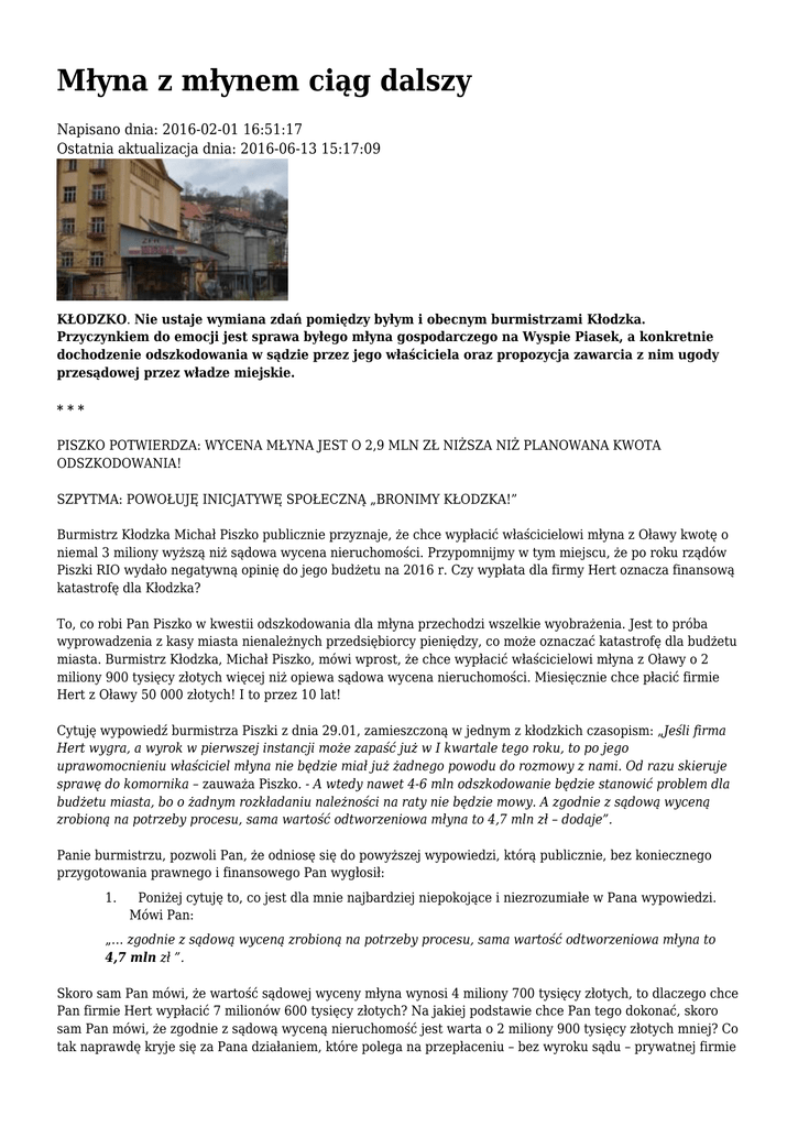 Młyna z młynem ciąg dalszy Napisano dnia: 2016-02-01 16:51:17 Ostatnia aktualizacja dnia: 2016-06-13 15:17:09 KŁODZKO. Nie ustaje wymiana zdań pomiędzy byłym i obecnym burmistrzami Kłodzka. Przyczynkiem do emocji jest sprawa byłego młyna gospodarczego na Wyspie Piasek, a konkretnie dochodzenie odszkodowania w sądzie przez jego właściciela oraz propozycja zawarcia z nim ugody przesądowej przez władze miejskie. *** PISZKO POTWIERDZA: WYCENA MŁYNA JEST O 2,9 MLN ZŁ NIŻSZA NIŻ PLANOWANA KWOTA ODSZKODOWANIA! SZPYTMA: POWOŁUJĘ INICJATYWĘ SPOŁECZNĄ „BRONIMY KŁODZKA!” Burmistrz Kłodzka Michał Piszko publicznie przyznaje, że chce wypłacić właścicielowi młyna z Oławy kwotę o niemal 3 miliony wyższą niż sądowa wycena nieruchomości. Przypomnijmy w tym miejscu, że po roku rządów Piszki RIO wydało negatywną opinię do jego budżetu na 2016 r. Czy wypłata dla firmy Hert oznacza finansową katastrofę dla Kłodzka? To, co robi Pan Piszko w kwestii odszkodowania dla młyna przechodzi wszelkie wyobrażenia. Jest to próba wyprowadzenia z kasy miasta nienależnych przedsiębiorcy pieniędzy, co może oznaczać katastrofę dla budżetu miasta. Burmistrz Kłodzka, Michał Piszko, mówi wprost, że chce wypłacić właścicielowi młyna z Oławy o 2 miliony 900 tysięcy złotych więcej niż opiewa sądowa wycena nieruchomości. Miesięcznie chce płacić firmie Hert z Oławy 50 000 złotych! I to przez 10 lat! Cytuję wypowiedź burmistrza Piszki z dnia 29.01, zamieszczoną w jednym z kłodzkich czasopism: „Jeśli firma Hert wygra, a wyrok w pierwszej instancji może zapaść już w I kwartale tego roku, to po jego uprawomocnieniu właściciel młyna nie będzie miał już żadnego powodu do rozmowy z nami. Od razu skieruje sprawę do komornika – zauważa Piszko. - A wtedy nawet 4-6 mln odszkodowanie będzie stanowić problem dla budżetu miasta, bo o żadnym rozkładaniu należności na raty nie będzie mowy. A zgodnie z sądową wyceną zrobioną na potrzeby procesu, sama wartość odtworzeniowa młyna to 4,7 mln zł – dodaje”. Panie burmistrzu, pozwoli Pan, że odniosę się do powyższej wypowiedzi, którą publicznie, bez koniecznego przygotowania prawnego i finansowego Pan wygłosił: 1. Poniżej cytuję to, co jest dla mnie najbardziej niepokojące i niezrozumiałe w Pana wypowiedzi. Mówi Pan: „… zgodnie z sądową wyceną zrobioną na potrzeby procesu, sama wartość odtworzeniowa młyna to 4,7 mln zł ”. Skoro sam Pan mówi, że wartość sądowej wyceny młyna wynosi 4 miliony 700 tysięcy złotych, to dlaczego chce Pan firmie Hert wypłacić 7 milionów 600 tysięcy złotych? Na jakiej podstawie chce Pan tego dokonać, skoro sam Pan mówi, że zgodnie z sądową wyceną nieruchomość jest warta o 2 miliony 900 tysięcy złotych mniej? Co tak naprawdę kryje się za Pana działaniem, które polega na przepłaceniu – bez wyroku sądu – prywatnej firmie wartości jej nieruchomości? 2. I dalej, na początku powyższej wypowiedzi mówi Pan: „Jeśli firma Hert wygra…” Skąd takie założenie, że Hert wygra? Na podstawie jakich przesłanek uważa Pan, że Miasto przegra ten proces? Z dokumentacji przygotowanej przez Pana pracowników, ich zeznań, wynika jasno, że Hert nie ma żadnych praw do roszczeń od miasta. Trzeba tylko rzetelnie zapoznać się z dokumentacją i dać działać kancelarii prawnej, która jest przekonana o tym, że Kłodzko ten proces wygra. 3. I następna część Pana wypowiedzi : „… wyrok w pierwszej instancji może zapaść już w I kwartale tego roku, to po jego uprawomocnieniu właściciel młyna nie będzie miał już żadnego powodu do rozmowy z nami. Od razu skieruje sprawę do komornika – zauważa Piszko”. Skąd Pan powziął informację, że Kłodzko przegra ten proces? Czy sąd w Świdnicy przesłał Panu informację o swoim wyroku, który ma zapaść – jak sam Pan mówi – dopiero w przyszłości? Na jakiej podstawie zakłada Pan, że miasto przegra ten proces? A może po prostu, kiedy nie dopnie Pan ugody z Hertem, bo nastroje społeczne są bliskie wrzenia, po prostu zamierza Pan przegrać ten proces? I to byłby prawdziwy dramat dla Kłodzka! 4. Mówi Pan dalej: „… nawet 4-6 mln odszkodowanie będzie stanowić problem dla budżetu miasta”. I znowu - skąd wziął Pan w swojej wypowiedzi taką kwotę odszkodowania? Dlaczego Pan feruje wyroki zamiast sąd w Świdnicy? Czy sąd informował Pana o wysokości kwot, jakie będzie w przyszłości zasądzał? Czy sąd ze Świdnicy, przed którym toczy się postępowanie, informował Pana, że Kłodzko przegra w tym postępowaniu? 5. I jeszcze: „… o żadnym rozkładaniu należności na raty nie będzie mowy.” W tym miejscu znowu wypowiada się Pan za sąd w Świdnicy. Czy naprawdę zna Pan wyrok w tej sprawie i czy zna Pan wszystkie jego zapisy? Dlaczego wprowadza Pan w błąd mieszkańców Kłodzka cytując wyroki, których nie ma? Czy zasadne jest publicznie wyrażać wątpliwości o swoich racjach, zanim proces sądowy dobiegł końca? Czy sąd w Świdnicy nie weźmie pod uwagę powyższych wypowiedzi Michała Piszki jako osłabienie pozycji miasta w sporze z firmą Hert? Takich wypowiedzi po prostu nie wolno publikować, bo wyraźnie wskazują, że miasto chce się zgodzić na niekorzystne dla siebie rozstrzygnięcia. Jeśli sąd weźmie Pańskie wypowiedzi w trakcie procesu pod uwagę i gmina przegra proces – cała odpowiedzialność za tę sytuację spadnie na Pana! Jak widać, w powyższych wypowiedziach burmistrz Piszko podaje publicznie firmie Hert argumenty, które mają doprowadzić do wypłaty przez miasto Kłodzko szalonej kwoty 7 milionów 600 tysięcy złotych niezasądzonego odszkodowania. Zupełnie nie rozumiem, dlaczego Pan Piszko broni bardziej pieniędzy Herta niż pieniędzy miasta? Czytam i nie znajduję żadnego usprawiedliwienia dla takiego postępowania. Przecież Kłodzko na tym ewidentnie traci! Z 
