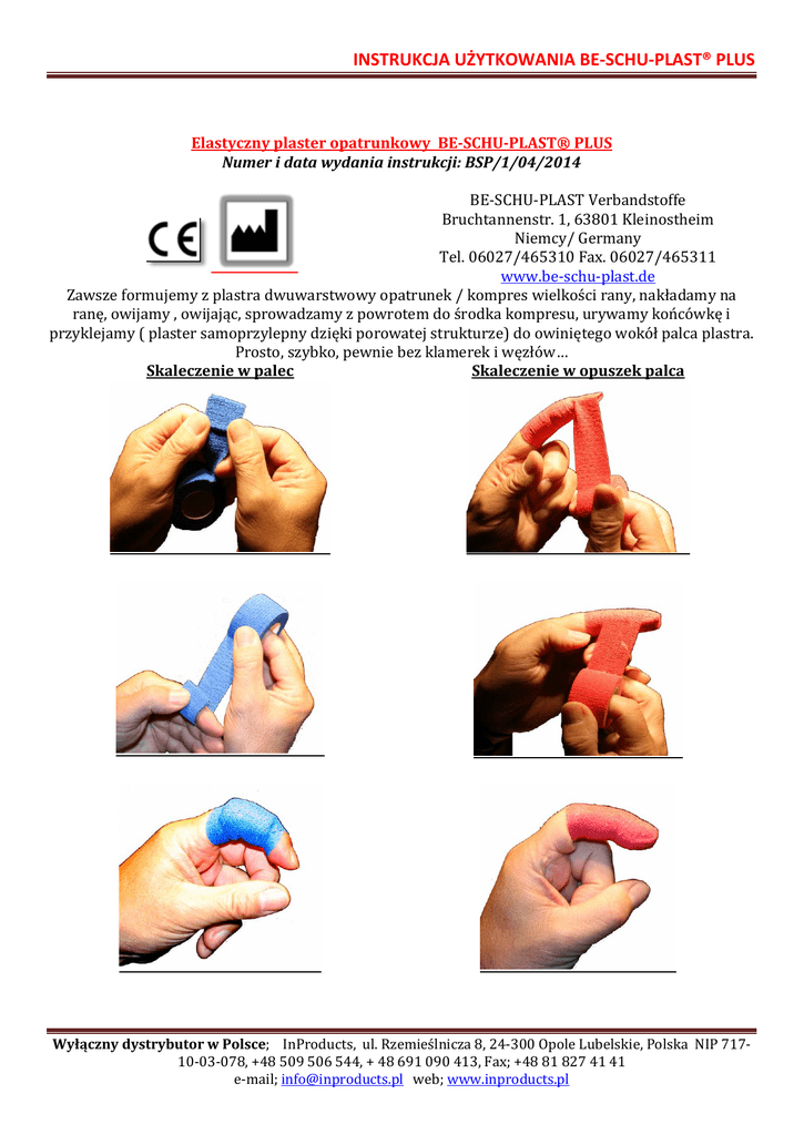 INSTRUKCJA UŻYTKOWANIA BE-SCHU-PLAST® PLUS Elastyczny plaster opatrunkowy BE-SCHU-PLAST® PLUS Numer i data wydania instrukcji: BSP/1/04/2014 BE-SCHU-PLAST Verbandstoffe Bruchtannenstr. 1, 63801 Kleinostheim Niemcy/ Germany Tel. 06027/465310 Fax. 06027/465311 www.be-schu-plast.de Zawsze formujemy z plastra dwuwarstwowy opatrunek / kompres wielkości rany, nakładamy na ranę, owijamy , owijając, sprowadzamy z powrotem do środka kompresu, urywamy końcówkę i przyklejamy ( plaster samoprzylepny dzięki porowatej strukturze) do owiniętego wokół palca plastra. Prosto, szybko, pewnie bez klamerek i węzłów… Skaleczenie w palec Skaleczenie w opuszek palca Wyłączny dystrybutor w Polsce; InProducts, ul. Rzemieślnicza 8, 24-300 Opole Lubelskie, Polska NIP 71710-03-078, +48 509 506 544, + 48 691 090 413, Fax; +48 81 827 41 41 e-mail; [email protected] web; www.inproducts.pl