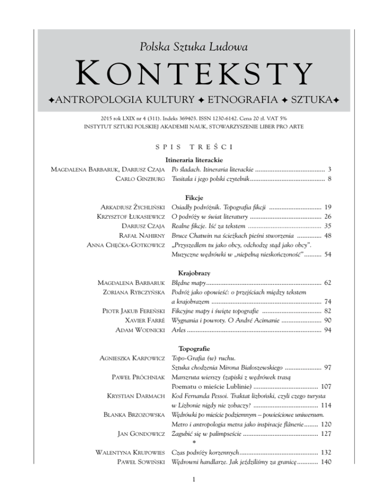 Polska Sztuka Ludowa K o n t e ks t y Fantropologia kultury F etnografia F sztukaF 2015 rok LXIX nr 4 (311). Indeks 369403. ISSN 1230-6142. Cena 20 zł. Vat 5% instytut sztuki polskiej akademii nauk, stowarzyszenie Liber Pro Arte Sp i s t r e ś c i Itineraria literackie Magdalena Barbaruk, Dariusz Czaja Po śladach. Itineraria literackie......................................... 3 Carlo Ginzburg Tusitala i jego polski czytelnik............................................ 8 Fikcje Arkadiusz Żychliński Osiadły podróżnik. Topografia fikcji ............................... 19 Krzysztof Łukasiewicz O podróży w świat literatury ......................................... 26 Dariusz Czaja Realne fikcje. Iść za tekstem ........................................... 35 Rafał Nahirny Bruce Chatwin na ścieżkach pieśni stworzenia ............... 48 Anna Chęćka-Gotkowicz „Przyszedłem tu jako obcy, odchodzę stąd jako obcy”. Muzyczne wędrówki w „niepełną nieskończoność”........... 54 Krajobrazy Magdalena Barbaruk Błędne mapy................................................................... 62 Zoriana Rybczyńska Podróż jako opowieść: o przejściach między tekstem a krajobrazem ............................................................... 74 Piotr Jakub Fereński Fikcyjne mapy i święte topografie ................................... 82 Xavier Farré Wygnania i powroty. O André Acimanie ....................... 90 Adam Wodnicki Arles.............................................................................. 94 Topografie Agnieszka KarpowiczTopo-Grafia (w) ruchu. Sztuka chodzenia Mirona Białoszewskiego . .................... 97 Paweł PróchniakMarszruta wierszy (zapiski z wędrówek trasą Poematu o mieście Lublinie)...................................... 107 Krystian DarmachKod Fernanda Pessoi. Traktat lizboński, czyli czego turysta w Lizbonie nigdy nie zobaczy? . .................................... 114 Blanka Brzozowska Wędrówki po mieście podziemnym – powieściowe uniwersum. Metro i antropologia metra jako inspiracje flânerie......... 120 Jan Gondowicz Zagubić się w palimpseście............................................ 127 * Walentyna Krupowies Czas podróży korzennych.............................................. 132 Paweł Sowiński Wędrowni handlarze. Jak jeździliśmy za granicę............. 140 1 Spis treści Petro Murianka A Wisła dalej płynie. Opisać życie . .............................. 147 Marian PilotGap betlejemski, nazareński, jerozolimski, jerychoński (i mikstacki) .............................................. 154 Henryk Bereza Podróż włoska (1978)................................................... 163 Jan Gondowicz, Paweł Mościcki, Tomasz Szerszeń Podróżnicy bez mapy i paszportu – zapis rozmowy o książce Tomasza Szerszenia . ........... 166 Maria Poprzęcka Bunt tej drugiej osoby we mnie . ................................... 174 Jan SłoniewskiWątki mistyki żydowskiej w twórczości Anselma Kiefera ...................................... 184 Bartosz Flak Chłopski (grupowy) portret pośmiertny ........................ 194 Dorota Mieszek Trumienki Mortona Bartletta. Między niesamowitością a wstrętem ............................. 206 Henryk Jurkowski Lalki na Madagaskarze i pobliskich wyspach ................ 214 Lena Magnone Pierwsze pokolenie polskich freudystów – próba geopsychoanalizy ............................................. 219 Giulia Guadagnin, Ludwik Stomma Pod lukrem .................................................................. 234 Henryk Bereza Zapiski. 1981 (II) . ...................................................... 237 Józef Chrobak 28.02.1948 – 02.10.2015 Karol Chrobak Skrócony biogram Józefa Chrobaka . ............................ Wybrana bibliografia opracowań, katalogów, książek pod redakcją Józefa Chrobaka .......................... Zofia Gołubiew Józik ............................................................................ Anda Rottenberg Wszystko się na coś przyda . ......................................... Jan Pamuła Józef Chrobak 1948-2015 ........................................... Marek Świca Józef Chrobak in memoriam ........................................ Konstanty Węgrzyn Józik – człowiek niezwykły ........................................... Maria Anna Potocka Józef Chrobak – detektyw kultury ................................ Karol Chrobak Życie jako fascynacja ................................................... Karolina Czerska Kilka słów o Józefie Chrobaku – śladami Tadeusza Kantora . ...................................... Zbigniew Benedyktowicz Nasze spotkanie z Józefem Chrobakiem . ...................... Marcin Krassowski, Aleksandra Domaradzka, Urszula Klimut, Rafał Rukat Rozmowa o panu Józefie Chrobaku . ............................ 249 251 254 257 258 261 262 263 267 270 275 276 Noty o autorach........................................................ 278 Summaries................................................................. 282 Contents..................................................................... 287 2