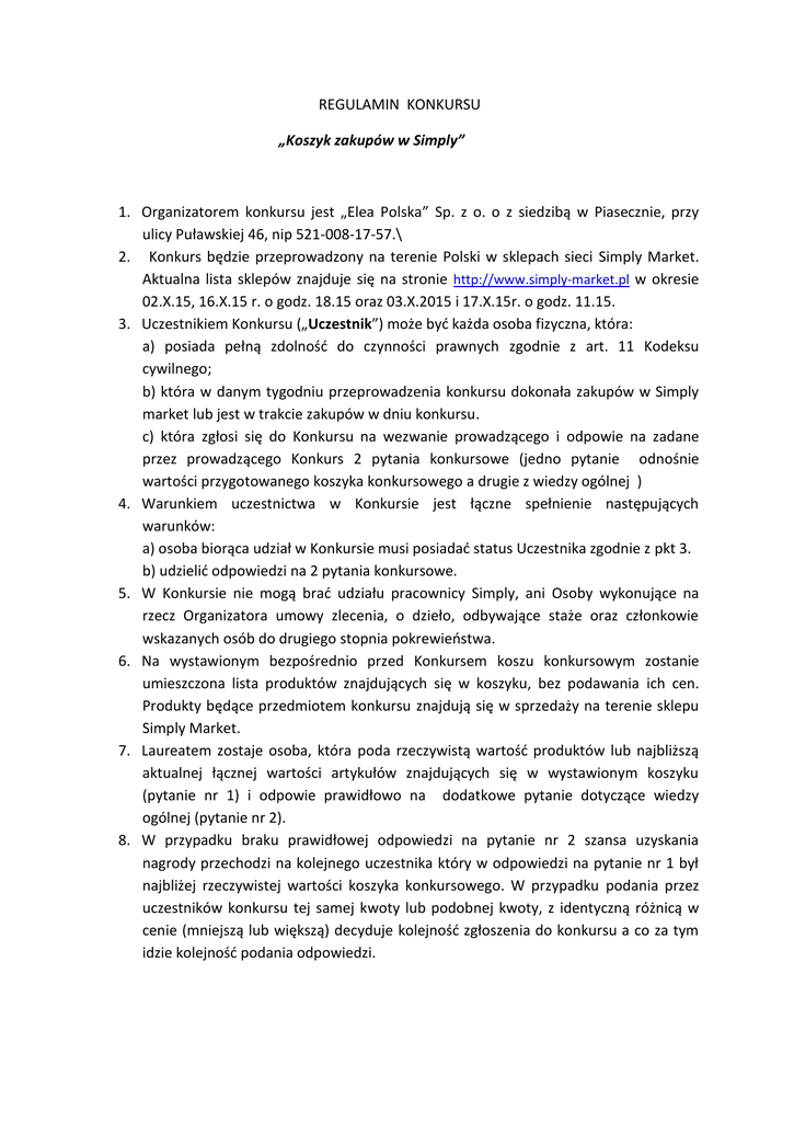 REGULAMIN KONKURSU „Koszyk zakupów w Simply” 1. Organizatorem konkursu jest „Elea Polska” Sp. z o. o z siedzibą w Piasecznie, przy ulicy Puławskiej 46, nip 521-008-17-57.\ 2. Konkurs będzie przeprowadzony na terenie Polski w sklepach sieci Simply Market. Aktualna lista sklepów znajduje się na stronie http://www.simply-market.pl w okresie 02.X.15, 16.X.15 r. o godz. 18.15 oraz 03.X.2015 i 17.X.15r. o godz. 11.15. 3. Uczestnikiem Konkursu („Uczestnik”) może być każda osoba fizyczna, która: a) posiada pełną zdolność do czynności prawnych zgodnie z art. 11 Kodeksu cywilnego; b) która w danym tygodniu przeprowadzenia konkursu dokonała zakupów w Simply market lub jest w trakcie zakupów w dniu konkursu. c) która zgłosi się do Konkursu na wezwanie prowadzącego i odpowie na zadane przez prowadzącego Konkurs 2 pytania konkursowe (jedno pytanie odnośnie wartości przygotowanego koszyka konkursowego a drugie z wiedzy ogólnej ) 4. Warunkiem uczestnictwa w Konkursie jest łączne spełnienie następujących warunków: a) osoba biorąca udział w Konkursie musi posiadać status Uczestnika zgodnie z pkt 3. b) udzielić odpowiedzi na 2 pytania konkursowe. 5. W Konkursie nie mogą brać udziału pracownicy Simply, ani Osoby wykonujące na rzecz Organizatora umowy zlecenia, o dzieło, odbywające staże oraz członkowie wskazanych osób do drugiego stopnia pokrewieństwa. 6. Na wystawionym bezpośrednio przed Konkursem koszu konkursowym zostanie umieszczona lista produktów znajdujących się w koszyku, bez podawania ich cen. Produkty będące przedmiotem konkursu znajdują się w sprzedaży na terenie sklepu Simply Market. 7. Laureatem zostaje osoba, która poda rzeczywistą wartość produktów lub najbliższą aktualnej łącznej wartości artykułów znajdujących się w wystawionym koszyku (pytanie nr 1) i odpowie prawidłowo na dodatkowe pytanie dotyczące wiedzy ogólnej (pytanie nr 2). 8. W przypadku braku prawidłowej odpowiedzi na pytanie nr 2 szansa uzyskania nagrody przechodzi na kolejnego uczestnika który w odpowiedzi na pytanie nr 1 był najbliżej rzeczywistej wartości koszyka konkursowego. W przypadku podania przez uczestników konkursu tej samej kwoty lub podobnej kwoty, z identyczną różnicą w cenie (mniejszą lub większą) decyduje kolejność zgłoszenia do konkursu a co za tym idzie kolejność podania odpowiedzi. 9. Podstawą do rozstrzygnięcia konkursu w zakresie pytania nr 1 będzie uprzednio przygotowany paragon zawierający podliczone i wyszczególnione produkty stanowiących przedmiot konkursu. 10. Rozstrzygnięcie konkursu nastąpi bezpośrednio po zakończeniu konkursu. 11. Nagrody wydawane będą bezpośrednio po rozstrzygnięciu Konkursu. 12. W Konkursie przewidziano nagrodę − voucher uprawniający do zakupu za 1 grosz wszystkich artykułów znajdujących się w koszyku konkursowym. Laureat konkursu ma możliwość zakupić ten przedmiot za 1 grosz wyłącznie w dniu uzyskania wygranej. 13. W Konkursie przewidziano nagrody pocieszenia w postaci słodyczy, dla wszystkich uczestników biorących udział w konkursie wyłączając Laureata, który wygrywa nagrodę główną. 14. Zwycięzcom nie przysługuje prawo do wymiany nagród ani otrzymania ich równowartości pieniężnej. 15. Biorąc udział Konkursie Uczestnik wyraża zgodę na zastosowanie się do niniejszego Regulaminu. 16. Regulamin konkursu „Oszacuj wartość produktów Simply” dostępny jest w Sklepach , w których przewidziane jest prowadzenie Konkursu oraz na stronie internetowej. 17. Organizator jest uprawniony do zmiany postanowień niniejszego Regulaminu, o ile nie wpłynie to na pogorszenie warunków uczestnictwa w Konkursie. Dotyczy to w szczególności zmian terminów poszczególnych czynności konkursowych.