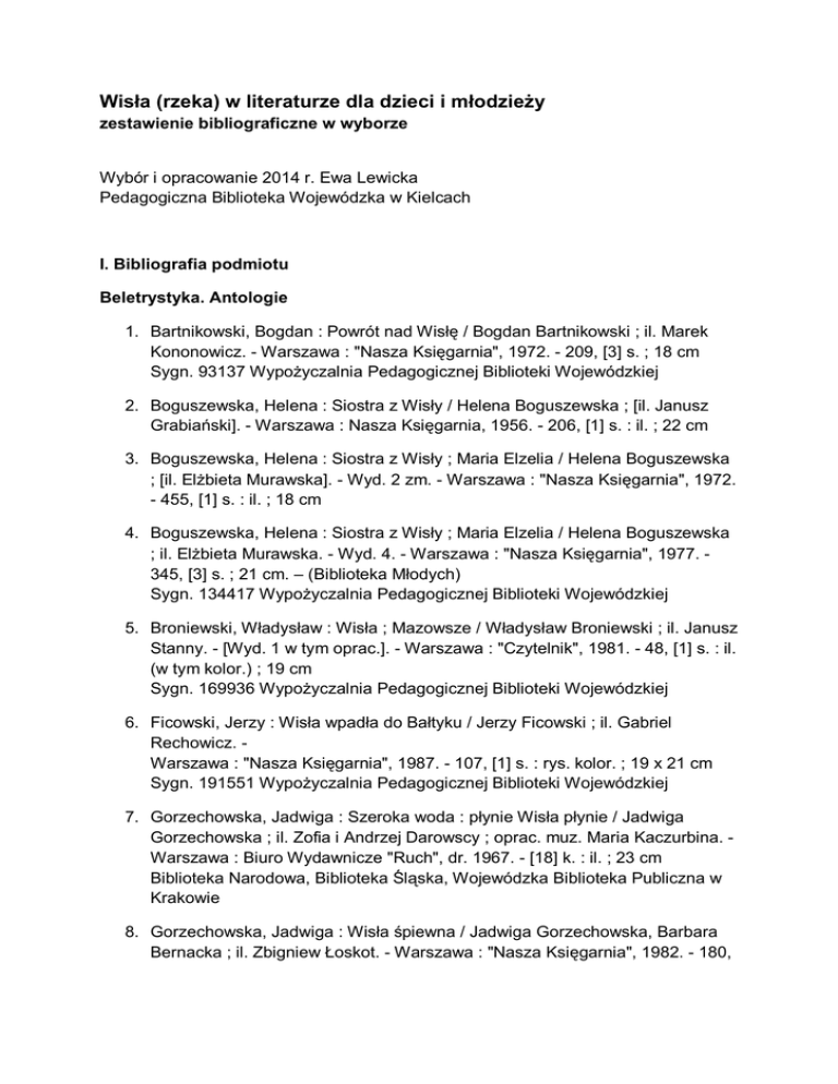 Wisła (rzeka) w literaturze dla dzieci i młodzieży zestawienie bibliograficzne w wyborze Wybór i opracowanie 2014 r. Ewa Lewicka Pedagogiczna Biblioteka Wojewódzka w Kielcach I. Bibliografia podmiotu Beletrystyka. Antologie 1. Bartnikowski, Bogdan : Powrót nad Wisłę / Bogdan Bartnikowski ; il. Marek Kononowicz. - Warszawa : "Nasza Księgarnia", 1972. - 209, [3] s. ; 18 cm Sygn. 93137 Wypożyczalnia Pedagogicznej Biblioteki Wojewódzkiej 2. Boguszewska, Helena : Siostra z Wisły / Helena Boguszewska ; [il. Janusz Grabiański]. - Warszawa : Nasza Księgarnia, 1956. - 206, [1] s. : il. ; 22 cm 3. Boguszewska, Helena : Siostra z Wisły ; Maria Elzelia / Helena Boguszewska ; [il. Elżbieta Murawska]. - Wyd. 2 zm. - Warszawa : "Nasza Księgarnia", 1972. - 455, [1] s. : il. ; 18 cm 4. Boguszewska, Helena : Siostra z Wisły ; Maria Elzelia / Helena Boguszewska ; il. Elżbieta Murawska. - Wyd. 4. - Warszawa : "Nasza Księgarnia", 1977. 345, [3] s. ; 21 cm. – (Biblioteka Młodych) Sygn. 134417 Wypożyczalnia Pedagogicznej Biblioteki Wojewódzkiej 5. Broniewski, Władysław : Wisła ; Mazowsze / Władysław Broniewski ; il. Janusz Stanny. - [Wyd. 1 w tym oprac.]. - Warszawa : "Czytelnik", 1981. - 48, [1] s. : il. (w tym kolor.) ; 19 cm Sygn. 169936 Wypożyczalnia Pedagogicznej Biblioteki Wojewódzkiej 6. Ficowski, Jerzy : Wisła wpadła do Bałtyku / Jerzy Ficowski ; il. Gabriel Rechowicz. Warszawa : "Nasza Księgarnia", 1987. - 107, [1] s. : rys. kolor. ; 19 x 21 cm Sygn. 191551 Wypożyczalnia Pedagogicznej Biblioteki Wojewódzkiej 7. Gorzechowska, Jadwiga : Szeroka woda : płynie Wisła płynie / Jadwiga Gorzechowska ; il. Zofia i Andrzej Darowscy ; oprac. muz. Maria Kaczurbina. Warszawa : Biuro Wydawnicze "Ruch", dr. 1967. - [18] k. : il. ; 23 cm Biblioteka Narodowa, Biblioteka Śląska, Wojewódzka Biblioteka Publiczna w Krakowie 8. Gorzechowska, Jadwiga : Wisła śpiewna / Jadwiga Gorzechowska, Barbara Bernacka ; il. Zbigniew Łoskot. - Warszawa : "Nasza Księgarnia", 1982. - 180, [4] s. : il. nuty ; 25 cm Sygn.163182 Wypożyczalnia Pedagogicznej Biblioteki Wojewódzkiej 9. Janczarski, Czesław : Nasza ziemia i słońce / Czesław Janczarski ; il. [kolor. ] Halina Gutsche ; [przedm. Elżbieta Brzoza]. - [Wyd. 2]. - Warszawa : "Nasza Księgarnia", 1980. – S. 16 : Wisła Sygn. 153696 Wypożyczalnia Pedagogicznej Biblioteki Wojewódzkiej 10. Janczarski, Czesław : Wisła // Czesław Janczarski // „Płomyczek”. - 1989, nr 9, s. 7 Wiersz. 11. Januszewska, Hanna : Flisak i Przydróżka / Hanna Januszewska ; il. J. M. Szancer. - Warszawa : „Nasza Księgarnia”, 1969. - 39, [1] s. : il. ; 24 cm. Bibliogr. w przypisach 12. Januszewska, Hanna : Flisak i Przydróżka / Hanna Januszewska ; il. J. M. Szancer. - Wyd. 8. - Warszawa : Nasza Księgarnia, 1972. - 39, [1] s. : il. kolor. ; 24 cm Sygn. 89469 Wypożyczalnia Pedagogicznej Biblioteki Wojewódzkiej 13. Kaleta, Roman : Antologia poezji o Wiśle : suplement / Roman Kaleta // „Ze Skarbca Kultury”. - 1988, z. 46, s. 31-108 Czytelnia Pedagogicznej Biblioteki Wojewódzkiej 14. Kulmowa, Joanna : Wisła (Pamięci księdza Jerzego Popiełuszki) / Joanna Kulmowa // „Graffiti”. – 1998, nr 2, s. 117 Wiersz. Biblioteka Uniwersytecka w Toruniu, Biblioteka Główna UMCS w Lublinie, Biblioteka Uniwersytecka KUL, Biblioteki Uniwersytetu Warszawskiego 15. Maciejewski, Bogdan : Symbol wszystkiego co polskie / Bogdan Maciejewski // „Kamena”. – 1978, nr 17, s. 9 Fragmenty wierszy o Wiśle powiązane komentarzem. Czytelnia Pedagogicznej Biblioteki Wojewódzkiej 16. Maciejewski, Bogdan : „Tym samym nurtem niewzruszonym…” / Bogdan Maciejewski // „Itd.” – 1978, nr 26, s. 8-9 Fragmenty wierszy o Wiśle powiązane komentarzem. Czytelnia Pedagogicznej Biblioteki Wojewódzkiej 17. Massalska-Kołaczkowska, Helena : A Wisła płynie... / Helena Massalska- Kołaczkowska. - Warszawa ; Otwock : Fuga Edition, Marek Sart, Agnieszka Szczerbińska, 2012. - 85, [1] s. ; 21 cm Tomik poezji zdobył Nagrodę Literacką Srebrny Kałamarz im. Hermenegildy Kociubińskiej. 18. Ożogowska, Hanna : Nasza Wisła / Hanna Ożogowska // „Głos Polski” [Toronto]. – 1992, nr 22, s. 24 Wiersz. Biblioteka Uniwersytecka Katolickiego Uniwersytetu Lubelskiego 19. „Wisło moja, Wisło stara ...” : antologia poezji / wybór, oprac. i posł. Edward Mazurkiewicz. - Kraków : Wydawnictwo Literackie, 1986. - 188, [3] s. : 5 faks. ; 21 cm Teksty utworów. Noty o autorach i tekstach. Sygn. 186873, 186874 Wypożyczalnia Pedagogicznej Biblioteki Wojewódzkiej Publikacje popularnonaukowe 20. Borucki, Marek : Wisłą do Gdańska / Marek Borucki ; [il. Z. Gamski et al.]. Warszawa : Wydawnictwa Szkolne i Pedagogiczne, 1974. - 73, [2] s. : il. ; 21 cm. – (Biblioteczka Historyczna) Sygn. 108751 Wypożyczalnia Pedagogicznej Biblioteki Wojewódzkiej 21. Borucki, Marek : Wisłą do Gdańska / Marek Borucki. - Wyd. 2 popr. Warszawa : Wydawnictwa Szkolne i Pedagogiczne, 1988. - 83 s. : rys. ; 17 cm. – (Biblioteczka Historyczna) Sygn. 195229 Wypożyczalnia Pedagogicznej Biblioteki Wojewódzkiej 22. Bujak, Adam : Nad Wisłą / Adam Bujak ; tekst Bogdan Baran. - Kraków : Wydawnictwo Baran i Suszczyński, cop. 1996. - [208] s. : fot. kolor. ; 31 cm Biblioteka Uniwersytecka KUL, Wojewódzka Biblioteka Publiczna w Lublinie, Biblioteka Jagiellońska i Biblioteka Medyczna Uniwersytetu Jagiellońskiego Collegium Medicum, Biblioteka Publiczna m. st. Warszawy, Biblioteki Uniwersytetu Warszawskiego 23. Burzyński, Roman : Wisła dziś - jutro / Roman Burzyński. - Warszawa : Wydawnictwa Szkolne i Pedagogiczne, 1977. - 120, [3] s. : il. ; 20 cm. – (Literatura s. 120-[121]) Sygn. 134421, 134422 Wypożyczalnia Pedagogicznej Biblioteki Wojewódzkiej 24. Burzyński, Roman : Wisła dziś - jutro / Roman Burzyński. - [Wyd. 2 zm.]. Warszawa : Wydawnictwa Szkolne i Pedagogiczne, 1980. - 119, [1] s. : il., 2 mapy ; 20 cm. – (Polska : biblioteczka graficzna). - Bibliogr. s. 119 Sygn. 1