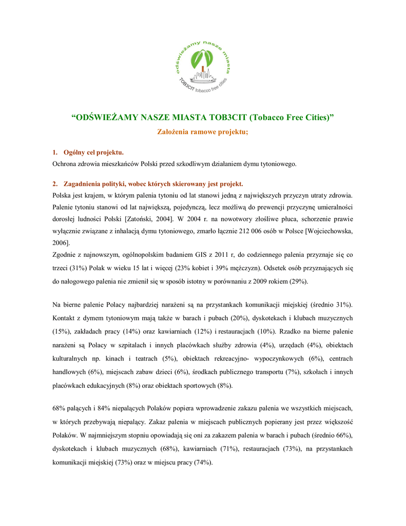 “OD WIE AMY NASZE MIASTA TOB3CIT (Tobacco Free Cities)” Za enia ramowe projektu; 1. Ogólny cel projektu. Ochrona zdrowia mieszka ców Polski przed szkodliwym dzia aniem dymu tytoniowego. 2. Zagadnienia polityki, wobec których skierowany jest projekt. Polska jest krajem, w którym palenia tytoniu od lat stanowi jedn z najwi kszych przyczyn utraty zdrowia. Palenie tytoniu stanowi od lat najwi ksz , pojedyncz , lecz mo liw do prewencji przyczyn umieralno ci doros ej ludno ci Polski [Zato ski, 2004]. W 2004 r. na nowotwory z wy cznie zwi zane z inhalacj dymu tytoniowego, zmar o liwe p uca, schorzenie prawie cznie 212 006 osób w Polsce [Wojciechowska, 2006]. Zgodnie z najnowszym, ogólnopolskim badaniem GIS z 2011 r, do codziennego palenia przyznaje si co trzeci (31%) Polak w wieku 15 lat i wi cej (23% kobiet i 39% m czyzn). Odsetek osób przyznaj cych si do na ogowego palenia nie zmieni si w sposób istotny w porównaniu z 2009 rokiem (29%). Na bierne palenie Polacy najbardziej nara eni s na przystankach komunikacji miejskiej ( rednio 31%). Kontakt z dymem tytoniowym maj tak e w barach i pubach (20%), dyskotekach i klubach muzycznych (15%), zak adach pracy (14%) oraz kawiarniach (12%) i restauracjach (10%). Rzadko na bierne palenie nara eni s Polacy w szpitalach i innych placówkach s by zdrowia (4%), urz dach (4%), obiektach kulturalnych np. kinach i teatrach (5%), obiektach rekreacyjno- wypoczynkowych (6%), centrach handlowych (6%), miejscach zabaw dzieci (6%), rodkach publicznego transportu (7%), szko ach i innych placówkach edukacyjnych (8%) oraz obiektach sportowych (8%). 68% pal cych i 84% niepal cych Polaków popiera wprowadzenie zakazu palenia we wszystkich miejscach, w których przebywaj niepal cy. Zakaz palenia w miejscach publicznych popierany jest przez wi kszo Polaków. W najmniejszym stopniu opowiadaj si oni za zakazem palenia w barach i pubach ( rednio 66%), dyskotekach i klubach muzycznych (68%), kawiarniach (71%), restauracjach (73%), na przystankach komunikacji miejskiej (73%) oraz w miejscu pracy (74%). Co dziesi ty (10%) Polak stwierdza, e wprowadzenie przepisów ograniczaj cych palenie tytoniu w miejscach publicznych zdecydowanie poprawi o przestrzeganie istniej cych zakazów palenia. Wed ug 46% badanych sytuacja pod tym wzgl dem raczej si poprawi a. 43% respondentów nie widzi ró nicy, a wed ug co setnego (1%) obecnie jest wr cz gorzej. Opinie osób pal cych i niepal cych na ten temat s bardzo zbli one. Zarówno osoby pal ce, jak i niepal ce dostrzegaj istnienie miejsc, w których zakaz palenia nie jest przestrzegany. Najcz ciej jako takie miejsca wskazywane s przystanki i obiekty komunikacji miejskiej (41%), a tak e bary i puby (17%), dyskoteki i kluby muzyczne (15%) oraz zak ady pracy (10%). Najrzadziej zakaz palenia amany jest w centrach handlowych, obiektach kulturalnych oraz obiektach rekreacyjnowypoczynkowych (po 2%). 3. Szczegó owe, mierzalne cele projektu. Celem projektu jest: 1) wzmocnienie realizacji ustawy z dnia 9 listopada 1995 r. o ochronie zdrowia przed nast pstwami ywania tytoniu i wyrobów tytoniowych (Dz. U. z 1996 r., Nr 10, poz. 55 z pó n zm.) poprzez: przygotowanie i dystrybucj podr cznika dla funkcjonariuszy PIS odpowiedzialnych za nadzór bie cy; szkolenia dla Stra ników Miejskich oraz funkcjonariuszy Policji odpowiedzialnych za wdra anie ustawy o ochronie zdrowia przed nast pstwami u ywania tytoniu i wyrobów tytoniowych; monitoring przestrzegania zakazu palenia oraz oznakowania stref bezdymnych w województwach, prowadzony przez funkcjonariuszy PIS; przygotowanie przez GIS raportu dot. do wiadcze WSSE i PSSE we wdra aniu ustawy. 2) wzmocnienie przestrzegania ustawy poprzez kampani spo eczn informuj o obowi zuj cych regulacjach w zakresie miejsc wolnych od dymu tytoniowego oraz konsekwencjach zdrowotnych u ywania tytoniu (czynne i bierne palenie). W tym: szkolenia dla 318 pracowników Oddzia ów O wiaty Zdrowotnej w zakresie koordynacji projektu; nawi zanie wspó pracy z lokalnymi partnerami projektu w celu zawi zania koalicji lokalnych; wspó praca z mediami lokalnymi; kwartalne spotkania koalicji lokalnych; wymiana informacji i najlepszych praktyk pomi dzy województwami; dystrybucja znaków zakazu palenia; podsumowuj ce badanie postaw wobec palenia tytoniu oraz przestrzegania ustawy. 3. Grupa docelowa Grup docelow , która ma by obj ta dzia aniami projektu powinny by wy cznie osoby doros e. 4. Ramy czasowe Projekt b dzie realizowany przez dwa kolejne lata (1 pa dziernika 2011 r. do 30 wrze nia 2013 r.) 5. Realizatorzy GIS, WSSE, PSSE 2