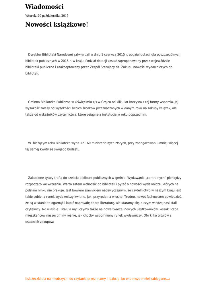 Wiadomości Wtorek, 20 października 2015 Nowości książkowe! Dyrektor Biblioteki Narodowej zatwierdził w dniu 1 czerwca 2015 r. podział dotacji dla poszczególnych bibliotek publicznych w 2015 r. w kraju. Podział dotacji został zaproponowany przez wojewódzkie biblioteki publiczne i zaakceptowany przez Zespół Sterujący ds. Zakupu nowości wydawniczych do bibliotek. Gminna Biblioteka Publiczna w Oświęcimiu z/s w Grojcu od kilku lat korzysta z tej formy wsparcia. Jej wysokość zależy od wysokości swoich środków przeznaczonych w danym roku na zakupy książek, ale także od wskaźników czytelnictwa, które osiągnęła instytucja w roku poprzednim. W bieżącym roku Biblioteka wyda 12 160 ministerialnych złotych, przy zaangażowaniu mniej więcej tej samej kwoty ze swojego budżetu. Zakupione tytuły trafią do sześciu bibliotek publicznych w gminie. Wydawanie „centralnych” pieniędzy rozpoczęto we wrześniu. Warto zatem wchodzić do bibliotek i pytać o nowości wydawnicze, których na polskim rynku nie brakuje. Jest bowiem zjawiskiem nadzwyczajnym, że czytelnictwo w naszym kraju jest takie sobie, a rynek wydawniczy kwitnie, jak przyroda na wiosnę. Trudno, nawet fachowcom powiedzieć, że są w stanie to ogarnąć i kupić naprawdę dobra literaturę, ale staramy się, o czym wiedzą nasi stali czytelnicy. No właśnie…stali, a my liczymy także na nowe twarze, nowych użytkowników, wszak liczba mieszkańców naszej gminy rośnie, jak choćby wspomniany rynek wydawniczy. Oto kilka tytułów z ostatnich zakupów: Książeczki dla najmłodszych- do czytania przez mamy i babcie, bo one może mniej zabiegane…: Beaumont E. : Mali mistrzowie futbolu, Mali mistrzowie koszykówki, Hapka C. : Jej Wysokość Zosia, Jamrógiewicz M. : Barbie Rockowa Księżniczka, Pokora P. : Barbie Perłowa Księżniczka/ Barbie w świecie mody, Joly F. : Lena i braciszek na piątkę, Lena świętuje urodziny, Lament A. : Czaruś i przyjaciele, Schneider L. : Zuzi rusza się ząb, Zuzia idzie na bal, Sprycha A. : Piękna i Bestia, Zaplątani, O’Connor J. : Fancy Nancy i wytworny szczeniaczek. Książki dla dzieci, które już nie potrzebują lektora…: Collodi C. : Pinokio, Jagiełło J. : Babula Babalunga, Montgomery L. M. : Ania z Zielonego Wzgórza, Musierowicz M. : Wnuczka do orzechów, Nienacki Z. : Pan Samochodzik i templariusze, Sendecki M. : Figle w fokarium, Chotomska W. : Pięciopsiaczki, Lindgren A. : Bracia lwie serce, Delahaye G. : Martynka- Na kursie pływania, Martynka- Nowa koleżanka, Martynka- Wakacje u babci, Martynka- Wyprawa pontonem, Martynka- Zaginiony piesek, Fabisińska L. : Klinika pod Boliłapką: Hopek nie może jeść, Rozetka rodzi szczeniaczki, Toffi ma katar, Fabisińska L. : Matylda i czekoladowe ciastko, Krzyżanek J. : Franek i zielony stworek, Landau I. : Jaś i zaczarowany przyjaciel, Kuba i niesforna piłka, Lenka i magiczne drzewo, Zuzia i piesek w kratkę, Jasny J. : Opowiadania z morałem, Mongredien S. : Klub Kociaków Słodziaków: Nowa przyjaciółka Miodka, Nowy dom Imbirka, Psotny Węgielek, Sekret Trufelka, Wielka przygoda Zygzaczka, Wielka ucieczka Dymka, Zarębska E. : Antek i stara jabłonka, Zosia i fiołkowy kapelusz, Zarębska E. : Klub Kociaków Słodziaków: Niesforny Zygzaczek, Sprytny Dymek, Troskliwy Trufelek, Wielkie łowy Imbirka. Propozycje dla młodzieży, która wie co jest cool: Forman G. : Ten jeden dzień, Ten jeden rok, Sugg Z. : Girl Online, Noël A. : Greckie wakacje, Gabaldon D. : Obca cz. I., Uwięziona w bursztynie cz. II., Podróżniczka cz. III., Jesienne werble cz. IV., Ognisty krzyż cz. V., Tchnienie śniegu i popiołu cz. VI., Hacz J. : Ja, Maciejka, Frey J. : Milion małych kawałków, Green J. : Gwiazd naszych wina, Papierowe miasta, Piotr C. : Pokolenie Ikea, Cast P. C. : Klątwa Neferet, Przysięga Smoka, Ślubowanie Zenobii, Upadek Kalony, Osaczona (Dom Nocy t. V.), Kuszona (Dom Nocy t. VI.), Spalona (Dom Nocy t. VII.), Przebudzona (Dom Nocy t. VIII.), Przeznaczona (Dom Nocy t. IX.), Ukryta (Dom Nocy t. X.), Ujawniona (Dom Nocy t. XI.), Wyzwolona (Dom Nocy t. XII.), O’Hearn K. : Pegaz. Ogień życia t. I., Pegaz. Walka o Olimp t. II., Pegaz. Nowi olimpijczycy t. III., Pegaz. Początek Olimpu t. IV., Pike A. : Ocalona, Uprowadzona. Literatura relaksująca dla niektórych pań: Gąsiorowska D. : Obietnica Łucji, Marzenie Łucji, Steel D. : Country, Hardy T. : Z dala od zgiełku, James E. L. : Grey. …oczami Christiana, Stachniak E. : Katarzyna Wielka. Gra o władzę, Mansell J. : Gotowe na miłość, Kocham cię nad życie. Książki z głębokim dnem: Lark S. : Kobiety Maorysów, Złoto Maorysów, Stephens M. : Kupiona i sprzedana, Zweig S. : Dzieci z alei Rothschildów, May I. : Dzieci Gosi, Hill L. : Aminata. Siła miłości. Mocne uderzenie dla mężczyzn: Archer J. : Potężniejszy od miecza, Ellin S. : Prosto w przepaść, Górski A. : Pięść Dawida- tajne służby Izraela, Lansdale J. R. : Lipcowy mróz, Lagercrantz D. : Co nas nie zabije, Lackberg C. : Kamieniarz, Niemiecki bękart, Nesbo J. : Krew na śniegu, Policja, Wybawiciel. Dla tych co lubią świat jaki jest: Koprowski M. A. : Kobiety kresowe, Treanor D. : Misja Mongolia. Do Ułan Bator przez stepy…, Troost J. M. : Na haju do raju. Życie na Fidżi i Vanuatu, Dla tych co ciągle poszerzają horyzonty: Carter L., Minirth F. : Gniew- jak nad nim zapanować?, Czerwińska M. : Psychologia rozwoju młodzieży w kontekście biegu ludzkiego życia, Lewicka- Zelent A. : Dziecko a rozwód, Niedziółka P. : Bankowość inwestycyjna. Książki z dużymi literami: Bulicz- Kasprzak K. : Szlachetne pobudki Chamberlain D. : Milcząca siostra Deaver J. : Kolekcjoner skór Frączyk I. : Siostra mojej siostry Fryczkowska A. : Kurort amnezja Harper E. : Cząstka Ciebie Jeromin- Gałuszka G. : Złoty sen Kleypas L. : Zaufaj mi Kołakowska A. : Przyjaciółki Kołczewska K. : Wbrew sobie Lee H. : Dziewczyna o siedmiu imionach Lennox J. : Punkt zwro