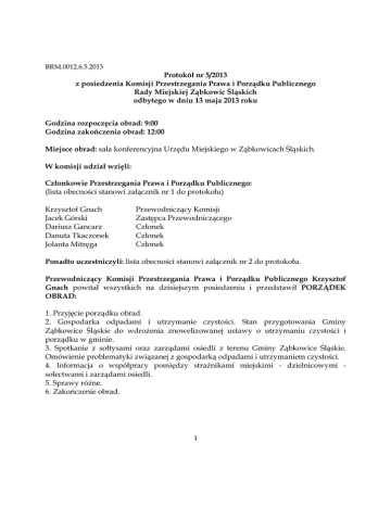 BRM.0012.6.5.2013 Protokół nr 5/2013 z posiedzenia Komisji Przestrzegania Prawa i Porządku Publicznego Rady Miejskiej Ząbkowic Śląskich odbytego w dniu 13 maja 2013 roku Godzina rozpoczęcia obrad: 9:00 Godzina zakończenia obrad: 12:00 Miejsce obrad: sala konferencyjna Urzędu Miejskiego w Ząbkowicach Śląskich. W komisji udział wzięli: Członkowie Przestrzegania Prawa i Porządku Publicznego: (lista obecności stanowi załącznik nr 1 do protokołu) Krzysztof Gnach Jacek Górski Dariusz Gancarz Danuta Tkaczonek Jolanta Mitręga Przewodniczący Komisji Zastępca Przewodniczącego Członek Członek Członek Ponadto uczestniczyli: lista obecności stanowi załącznik nr 2 do protokołu. Przewodniczący Komisji Przestrzegania Prawa i Porządku Publicznego Krzysztof Gnach powitał wszystkich na dzisiejszym posiedzeniu i przedstawił PORZĄDEK OBRAD: 1. Przyjęcie porządku obrad. 2. Gospodarka odpadami i utrzymanie czystości. Stan przygotowania Gminy Ząbkowice Śląskie do wdrożenia znowelizowanej ustawy o utrzymaniu czystości i porządku w gminie. 3. Spotkanie z sołtysami oraz zarządami osiedli z terenu Gminy Ząbkowice Śląskie. Omówienie problematyki związanej z gospodarką odpadami i utrzymaniem czystości. 4. Informacja o współpracy pomiędzy strażnikami miejskimi - dzielnicowymi sołectwami i zarządami osiedli. 5. Sprawy różne. 6. Zakończenie obrad. 1 Ad. pkt. 1 Przyjęcie porządku obrad. Przewodniczący Komisji Przestrzegania Prawa i Porządku Publicznego Krzysztof Gnach, poprosił członków komisji o wprowadzenie do porządku obrad, przed sprawami różnymi, rozpatrzenie dwóch skarg, które wpłynęły do komisji. • Skarga Pana Marka Brzezińskiego na działalność burmistrza i podległych mu spółek przesłana przez NIK we Wrocławiu • Skarga Pana Mieczysława Rodak na działanie Pani Kierownik Ośrodka Pomocy Społecznej Izabeli Lisowskiej Porządek obrad został przyjęty przez Komisję. Ad. pkt. 2 Gospodarka odpadami i utrzymanie czystości. Stan przygotowania Gminy Ząbkowice Śląskie do wdrożenia znowelizowanej ustawy o utrzymaniu czystości i porządku. i Ad. pkt. 3 Spotkanie z sołtysami oraz zarządami osiedli z terenu Gminy Ząbkowice Śląskie. Omówienie problematyki związanej z gospodarką odpadami i utrzymaniem czystości. Przewodniczący Komisji Przestrzegania Prawa i Porządku Publicznego Krzysztof Gnach, poprosił aby połączyć punkt 3 z punktem 2. Kierownik Wydziału IGP Wojciech Jankowski, przedstawił przygotowanie Gminy Ząbkowice Śląskie do wdrożenia ustawy o utrzymaniu czystości. Powiedział, że wpłynęło 5 tysięcy deklaracji i wprowadzają w system w zakresie ewidencji danych. Ogłosili przetarg, jest to przetarg czterdziesto dniowy. Na polecenie Burmistrza zostają gromadzone przez nich różne zastrzeżenia przez ludzi. Szykują się na zmianę części uchwał podjętych przez Radę Miejską w Ząbkowicach Śląskich dotyczy to w szczególności regulaminu, są uwagi między innymi dot. norm przewidzianych w regulaminie dla poszczególnych podmiotów, szczególnie dotyczy podmiotów. Regulamin został w zakresie norm oparty o poprzedni regulamin, który obowiązywał, ustalili normy, ale one nie były wiążące do końca. Będą korygować uchwały. Radna Danuta Tkaczonek, poprosiła, aby przybliżyć najważniejsze warunki przetargu. Chodzi o rozwiązanie kwestii z pojemnikami obszarów takich jak osiedla i starego miasta. 2 Kierownik Wydziału IGP Wojciech Jankowski, odpowiedział, że obowiązkiem właściciela, zarządcy lub władającego nieruchomością i tak przyjęli w postępowaniach i w przetargu jest władający -wyposaża nieruchomość w pojemniki. Zmiana, którą w tej chwili Wrocław chce stosować żebyśmy nagle w całe Miasto i Gminy, aby Gmina fundowała pojemniki, co zrobić z tymi starymi i to straszny koszt nie każdego byłoby stać, za te pojemniki ludzie muszą zapłacić. Struktura na dzień dzisiejszy po konsultacjach z ZGK, struktura wyposażenia w wielkości i ilości pojemników jest dobra, bo nie było większych zastrzeżeń i specjalnie wpisali do specyfikacji, że utrzymują w tych zbiorowiskach na rynku. Dotychczasowe KP7 muszą być utrzymane. Firma która wygra musi dysponować tymi pojemnikami. Radna Danuta Tkaczonek, powiedziała, że nie stawiałaby tak ostro linii, bo cały czas ma uczucie, że Urząd chcę się odciąć przepisami prawa od pomocy mieszkańcom w nowej sytuacji w jakiej znajdziemy się 1 lipca i cały czas powtarza, że w interesie Gminy jest aby ta zmiana aby ten odbiór śmieci, nieczystości i odpadów odbywał się w sposób minimalnie bezkonfliktowy. Wspomniała o gminach które zabezpieczają w pojemniki dla mieszkańców. Sołtys Jerzy Rzepka, zapytał jakby to się miało w stosunku do ludzi którzy byli wcześniej zmuszeni do wykupienia sobie pojemników. Wszyscy je kupowali. Radna Danuta Tkaczonek, odpowiedziała, że to ma dotyczyć wszystkich. Każdy mieszkaniec Gminy w uzasadnionych przypadkach liczy na pewne ulgi ze strony Gminy. Dotyczy podatków są osoby które czy sytuacja czy rodzinne czy życiowa zmusza do tego że, muszą ubiegać się o zwolnienie ze strony podatku zwracają się z taką sprawą, są sytuacje w których jako wspólnota muszą ponieść jakiś wspólny koszt dla dobra wspólnego. Sołtys Antoni Dulęba, kierownik Jankowski powiedział, że 5 tysięcy wniosków zostało złożonych jaka to jest ilość osób? Bo Gmina ma około 24 tysiące osób czy te 5 tysięcy to jest 15, 20 tysięcy. Ile tysięcy osób pod tym się kryje? czy coś się myśli dla rodzin wielodzietnych? Będzie to bardzo duże obciążenie, bo rodzina ta 4-5 osób jest to średnio sto parę złotych według cennika obecnego miesięcznie do płacenia. Czy w uchwale zostaną uwzględnione i w przetargu na wywóz odpadów, popioły i szlaki? W uchwale pierwszej nie było wzmianki na ten temat. Radna Danuta Tkaczonek, wypowiedziała się na temat rod