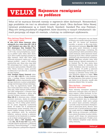 NOWOŚCI RYNKOWE Najnowsze rozwiązania na poddasze Velux od lat wyznacza kierunek rozwoju w segmencie okien dachowych. Nowatorskość jego produktów nie traci na aktualności nawet po latach. Okna dachowe Velux Nowej Generacji produkowane są w trzech liniach: Standard, Standard Plus oraz Premium. Mają one szereg przydatnych udogodnień, które docenimy w naszych mieszkaniach i domach poczynając od etapu ich montażu, a kończąc na codziennym użytkowaniu. Okna dachowe Nowej Generacji – pięć nowych typów wanym EPS o izolacyjności trzy razy lepszej od drewna oraz wysoko izolacyjnym tworzywem PET. Ich atutem jest dodatkowa uszczelka, co sprawia, że okna mają doskonałe właściwości izolacyjne. Okna GLL i GLU mają górny system otwierania w postaci uchwytu zintegrowanego z wentylacją. Dla wyżej położonych okien przewidziano dolny system otwierania. Dolne otwieranie charakteryzuje typ GLL B. Okna z dolnym systemem otwierania mają dwustopniową wentylację. Modele GLU mają wszystkie zalety okien Nowej Generacji z górnym otwieraniem z linii Standard Plus. Do okna można łatwo domontować klamkę do otwierania okna u dołu. Dodatkowo okna GLU wyróżnia wyjątkowa trwałość. Ich profile są wykonane z drewna modyfikowanego termicznie, a pokrywający je poliuretan tworzy trwałą warstwę wierzchnią odporną na wilgoć. Okna GLL, GLL B oraz GLU zostały wyposażone w szybę bezpieczną, która sprawia, że nawet gdy dojdzie do jej stłuczenia, kawałki szkła pozostaną sklejone folią i nie spadną. W roku 2014 Nowa Generacja okien wzbogaciła się o nowe okna GZL i GZL B z linii Standard oraz okna GLL, GLL B, GLU obejmujące linię Standard Plus. Wraz z linią Premium, która zadebiutowała w 2013 roku, tworzą kompleksową, najszerszą na polskim rynku ofertę okien dachowych, która w pełni zaspokaja potrzeby każdego inwestora. Nowe okna Velux mają doskonałą izolacyjność cieplną oraz – dzięki węższym profilom – nawet o 10% większą powierzchnię szyb. Nowe okna mają także filtr zatrzymujący kurz i owady, co gwarantuje zawsze czyste powietrze. Wszystkie okna Velux Nowej Generacji można przerobić na elektryczne w tym okno GZL, co wcześniej nie było możliwe. Linia Standard Nowej Generacji okien, czyli okna GZL i GZL B to okna produkowane z trwałego drewna laminowanego. Model GZL wyróżnia niepowtarzalny system górnego otwierania w postaci przeprojektowanego aluminiowego uchwytu otwierającego, który ma ergonomiczny kształt, żeby okno można było łatwo otworzyć i zamknąć jedną ręką. Dzięki węższym profilom okiennym także zintegrowana z uchwytem klapa wentylacyjna, wbudowana w górną ramę okna jest mniejsza i prostsza w obsłudze. Okna GZL B to drewniane okna z dolnym systemem otwierania, idealne do montażu we wnętrzach z wysoką ścianką kolankową, mającą np. 150 cm. Dolny system otwierania ma postać eleganckiej ocynkowanej klamki. W modelu GZL B zainstalowano dwustopniowy system wentylacji, który zapewnia dopływ świeżego powietrza nawet przy zamkniętym oknie. By swobodnie oddychać, wystarczy nacisnąć w zależności od potrzeb raz lub dwukrotnie na znajdującą się na klapie wentylacyjnej ikonę. Wszystkie okna z linii Standard Plus, a więc GLL, GLL B oraz GLU mają profile i skrzydło okienne zbudowane w unikatowej konstrukcji ThermoTechnologyTM, w której drewno połączono z polistyrenem ekspando- Okna dachowe – innowacyjne akcesoria montażowe Nowe elementy montażowe poprawiają właściwości izolacyjne okien oraz służą estetyce wnętrza i połaci dachowej. Są również łatwiejsze do zamontowania, co z pewnością ucieszy dekarzy. Nowy kołnierz EDJ umożliwia osadzenie okna na obniżonym o 4v cm poziomie, dzięki czemu zyskuje ono jeszcze lepsze parametry izolacyjne, a ponadto zostaje harmonijnie wkomponowane w płaszczyznę dachu. Nowość, która pozwoli nam w sposób perfekcyjny wykończyć wnękę okienną to stelaż wnęki okna LSG. Tworzy go innowacyjna, prefabrykowana stalowa konstrukcja w postaci teleskopowych profili służąca do zamontowania płyt kartonowo-gipsowych. Produkt umożliwia dokładne ocieplenie wnęki okiennej wełną mineralną. Velux.pl nr 3/2014 www.glospsb.com.pl 11