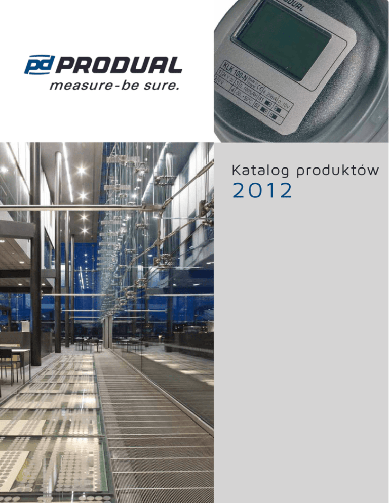 Katalog produktów 201 2 P R O D UA L l 1 l K atalo g produk t ó w Produal Oy – jesteśmy na rynku od 25 lat! 1987 - 2012 Gruntowne doświadczenie w zakresie pomiarów i automatyki budynków. 25 lat temu cztery osoby założyły firmę, która miała pomagać rozwiązywać problemy związane z automatyką budynków. Wkrótce, dzięki doskonałej obsłudze klienta i szybkiemu znajdowaniu nowych rozwiązań spełniających potrzeby klientów marka Produal zaczęła być znana i rozpoznawana. Wielki trud i ogrom pracy włożony w rozwój produktów i kompleksowych rozwiązań oraz niezwykłe zaangażowanie pracowników był inwestycją długoterminową. To samo podejście doskonale funkcjonuje w firmie Produal i dzisiaj. Naszym przepisem na sukces jest uważne wsłuchiwanie się w potrzeby naszych Klientów oraz solidna praca nad dalszym rozwojem produktów. Oferujemy różnorodne i kompleksowe rozwiązania w zakresie wszystkich pomiarów w automatyce HVAC. Pomagamy naszym Klientom w doborze odpowiednich urządzeń spełniających ich różnorodne potrzeby; dostarczamy także urządzenia produkowane na specjalne zamówienie. Urządzenia Produal pracujące w instalacjach budynkowych, zapewniają przyjemne i beztroskie warunki pracy i odpoczynku dbając jednocześnie o środowisko, poprzez zmniejszenie emisji dwutlenku węgla i zużycia energii. I ten sukces trwa… Dzisiaj, 64 ekspertów firmy Produal obsługuje Klientów nie tylko w Finlandii, ale w całej Europie. Poniższa lista zawiera jedynie najważniejsze cechy naszych produktów. Ich kompletna lista, szczegóły techniczne oraz ceny są zamieszczone na naszej stronie internetowej: http://www.produal.com/PL/Produkty Źródło i prawa autorskie zdjęć na okładce i na tej stronie: Helsinki Music Centre / Arno Chapelle. P R O D UA L l 2 l K atalo g produk t ó w SPIS TREŚCI AKTYWNE TERMOSTATY PRZECIWZAMROŻENIOWE - 4 1 TERMOSTAT WYSOKEJ TEMPERATURY - 4 2 TERMOSTATY ELEKTRONICZNE - 5 3 PRZETWORNIKI - 7–17 4 przetworniki przepływu powietrza 7 I różnicowe przetworniki ciśnienia powietrza 8–9 I przetwornik objętości powietrza ze sterownikiem 9 I przetworniki wilgotności temperatury 11–12 I przetworniki natężenia oświetlenia 13 I czujniki natężenia oświetlenia 13 I różnicowe przetworniki ciśnienia wody 14 I przetworniki ciśnienia wody 14 I przetworniki CO2 15–16 I przetworniki CO 16 I czujnik prędkości wiatru 17 I czujnik deszczu 17 REGULATOR MOCY ELEKTRYCZNEJ - 17–18 5 6 REGULATORY TEMPERATURY - 18–22 7 STEROWNIKI UNIWERSALNE - 23 8 CZUJNIKI TEMPERATURY - 26–37 woda, ogrzewanie/chłodzenie 26 I woda 27 I dla termostatów przeciwzamrożeniowych/ciepła woda użytkowa 28 I przylgowe 29–30 I kanałowe 30–32 I na luźnym przewodzie 32 I ogrzewanie podłogowe 33 I gruntowe 33 I spalin 34 I pomieszczeniowe 34–36 I zewnętrzne 36–37 I czujniki z IP67 37 I przetworniki temperatury 38 9 KONWERTERY I AKCESORIA - 38–48 moduły we-wy 38 I konwertery 38–41 I transformatory 42 I czujniki obecności 43–44 wyłączniki czasowe 45 I przyciski niskonapięciowe 46 I sygnalizatory diodowe 46 I przekaźniki 46–47 I przekaźniki i czujniki wycieku wody 48 I 10 TRANSMISJA BEZPRZEWODOWA - 50–54 TERMOMETRY MECHANICZNE, PRESOSTATY, ZAWORY I SIŁOWNIKI - 54–55 termometry mechaniczne 54 siłowniki termiczne 55 I presostaty różnicowe powietrza 54 I zawory strefowe 55 I 11 WARUNKI DOSTAW - 56–57 12 CHARAKTERYSTYKI CZUJNIKÓW TEMPERATURY - 58 13 INDEKS PRODUKTÓW - 59 14 Firma Produal Oy zastrzega prawo do zmiany specyfikacji technicznej bez uprzedzenia. P R O D UA L l 3 l K atalo g produk t ó w AKTYWNE TERMOSTATY PRZECIWZAMROŻENIOWE 1 2 JVA 24 i JVS24 to aktywne termostaty przeciwzamrożeniowe, zabezpieczające nagrzewnice central klimatyzacyjnych przed zamarznięciem. zasilanie 24 Vac/dc, 2 VA zakres pomiarowy 0…100 °C = 0…10 V wyjście stykowe 230 Vac, 10 A res. alarmowe wyjście stykowe 60 Vdc, 1 A do montażu na szynę DIN sygnały: wejściowe / wyjściowe 0…10 Vdc, 10 mA obudowa IP 20, montaż na szynę DIN 35mm Typ Nr katalogowy JVA 24 1110110 prognozowanie, regulacja; typ czujnika do wyboru: PT 1000, Ni1000-LG, PTC 1000/2000 JVS 24 1110120 konfigurowane prognozowanie, regulacja; typ czujnika do wyboru: PT 1000, Ni1000-LG, PTC 1000/2000 AKTYWNE TERMOSTATY PRZECIWZAMROŻENIOWE EJV 24 i JV 24 to aktywne termostaty przeciwzamrożeniowe, zabezpieczające nagrzewnice central klimatyzacyjnych przed zamarznięciem. zasilanie 24 Vac, 2 VA zakres pomiarowy 0…100 °C = 0…10 V, 10 mA wyjście stykowe , AR 1 230 Vac, 10 A gniazdo 11-stykowe na szynę DIN alarmowe wyjście stykowe 60 Vdc, 1 A sygnały: wejściowe / wyjściowe0(2)…10 V, 10 mA obudowa IP20; z gniazdem 11-stykowym do montażu na szynę DIN 35 mm Uwaga! Przekaźnik AR 1 jest dostarczany w komplecie z EJV24-PT. Typ Nr katalogowy EJV 24-PT 1110080 współpracuje z czujnikiem PT 1000 (1000 Ω / 0 °C) JV 24-PT 1110090 współpracuje z czujnikiem PT 1000 (1000 Ω / 0 °C), wyjście stykowe 50 Vac 6 A res. TERMOSTAT WYSOKEJ TEMPERATURY PVA 24 to urządzenie monitorujące temperaturę w kanałach do montażu na szynę DIN wentylacyjnych i centralach klimatyzacyjnych. Przekroczenie ustawionego progu temperatury włącza alarm – sygnalizacjęa pożaru. zasilanie 24 Vac/dc, 2 VA zakres pomiarowy 0…100 °C = 0…10 V wyjście stykowe 230 Vac, 10 A alarmowe wyjście stykowe 60 Vdc, 1 A obudowa IP 20, montaż na szynę DIN 35mm Typ Nr katalogowy PVA 24 1110180 typ czujnika do wyboru: PT 1000, Ni1000-LG, PTC 1000/2000 P R O D UA L l 4 l K atalo g produk t ó w TERMOSTATY ELEKTRONICZNE LK 24-PT to termostaty elektroniczne z wejściem na zewnętrzny czujnik temperatury PT 1000. zasilanie 24 Vac/dc, 2 VA zakres pomiarowy -30…+30 °C lub 0…+100 °C wejście dla czujnika o charakterystyce PT 1000 gniazdo 11-stykowe na szynę DIN, °C (1000 Ω / 0 °C) wyjście 1 zestyk przełączny, 230 V, 5 A res., poprzez dodatkowy przekaźnik AR 1: 230 Vac, 10 A
