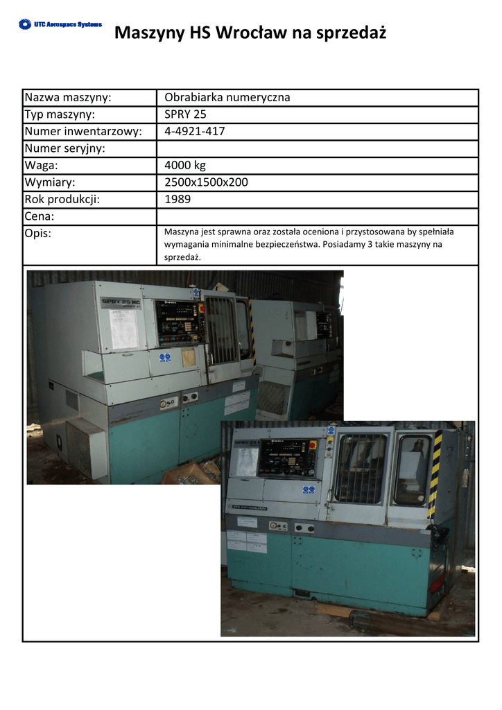 Maszyny HS Wrocław na sprzedaż Nazwa maszyny: Typ maszyny: Numer inwentarzowy: Numer seryjny: Waga: Wymiary: Rok produkcji: Cena: Opis: Obrabiarka numeryczna SPRY 25 4-4921-417 4000 kg 2500x1500x200 1989 Maszyna jest sprawna oraz została oceniona i przystosowana by spełniała wymagania minimalne bezpieczeństwa. Posiadamy 3 takie maszyny na sprzedaż.
