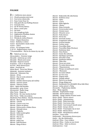 POLSKIE 2+1 - California mon amour 2+1 - Chodź pomaluj mój świat 2+1 - Czerwone słoneczko 2+1 - Easy Come Easy Go 2+1 - Gdy grali dla nas Rolling Stonesi 2+1 - Gwiazda dnia 2+1 - Iść W Stronę Słońca 2+1 - Masz u mnie plus 2+1 - Na luzie 2+1 - Nie zmogła go kula 2+1 - Odpłyniesz Wielkim Autem 2+1 - Windą do nieba 2+1 - Windą do nieba (Dance) 4 Ever - Głupie kłamstwa 4 Ever - Kobiety w złości 4 Ever - Kochanków miała wielu 4 Ever – Tańcz 4 Ever - To następna laska 5 10 15 - Najłatwiejsze ciasto 7 Krasnoludków - Hej ho do domu by się szło A2 - Takich już nie ma Abracadabra - Ostatnie tango Abradab - Jedziemy po zioło Abradab - Miasto jest nasze Abradab - Rapowe ziarno Acapulco - Lato w Acapulco Accord - Moja dziewczyna Adam - Powiedz mi Adam Band - Teraz Jest Wojna Adamiak - Jesienna zaduma Adanczak - Zakazane Sny Adonis - 20 lat Adonis - Daj mi swój uśmiech Adonis - Moja miła Adonis - Polskie dziewczyny jak maliny Adonis - Zawsze razem Adonis - Zabiorę Ciebie Afers - Agata daj buziaka Afromental - pray 4 love Afromental - Radio Song After Party - Bujaj się After Party - Ile razy można kochać After Party - Tylko ona jedyna Akademia Pana Kleksa - Kaczka Dziwaczka Akcent - Biorę urlop od Ciebie Akcent – Chwile Akcent - Czarne oczy twe Akcent - Dajcie mi gitarę Akcent - Dziewczyna z klubu Disco Akcent - Dźwięki strun Akcent – Figlarka Akcent - Gdzie jesteś gdzie Akcent – Gwiazda Akcent - Hej na na Akcent – Iwona Akcent - Jedna noc Akcent - Jeśli Kochasz Akcent - King of disco Akcent - Kołysanka dla ukochanej Akcent - Królowa nocy Akcent – Kylie Akcent – Laura Akcent - Mała figlarka Akcent – Mamo Akcent - Moja Gwiazda Akcent - Oczarowałaś mnie Akcent - Ostatni most Akcent - Otwarte serce Akcent - Pada deszcz Akcent - Peron łez Akcent - Powiedz mamo Akcent - Pragnienie miłości Akcent - Przytul śmiało Akcent - Psotny wiatr Akcent - Pszczółka Maja Akcent - Pszczółka Maja (Techno) Akcent - Rodzinny dom Akcent - Siwy Koniu Akcent - Sonet dla miłości Akcent - Spadająca gwiazda Akcent - Straciłaś cnotę Akcent - Symfonia miłości Akcent - Tabu tibu Akcent - Teraz już wiem Akcent - To moja dziewczyna Akcent – Wspomnienie Akcent - Wyspa szczęśliwych snów Akcent – Wyznanie Akcent - Za nami miłość Akcent - Za twe oczy Akcent - Żegnaj mała Akcent - Znajdę miłość Akcent - Życie to są chwile Akurat - Droga długa jest Akurat - Dyskoteka Gra (DJ QiDD 4Fun Edit Mix) Akurat - Lubię mówić z Tobą Alexandra - Popłyniemy daleko Alias - Moja cyganka Alibabki - Kapitańskie tango Alibabki - Kwiat jednej nocy Alibabki - Tango zalotne Przeleć mnie Alicja i Rafał - Amore amore Alicja i Rafał – Astamaniana Alicja i Rafał - Biała konwalia Alicja i Rafał - Czerwone róże Alicja i Rafał - Czerwonych korali sznur Alicja i Rafał - Gorące słowa Alicja i Rafał - Trzymajmy się za ręce Alicja i Rafał - Marija Elena Alicja i Rafał - Niespełniona miłość Amadeo - Letni wiatr Ambasador - Nieznajoma dziewczyna Andre - Ale Ale Aleksandra Andrzej i Eliza - Czas relaksu Andrzej i Eliza - Czeka na nas świat Andrzej i Eliza - Idzie na deszcz Andrzejewicz – Cud Andrzejewicz – Lustro Andrzejewicz - Nieśmiały chłopak Andrzejewicz – Piękno Andrzejewicz - Pozwól żyć Andrzejewicz – Słowa Andrzejewicz - Trochę ciepła Andrzejewicz - You can dance Andy i Lucia - Pokoża Wom Heimat Ani Mru Mru - Daj mi tekst Ani Mru Mru - Go go go Anioł - Dobry Pasterz Anioł – Lolek Anioł - Ramiona szeroko otwarte Anioł - Zaufaj Panu już dziś Antkowiak - Przyjaciel wie Antkowiak - Zakazany owoc Arka Noego - A Gu Gu Arka Noego – Barka Arka Noego - Chciałem Dobrze Arka Noego - Daj na zgodę Arka Noego - Dlaczego dzisiaj Arka Noego - Dobre Dobre Bardzo Dobre Arka Noego - Gore gwiazda Jezusowi (Pastorałka) Arka Noego - Ja jestem Arka Noego - Ja Nie Umieram Arka Noego - Jeden Dzień w roku Arka Noego - Na Drugi Brzeg Arka Noego - Najlepsza Modlitwa Na Świecie Arka Noego - Nie Boję Się Arka Noego - Niedola Egipska Niewola Arka Noego - Nowe Przykazanie Arka Noego - Osiem Błogosławieństw Arka Noego - Stary Abraham Arka Noego - Staś i Nel Arka Noego - Święty uśmiechnięty Arka Noego - Ta piosenka jest dla mamy Arka Noego - Taki duży, taki mały Arka Noego - Taki duży, taki mały (parodia) Arka Noego - Ubogi na duchu jest błogosławiony Arka Noego - Uwielbiam Cię Arka Noego - Weź Mnie Na Ręce Arka Noego - Zwycięzca Śmierci Armia – Niezwyciężony Armia - To moja zemsta Art Cafe - Morskie Opowieści Arsenium - Love Me Love Me As - Było mi źle As - Czerwona kalina As - Na zamku As - Szkoda łez Ascetoholix – Suczki Astor – Ciężarówa Atlantis - Nie Jesteś Moja Avanti - Dwa jabłuszka Avista - Białe róże Avista - Płatek róży AYA RL – Skóra Aya RL - Skóra (dance) B.A.R – Gołymbiorze B.A.R. - Mama zawsze blisko jest B.A.R - Te nasze dzieci B.F.C. - Zostań ze mną tu Baba z Chopym – Country Baciary - Baciar, ja se Baciar Baciary - Chłopiec sportowiec Baciary - Do widzenia żegnaj miła Baciary - Gdy do wojska ruszałem Baciary - Hej Kawalerowie Baciary - Jak się bawią ludzie Baciary – Lato Baciary - Nie lubię swojej roboty Baciary - O Królowo Baciary - Oczy zielone Baciary – Pożegnanie Baciary - Wielkie kochanie Baciary - Wódko ma Baciary - Winda do raju Baciary - Zostań tu ze mną na zawsze Baciary - Żyje się raz Badach - Gdyby Nie Ty Badach i Szarmach - Zanim się spotkają Bahamas - A ja wolę moją Olę Bahamas - Czas rozłąki Bahamas – Gwiazdeczka Bahamas - Kocham was panienki Bahamas - Nie wierzcie dziewczyny Bahamas - Pluszowy miś Bahamas - Pozwól mi się pocałować Bajeranty - 7 czerwonych Róż Bajm - Biała Armia Bajm - Być z tobą Bajm - Co mi Panie dasz Bajm - Dwa serca dwa smutki Bajm - Dziesięć Przykazań Bajm - Ile jesteś wart Bajm – Ja Bajm - Józek nie daruję ci tej nocy Bajm - Już bez ciebie Bajm - Krótka historia Bajm - Lato jak ze snu Bajm