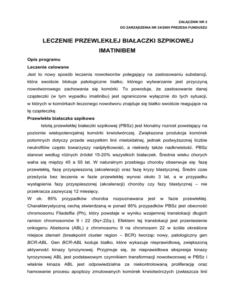 ZAŁĄCZNIK NR 2 DO ZARZĄDZENIA NR 24/2005 PREZESA FUNDUSZU LECZENIE PRZEWLEKŁEJ BIAŁACZKI SZPIKOWEJ IMATINIBEM Opis programu Leczenie celowane Jest to nowy sposób leczenia nowotworów polegający na zastosowaniu substancji, która swoiście blokuje patologiczne białko, którego wytwarzanie jest przyczyną nowotworowego zachowania się komórki. To powoduje, że zastosowanie danej cząsteczki (w tym wypadku imatinibu) jest ograniczone wyłącznie do tych sytuacji, w których w komórkach leczonego nowotworu znajduje się białko swoiście reagujące na tę cząsteczkę. Przewlekła białaczka szpikowa Istotą przewlekłej białaczki szpikowej (PBSz) jest klonalny rozrost powstający na poziomie wielopotencjalnej komórki krwiotwórczej. Zwiększona produkcja komórek potomnych dotyczy przede wszystkim linii mieloidalnej, jednak podwyższonej liczbie neutrofilów często towarzyszy nadpłytkowość, a niekiedy także nadkrwistość. PBSz stanowi według różnych źródeł 15-20% wszystkich białaczek. Średnia wieku chorych waha się między 45 a 55 lat. W naturalnym przebiegu choroby obserwuje się: fazę przewlekłą, fazę przyspieszoną (akceleracji) oraz fazę kryzy blastycznej. Średni czas przeżycia bez leczenia w fazie przewlekłej wynosi około 3 lat, a w przypadku wystąpienia fazy przyspieszonej (akceleracji) choroby czy fazy blastycznej – nie przekracza zazwyczaj 12 miesięcy. W ok. 85% przypadków choroba rozpoznawana jest w fazie przewlekłej. Charakterystyczną cechą stwierdzaną w ponad 95% przypadków PBSz jest obecność chromosomu Filadelfia (Ph), który powstaje w wyniku wzajemnej translokacji długich ramion chromosomów 9 i 22 (9q+;22q-). Efektem tej translokacji jest przeniesienie onkogenu Abelsona (ABL) z chromosomu 9 na chromosom 22 w ściśle określone miejsce złamań (breakpoint cluster region – BCR) tworząc nowy, patologiczny gen BCR-ABL. Gen BCR-ABL koduje białko, które wykazuje nieprawidłową, zwiększoną aktywność kinazy tyrozynowej. Przyjmuje się, że nieprawidłowa ekspresja kinazy tyrozynowej ABL jest podstawowym czynnikiem transformacji nowotworowej w PBSz i właśnie kinaza ABL jest odpowiedzialna za niekontrolowaną proliferację oraz hamowanie procesu apoptozy zmutowanych komórek krwiotwórczych (zwłaszcza linii granulocytarnej). Faza kryzy blastycznej odpowiada ostrej białaczce i jest leczona, jak ostra białaczka, co nie jest przedmiotem tego programu. Jedyną metodą umożliwiającą wyleczenie PBSz jest przeszczepienie allogenicznego szpiku, które stosuje się obecnie w tej chorobie jako leczenie pierwszorzutowe w fazie przewlekłej u osób posiadających rodzinnego dawcę szpiku do 45 roku życia, a u osób, dla których udaje się znaleźć niespokrewnionego dawcę szpiku do 35 roku życia. To wyleczenie uzyskuje się u 50-70% chorych. W innych fazach choroby leczenie to (w zależności od stanu chorego) bywa stosowane do 60 roku życia z wykorzystaniem dawców rodzinnych i do 50 roku życia z wykorzystaniem dawców niespokrewnionych. Jednakże, wyniki lecznicze oraz liczba powikłań po przeszczepieniu szpiku wykonanym w późniejszym okresie choroby są znacznie gorsze niż w ciągu roku od jej rozpoznania. Wyleczenie uzyskuje się u 10-30% chorych. Dla chorych w fazie przewlekłej, którzy albo są starsi niż wspomniano, albo nie mają żadnego dawcy szpiku albo wreszcie mają przeciwwskazania do wykonania zabiegu dostępne są obecnie trzy metody farmakologiczne, z których pierwsza (hydroksykarbamid) umożliwia średnie przeżycie 3 lat (a więc nie wydłuża przeżycia, ale poprawia jego komfort), druga (interferon) umożliwia średnie przeżycie 5 lat, a trzecia (imatinib) umożliwia średnie przeżycie, co najmniej 10 lat, jeśli jest zastosowana jako leczenie pierwszorzutowe. Imatinib Imatinib jest przedstawicielem nowej grupy leków przeciwnowotworowych – oddziałujących na zaburzenia na poziomie molekularnym, którym przypisuje się istotny udział w patogenezie nowotworu. Imatinib konkurencyjnie blokuje miejsce wiązania ATP kinaz tyrozynowych (w tym kinazy kodowanej przez BCR-ABL, lecz także c-KIT i PDGF), co w konsekwencji prowadzi do zahamowania fosforylacji białek biorących udział w przekazywaniu sygnałów komórkowych. Imatinib powoduje zahamowanie proliferacji oraz apoptozę komórek hematopoetycznych, które wykazują ekspresję BCRABL. Na ogół nie wpływa istotnie na prawidłowe krwiotworzenie. Wyniki badań klinicznych dowodzą, że preparat powoduje u znacznej większości chorych remisję hematologiczną, a następnie cytogenetyczną, a u niektórych również remisję molekularną. Najlepsze efekty uzyskuje się u chorych w fazie przewlekłej PBSz, pierwotnie leczonych imatinibem, gorsze u chorych wcześniej leczonych innymi lekami, a jeszcze gorsze u chorych w fazie przyspieszonej. Imatinib jest też z dobrym skutkiem stosowany u chorych, u których PBSz nawróciła po przeszczepieniu szpiku (około 20% chorych w ten sposób leczonych). Dla uzyskania i podtrzymania efektu lek wymaga ciągłego stosowania tak długo, dopóki nie rozwinie się oporność. Jeżeli lek w ciągu 3 miesięcy stosowania nie spowoduje remisji hematologicznej, a w ciągu 6 miesięcy stosowania nie spowoduje remisji cytogenetycznej mniejszej, (co najmniej 35% metafaz bez chromosomu Filadelfia) istnieją znikome szanse na jego dalszą skuteczność i bardzo duże ryzyko rozwoju całkowitej oporności na lek. Podobnie utrata wcześniej uzyskanej remisji hematologicznej, cytogenetycznej lub pojawienie się nowych aberracji chromosomalnych są dowodami na pojawienie się oporności na lek i wskazaniem do zaprzestania jego stosowania. W Polsce Imatinib został pierwotnie zarejestrowany ze wskazaniem do leczenia chorych dorosłych z PBSz z chromosomem Filadelfia, w fazie przewlekłej, gdy leczenie interferonem alfa jest nieskuteczne lub w fazie akceleracji choroby, a także w przebiegu przełomu blastycznego, a nast