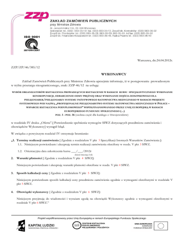 Warszawa, dn.24.04.2012r. ZZP/ZP/46/385/12 WYKONAWCY Zakład Zamówień Publicznych przy Ministrze Zdrowia uprzejmie informuje, iż w postępowaniu prowadzonym w trybie przetargu nieograniczonego, znak: ZZP-46/12 na usługę: WYBÓR ORGANIZATORÓW KSZTAŁCENIA PROWADZĄCYCH KSZTAŁCENIE W RAMACH KURSU SPECJALISTYCZNEGO WYKONANIE KONIKOPUNKCJI, ODBARCZENIE ODMY PRĘŻNEJ ORAZ WYKONANIE DOJŚCIA DOSZPIKOWEGO DLA PIELĘGNIAREK/PIELĘGNIARZY SYSTEMU PAŃSTWOWEGO RATOWNICTWA MEDYCZNEGO W RAMACH PROJEKTU SYSTEMOWEGO POD NAZWĄ „PROFESJONALNE PIELĘGNIARSTWO SYSTEMU RATOWNICTWA MEDYCZNEGO W POLSCE – WSPARCIE KSZTAŁCENIA PODYPLOMOWEGO” WSPÓŁFINANSOWANEGO PRZEZ UNIĘ EUROPEJSKĄ W RAMACH EUROPEJSKIEGO FUNDUSZU SPOŁECZNEGO (...) POZ. 1 - POZ. 16 (osobna część dla każdego z 16województw) w rozdziale IV druku „Oferta”.[ Potwierdzenie spełnienia wymogów SIWZ dotyczących przedmiotu zamówienia i obowiązków Wykonawcy] wystąpił błąd. W związku z powyższym rozdział IV otrzymuje brzmienie: „1. Terminy realizacji zamówienia [ Zgodnie z rozdziałem V pkt 3 Specyfikacji Istotnych Warunków Zamówienia ]: 1.1. Niniejszym potwierdzam i akceptuję termin realizacji zamówienia określony w rozdz. V pkt 3 SIWZ. 1.2. Orientacyjna data zakończenia kursu ___/___/2012r dzień/miesiąc/rok 2. Warunki płatności [ Zgodnie z rozdziałem V pkt 4 SIWZ]: Niniejszym potwierdzam i akceptuję warunki płatności określone w rozdz. V pkt 4 SIWZ. 3. Sposób kalkulacji ceny [ Zgodnie z rozdziałem V pkt 5 SIWZ]: Niniejszym potwierdzam sposób kalkulacji ceny przedmiotu zamówienia zgodnie z wymogami określonymi w rozdziale V pkt 5 SIWZ. 4. Obowiązki wykonawcy [ Zgodnie z rozdziałem V pkt 6 SIWZ]: Niniejszym przyjmuję do wiadomości i wyrażam zgodę na obowiązki Wykonawcy zgodnie z wymogami określonymi w rozdziale V pkt 6 SIWZ.” Projekt współfinansowany przez Unię Europejską w ramach Europejskiego Funduszu Społecznego CENTRUM KSZTAŁCENIA PODYPLOMOWEGO PIELĘGNIAREK I POŁOŻNYCH