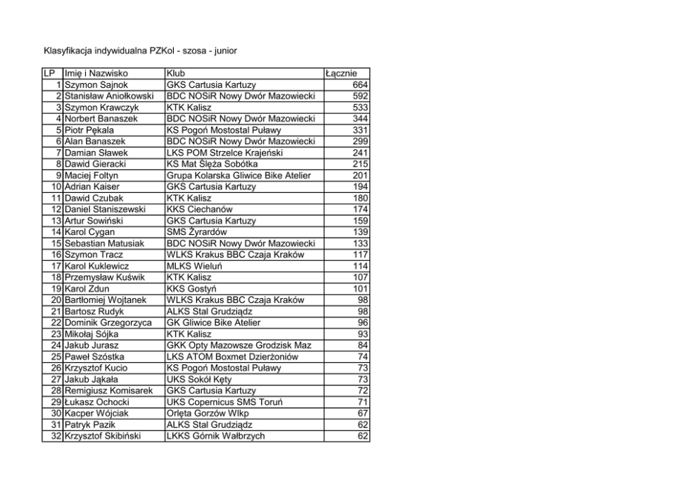 Klasyfikacja indywidualna PZKol - szosa - junior LP 1 2 3 4 5 6 7 8 9 10 11 12 13 14 15 16 17 18 19 20 21 22 23 24 25 26 27 28 29 30 31 32 Imię i Nazwisko Szymon Sajnok Stanisław Aniołkowski Szymon Krawczyk Norbert Banaszek Piotr Pękala Alan Banaszek Damian Sławek Dawid Gieracki Maciej Foltyn Adrian Kaiser Dawid Czubak Daniel Staniszewski Artur Sowiński Karol Cygan Sebastian Matusiak Szymon Tracz Karol Kuklewicz Przemysław Kuświk Karol Zdun Bartłomiej Wojtanek Bartosz Rudyk Dominik Grzegorzyca Mikołaj Sójka Jakub Jurasz Paweł Szóstka Krzysztof Kucio Jakub Jąkała Remigiusz Komisarek Łukasz Ochocki Kacper Wójciak Patryk Pazik Krzysztof Skibiński Klub GKS Cartusia Kartuzy BDC NOSiR Nowy Dwór Mazowiecki KTK Kalisz BDC NOSiR Nowy Dwór Mazowiecki KS Pogoń Mostostal Puławy BDC NOSiR Nowy Dwór Mazowiecki LKS POM Strzelce Krajeński KS Mat Ślęża Sobótka Grupa Kolarska Gliwice Bike Atelier GKS Cartusia Kartuzy KTK Kalisz KKS Ciechanów GKS Cartusia Kartuzy SMS Żyrardów BDC NOSiR Nowy Dwór Mazowiecki WLKS Krakus BBC Czaja Kraków MLKS Wieluń KTK Kalisz KKS Gostyń WLKS Krakus BBC Czaja Kraków ALKS Stal Grudziądz GK Gliwice Bike Atelier KTK Kalisz GKK Opty Mazowsze Grodzisk Maz LKS ATOM Boxmet Dzierżoniów KS Pogoń Mostostal Puławy UKS Sokół Kęty GKS Cartusia Kartuzy UKS Copernicus SMS Toruń Orlęta Gorzów Wlkp ALKS Stal Grudziądz LKKS Górnik Wałbrzych Łącznie 664 592 533 344 331 299 241 215 201 194 180 174 159 139 133 117 114 107 101 98 98 96 93 84 74 73 73 72 71 67 62 62 33 34 35 36 37 38 39 40 41 42 43 44 45 46 47 48 49 50 51 52 53 54 55 56 57 58 59 60 61 62 63 64 65 66 67 Adrian Brzozowski Paweł Kostrubski Erwin Misztela Sebastian Konofał Adam Smoliński Jakub Murias Michał Nowak Michał Stefanek Piotr Michalski Dawid Pauliński Damian Wsół Kamil Indeka Krystian Ragus Bartłomiej Rajch Filip Deja Adrian Walecki Michał Szymański Patryk Karaś Mateusz Pachucki Jakub Kabaciński Michał Małecki Jacek Tarasiuk Dawid Chudek Sebastian Okuniewski Mikołaj Adamski Przemysław Kaczmarek Cezary Szytniewski Piotr Pawłowski Maciej Pojawa Artur Kordus Szymon Jąkała Sebastian Grabis Bartosz Molenda Łukasz Krasiński Maciej Sęga UKS Copernicus SMS Toruń LKK WARMIA Biskupiec LKS Lityński Bełchatów WKK Warszawa KKS Ciechanów CWKS Resovia Rzeszów Górnik DSR Wałbrzych Unipol Częstochowa ALKS Stal Grudziądz LSKK Lityński Bełchatów DEK Meble Cyclo Korona Kielce UKS Gimnazjum Twoja Merida Imielin BDC NOSiR Nowy Dwór Mazowiecki UKS Copernicus SMS Toruń KS Pogoń Mostostal Puławy UKS Copernicus SMS Toruń UKS Copernicus SMS Toruń ALKS Stal Grudziądz LKK WARMIA Biskupiec Mayday Team Start Lublin KK Tarnovia Tarnowo Podgórne Mayday Team Start Lublin WMKS Olsztyn ALKS Stal Grudziądz Stowarzyszenie 64 UKS Copernicus SMS Toruń ALKS Stal Grudziądz AMP UKS Victoria Radzymin GKS Cartusia Kartuzy KKS Gostyń UKS Sokół Kęty UKS Zagłębie BDC NOSiR Nowy Dwór Mazowiecki Mayday Team Start Lublin Orlęta Gorzów Wlkp 59 59 59 57 52 51 46 44 42 41 39 38 38 35 33 33 31 29 28 27 27 26 24 23 22 22 20 19 19 19 18 18 18 17 17 68 69 70 71 72 73 74 75 76 77 78 79 80 81 82 83 84 85 86 87 88 89 90 91 92 93 94 95 96 97 98 99 100 Dawid Kloc Artur Jatczak Damian Smolczyński Bartosz Biskup Karol Szczepański Kacper Krawczyk Alex Castaldo Adian Mrówka Łukasz Ostaszewski Sylwester Łączkowski Adrian Krupa Konrad Kowalski Łukasz Zawadzki Piotr Wosik Wojciech Miazga Bartosz Winiarski Adrian Górski Dawid Łączkiewicz Tomasz Kuczyński Michał Maksel Kacper Piechaczek Damian Niesłuchowski Kamil Poczta Tobiasz Tończyk Damian Włodarczyk Hubert Kowalczyk Jan Szałajko Piotr Teda Antoni Działowy Jakub Szela Mariusz Perkowski Adrian Klincewicz Piotr Smoliński Uwzględnione imprezy: UKS Gimnazjum Twoja Merida Imielin 17 TC Chrobry Głogów 17 Baszta Golczewo 16 Górnik DSR Wałbrzych 16 KKS Ciechanów 16 LSKK Lityński Bełchatów 16 GK BoGo Szczecin 15 ALKS Stal Grudziądz 14 KKS Ciechanów 12 TKK Pacific Toruń 11 Mayday Team Start Lublin 10 KS Mat Ślęża Sobótka 10 UKS Moto-Agbud Jelcz-Laskowice 9 UKS Sokół Kęty 9 KLKS "Azalia" Brzóza Królewska 7 GKK Opty Mazowsze Grodzisk Maz 7 MGLKS Kwisa Lubań 4 UKS Koźminianka Koźminek 4 UKK Prostki 4 ALKS Stal Grudziądz 4 Dobre Sklepy Rowerowe Author LK UKS Pszczyna 3 Orlęta Gorzów Wlkp 3 KK Tarnovia Tarnowo Podg 2 KTK Kalisz 2 MLKS Wieluń 2 UKS Copernicus SMS Toruń 2 UKS Moto-Agbud Jelcz-Laskowice 2 UKS Sokół Kęty 2 WLKS Krakus BBC Czaja 2 CWKS Resovia Rzeszów 1 LKS Baszta Golczewo 1 LKS POM Strzelce Krajeńskie 1 UKS Stobrawa Kluczbork 1 Dzierżoniów - 11.04 Sobótka -12.04 Puchar Polski - Grudziądz - 18-19.04 Starty zagraniczne - Paryż-Roubaix (1.Ncup) Częstochowa - 25.04 Chrząstowice - 26.04 Kryterium - Żagań - 1.05 "O Puchar Prezydenta Grudziądza" (2.1) - 30.04-3.05 Kryterium - Lubawa - 3.05 Puchar Polski - Gostyń - 9-10.05 Starty zagraniczne - Wyścig Pokoju (2.Ncup) Szlakami Jury - 15-17.05 Poznań-Smochowice - 16.05 Puchar Polski - Strzelce Krajeńskie - 24-25.05 Złote Koło - 29-31.05 Starty Zagraniczne - Trofeo Karlsberg (2.Ncup) Memoriał J.Halupczoka - 6-7.07 Puchar Polski - Koziegłowy - 13-14.06 Wyścig o Puchar Bałtyku - 12-14.06 Puchar Polski - Tarnowo Podgórne - 20-21.06 Mistrzostwa Polski - Sobótka - 24-28.06 IV Memoriał Jerzego Kowalskiego - 5.07 Kryterium o Srebrną Szprychę - Memoriał Zdzislawa Walczaka - 5.07 Kryterium o Puchar Burmistrza Gminy Milicz - 11.07