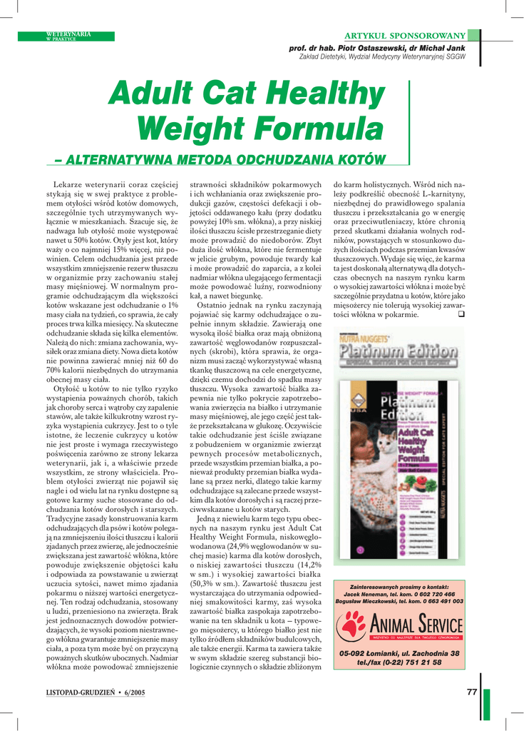 WETERYNARIA ARTYKUŁ SPONSOROWANY prof. dr hab. Piotr Ostaszewski, dr Michał Jank W PRAKTYCE Zakład Dietetyki, Wydział Medycyny Weterynaryjnej SGGW Adult Cat Healthy Weight Formula – ALTERNATYWNA METODA ODCHUDZANIA KOT KOTÓ ÓW Lekarze weterynarii coraz częściej stykają się w swej praktyce z problemem otyłości wśród kotów domowych, szczególnie tych utrzymywanych wyłącznie w mieszkaniach. Szacuje się, że nadwaga lub otyłość może występować nawet u 50% kotów. Otyły jest kot, który waży o co najmniej 15% więcej, niż powinien. Celem odchudzania jest przede wszystkim zmniejszenie rezerw tłuszczu w organizmie przy zachowaniu stałej masy mięśniowej. W normalnym programie odchudzającym dla większości kotów wskazane jest odchudzanie o 1% masy ciała na tydzień, co sprawia, że cały proces trwa kilka miesięcy. Na skuteczne odchudzanie składa się kilka elementów. Należą do nich: zmiana zachowania, wysiłek oraz zmiana diety. Nowa dieta kotów nie powinna zawierać mniej niż 60 do 70% kalorii niezbędnych do utrzymania obecnej masy ciała. Otyłość u kotów to nie tylko ryzyko wystąpienia poważnych chorób, takich jak choroby serca i wątroby czy zapalenie stawów, ale także kilkukrotny wzrost ryzyka wystąpienia cukrzycy. Jest to o tyle istotne, że leczenie cukrzycy u kotów nie jest proste i wymaga rzeczywistego poświęcenia zarówno ze strony lekarza weterynarii, jak i, a właściwie przede wszystkim, ze strony właściciela. Problem otyłości zwierząt nie pojawił się nagle i od wielu lat na rynku dostępne są gotowe karmy suche stosowane do odchudzania kotów dorosłych i starszych. Tradycyjne zasady konstruowania karm odchudzających dla psów i kotów polegają na zmniejszeniu ilości tłuszczu i kalorii zjadanych przez zwierzę, ale jednocześnie zwiększana jest zawartość włókna, które powoduje zwiększenie objętości kału i odpowiada za powstawanie u zwierząt uczucia sytości, nawet mimo zjadania pokarmu o niższej wartości energetycznej. Ten rodzaj odchudzania, stosowany u ludzi, przeniesiono na zwierzęta. Brak jest jednoznacznych dowodów potwierdzających, że wysoki poziom niestrawnego włókna gwarantuje zmniejszenie masy ciała, a poza tym może być on przyczyną poważnych skutków ubocznych. Nadmiar włókna może powodować zmniejszenie LISTOPAD-GRUDZIEŃ • 6/2005 strawności składników pokarmowych i ich wchłaniania oraz zwiększenie produkcji gazów, częstości defekacji i objętości oddawanego kału (przy dodatku powyżej 10% sm. włókna), a przy niskiej ilości tłuszczu ścisłe przestrzeganie diety może prowadzić do niedoborów. Zbyt duża ilość włókna, które nie fermentuje w jelicie grubym, powoduje twardy kał i może prowadzić do zaparcia, a z kolei nadmiar włókna ulegającego fermentacji może powodować luźny, rozwodniony kał, a nawet biegunkę. Ostatnio jednak na rynku zaczynają pojawiać się karmy odchudzające o zupełnie innym składzie. Zawierają one wysoką ilość białka oraz mają obniżoną zawartość węglowodanów rozpuszczalnych (skrobi), która sprawia, że organizm musi zacząć wykorzystywać własną tkankę tłuszczową na cele energetyczne, dzięki czemu dochodzi do spadku masy tłuszczu. Wysoka zawartość białka zapewnia nie tylko pokrycie zapotrzebowania zwierzęcia na białko i utrzymanie masy mięśniowej, ale jego część jest także przekształcana w glukozę. Oczywiście takie odchudzanie jest ściśle związane z pobudzeniem w organizmie zwierząt pewnych procesów metabolicznych, przede wszystkim przemian białka, a ponieważ produkty przemian białka wydalane są przez nerki, dlatego takie karmy odchudzające są zalecane przede wszystkim dla kotów dorosłych i są raczej przeciwwskazane u kotów starych. Jedną z niewielu karm tego typu obecnych na naszym rynku jest Adult Cat Healthy Weight Formula, niskowęglowodanowa (24,9% węglowodanów w suchej masie) karma dla kotów dorosłych, o niskiej zawartości tłuszczu (14,2% w sm.) i wysokiej zawartości białka (50,3% w sm.). Zawartość tłuszczu jest wystarczająca do utrzymania odpowiedniej smakowitości karmy, zaś wysoka zawartość białka zaspokaja zapotrzebowanie na ten składnik u kota – typowego mięsożercy, u którego białko jest nie tylko źródłem składników budulcowych, ale także energii. Karma ta zawiera także w swym składzie szereg substancji biologicznie czynnych o składzie zbliżonym do karm holistycznych. Wśród nich należy podkreślić obecność L-karnityny, niezbędnej do prawidłowego spalania tłuszczu i przekształcania go w energię oraz przeciwutleniaczy, które chronią przed skutkami działania wolnych rodników, powstających w stosunkowo dużych ilościach podczas przemian kwasów tłuszczowych. Wydaje się więc, że karma ta jest doskonałą alternatywą dla dotychczas obecnych na naszym rynku karm o wysokiej zawartości włókna i może być szczególnie przydatna u kotów, które jako mięsożercy nie tolerują wysokiej zawartości włókna w pokarmie. Zainteresowanych prosimy o kontakt: Jacek Neneman, tel. kom. 0 602 720 466 Bogusław Mieczkowski, tel. kom. 0 663 491 003 05-092 Łomianki, ul. Zachodnia 38 tel./fax (0-22) 751 21 58 77