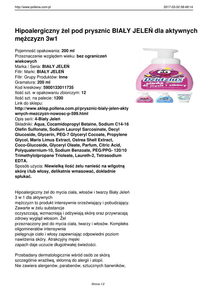 http://www.pollena.com.pl 2017-03-02 08:49:14 Hipoalergiczny żel pod prysznic BIAŁY JELEŃ dla aktywnych mężczyzn 3w1 Pojemność opakowania: 200 ml Przeznaczenie względem wieku: bez ograniczeń wiekowych Marka / Seria: BIAŁY JELEŃ Filtr: Marki: BIAŁY JELEŃ Filtr: Grupy Produktów: Inne Gramatura: 200 ml Kod kreskowy: 5900133011735 Ilość szt. w opakowaniu zbiorczym: 12 Ilość szt. na palecie: 1200 Link do sklepu: http://www.sklep.pollena.com.pl/prysznic-bialy-jelen-akty wnych-mezczyzn-nowosc-p-599.html Opis serii: 4-Biały Jeleń Składniki: Aqua, Cocamidopropyl Betaine, Sodium C14-16 Olefin Sulfonate, Sodium Lauroyl Sarcosinate, Decyl Glucoside, Glycerin, PEG-7 Glyceryl Cocoate, Propylene Glycol, Maris Limus Extract, Ostrea Shell Extract, Coco-Glucoside, Glyceryl Oleate, Parfum, Citric Acid, Polyquaternium-10, Sodium Benzoate, PEG/PPG- 120/10 Trimethylolpropane Trioleate, Laureth-2, Tetrasodium EDTA. Sposób użycia: Niewielką ilość żelu nanieść na wilgotną skórę i/lub włosy, delikatnie wmasować, dokładnie spłukać. Hipoalergiczny żel do mycia ciała, włosów i twarzy Biały Jeleń 3 w 1 dla aktywnych mężczyzn to produkt intensywnie orzeźwiający i pobudzający. Zawarte w żelu substancje oczyszczają, wzmacniają i odżywiają skórę oraz przywracają zdrowy wygląd włosom. Żel przeznaczony jest do mycia ciała, twarzy i włosów. Kompleks oligominerałów intensywnie pielęgnuje ciało i włosy zapewniając odpowiedni poziom nawilżenia skóry. Atrakcyjny męski zapach daje uczucie długotrwałej świeżości. Przebadany dermatologicznie wśród osób ze skórą szczególnie wrażliwą, skłonną do alergii i atopii. Nie zawiera alergenów, parabenów, sztucznych barwników, Strona 1/2 http://www.pollena.com.pl 2017-03-02 08:49:14 SLES-u. Strona 2/2
