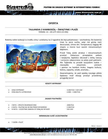 POSTAW NA DALEKIE WYPRAWY W ALTERNATYWNEJ FORMIE! www.discoverasia.com.pl OFERTA TAJLANDIA Z KAMBODŻĄ – ŚWIĄTYNIE I PLAŻE TERMIN: 14 – 28 LUTY 2015 (15 DNI) Robimy sobie wakacje w środku zimy i uciekamy na 2 tygodnie do Azji południowo – wschodniej. Do kwietnia trwa tu pora sucha, więc nie grożą nam deszczowe, zimne dni. Temperatury sięgają 40 stopni, a morze kusi swoim niesamowitym błękitem. Przed Tobą wiele atrakcji i niesamowitych przeżyć. Zobaczysz przepiękne pałace i świątynie, będziesz obcował z dziką naturą i wreszcie odpoczniesz na plaży pod palmami. Ale Tajlandia to przede wszystkim ludzie – niezwykła otwartość, uśmiech i pomoc na każdym kroku, bogata kultura, kolory, zapachy, smaki, aromaty… Gwarantujemy, że pod opieką naszego pilota będziesz miał okazję przeżyć prawdziwą przygodę życia! KOSZTY WYPRAWY • • CENA WYPRAWY CENA BILETU LOTNICZEGO 3.500 PLN + 520 USD 2.000 – 2.800 PLN ZASADY PŁATNOŚCI • • • I RATA – OPŁATA REZERWACYJNA II RATA – PŁATNA NA 30 DNI PRZED WYJAZDEM III RATA – UCZESTNIK ZABIERA ZE SOBĄ NA WYJAZD 1000 PLN 2.500 PLN 520 USD MINIMALNA ILOŚĆ UCZESTNIKÓW • 7 OSÓB + PILOT Oferta – strona 1 Biuro Podróży DiscoverAsia Magdalena Gauer, ul. Bednarska 14/4, 60-571 Poznań, NIP 7792288723 www.discoverasia.com.pl, e-mail: [email protected], tel. 504 502 268 POSTAW NA DALEKIE WYPRAWY W ALTERNATYWNEJ FORMIE! www.discoverasia.com.pl CENA OBEJMUJE • • • • • • • • zakwaterowanie w hotelach o standardzie 2/3* z łazienkami i klimatyzacją śniadania we wszystkich hotelach; lunch podczas wycieczki do Ayutthayi oraz 4x lunch podczas wycieczek z Krabi 3 bilety lotnicze (Siem Reap – Bangkok, Bangkok – Krabi, Krabi – Bangkok)bilet na pociąg nocny sypialny w 2 klasie bilety wstępu do wszystkich atrakcji wymienionych w planie wszystkie transfery busami, taksówkami i łodziami udział we wszystkich wymienionych w planie wycieczkach ubezpieczenie podróżne KL i NNW opiekę polskojęzycznego pilota CENA NIE OBEJMUJE • • • ceny biletu lotniczego na trasie Warszawa – Bangkok – Warszawa (ceny w granicach 2.000 – 2.800 PLN) wycieczek dodatkowych – niezawartych w planie, dodatkowych transferów wyżywienia – z wyjątkiem wymienionego powyżej (ok 180 USD na cały wyjazd) PLAN WYJAZDU Dzień 1 – Spotkanie na lotnisku Okęcie w Warszawie 2 godziny przed odlotem (dla osób, które wykupią zalecany przez Biuro bilet lotniczy). Wylot do Bangkoku – z przesiadką w jednym z portów w Europie bądź Azji. Dzień 8 – Lot do Bangkoku i dalej do prowincji Krabi, nad morze Andamańskie. Przed nami kilkudniowa przygoda wśród tropikalnej roślinności, soczyście zielonych lasów, gorących źródeł, wodospadów i pięknych plaż. Dzień 2 – Przylot do Bangkoku. Czas na odpoczynek lub rejs tramwajem wodnym po rzece Chao Phraya. Wieczór spędzimy na tętniącej życiem ulicy Khao San Road próbując miejscowych przysmaków. Dzień 9 – Czas na Island Hopping – odwiedzimy malownicze wysepki, będziemy pływali w przejrzystej wodzie, nurkowali z rurką, wygrzewali się na przepięknych plażach i podziwiali widoki. Dzień 3 – Spacer przez targ amuletów. Odwiedziny w Pałacu Królewskim, Świątyni Szmaragdowego Buddy oraz Wat Pho – Świątyni leżącego Buddy, a jeśli starczy nam czasu – również w świątyni Wat Arun. Dzień 4 – Zwiedzanie historycznej stolicy kraju – Ayutthayi. Tu poczujemy dawnego ducha kraju i zobaczymy przepiękne zabytki, przede wszystkim ruiny budowli pałacowych i świątynnych. Dzień 5 – Rano wyjazd do Siem Reap w Kambodży, miasteczka w którego pobliżu znajduje się najsłynniejszy kompleks świątynny i perła Imperium Khmerów – Angkor. Dzień 6 – Całodniowe zwiedzanie kompleksu Angkor ukrytego w kambodżańskiej dżungli, m.in. świątynia Bayon, Angkor Wat, Wat Thom i wiele innych. Zachód słońca wśród majestatycznych świątyń. Dzień 7 – Dzisiaj odwiedzimy kambodżańską wioskę oraz jezioro Tonle Sap i z łodzi będziemy mieli okazję podglądać pływające domy na palach i życie mieszkańców na wodzie. Dzień 10 – Wizyta w świątyni Tiger Cave Temple. Następnie zanurzymy się w szmaragdowych wodach Emerald Pool – Szmaragdowego Basenu. A przed nami jeszcze naturalne gorące źródła i wodospady! Dzień 11 – Przed nami największa atrakcja okolicy – wyspa Phi Phi! To tu nagrywany był film „Niebiańska plaża” z Leonardo DiCaprio. Czekają nas tam bajkowe widoki i lazurowa woda dające wyobrażenie raju… Dzień 12 – Dziś popłyniemy na Wyspę Jamesa Bonda! To właśnie tam zostały nagrane sceny z filmu „The men with the golden gun”. Przed nami widoki na ogromne skały, wyrastające prosto z morza! Dzień 13 – Dzisiaj zawitamy do campu pełnego przyjaznych słoni, które chętnie przewiozą nas na swoich grzbietach przez dżunglę, dadzą się nakarmić, a niektórym z Was może uda się nawet wykąpać z nimi w rzece! Dzień 14 – Powrót samolotem do Bangkoku i czas na ostatnie zakupy na Khao San Road lub w kolorowej chińskiej dzielnicy Chinatown. Ostatnia okazja by spróbować tradycyjnego tajskiego masażu. Dzień 15 – Wylot do Polski. Lot z przesiadką w jednym z portów azjatyckich lub europejskich. Zakończenie naszej przygody. Oferta – strona 2 Biuro Podróży DiscoverAsia Magdalena Gauer, ul. Bednarska 14/4, 60-571 Poznań, NIP 7792288723 www.discoverasia.com.pl, e-mail: [email protected], tel. 504 502 268