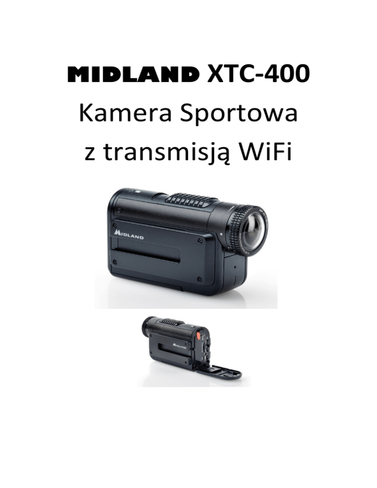 XTC-400 Kamera Sportowa z transmisją WiFi MIDLAND Midland XTX-400 to jedna z najnowocześniejszych na rynku kamer sportowych mogąca rejestrować najbardziej ekstremalne przygody w jakości Full HD, transmitować obraz na urządzenia mobilne w czasie rzeczywistym i wytrzymać zanurzenie do głębokości 85m. Zawartość opakowania • Kamera XTC-400 • Obudowa wodoodporna • Kabel USB/micro USB • Akumulator litowo jonowy • Podstawowy uchwyt przyklejany • Mocowanie mini pająk (10° i 45°) Elementy kamery i sterowania Obrotowa soczewka 170° Mikrofon Dioda nagrywania Szyny mocowania Wejście mikrofonu od spodu Przykładowe opcjonalne mocowania Dane techniczne Rozdzielczość H 1920x1080p 30/25 klatek/sek. L 1280x720p 60/50 klatek/sek. *848x480 120/100 klatek/sek 12 Mp/5 Mp/ 3Mp 16:9 H264 typ pliku MP4 7 elementów (6 szkło hartowane, 1 IRF) Tak 170° zmienny* Do 32 GB Li-Ion 1700 mAh Do 5 h Tak Zdjęcia Proporcje obrazu Format zapisu Soczewki Obrotowy obiektyw Kąt soczewki Karta SD Akumulator Czas pracy Natychmiastowe nagrywanie Tryb cichy* Opcjonalnie Wodoodporność 85m Zdjęcia Tak Trójstronne Tak mocowanie Wejście HDMI Tak WiFi Tak Wejście mikrofonu Tak Waga 140g Wymiary wxdxs 52x95x35 mm Zgodność Win XP, SP2, Vista, 7, 8, Mac OSX 10.4+ *Dostępne z programem APP „Action Connect” Wymiana akumulatora 1. Wciśnij i przesuń w lewo zamek tylnej klapki. 2. Pociągnij górną krawędź tylnej klapki aby ją otworzyć 3. Obróć rygiel akumulatora przeciwnie do ruchu wskazówek zegara. Formatowanie karty Micro SD Przed pierwszym użyciem karty Micro SD zalecamy jej formatowanie w/g poniższej procedury. 1. Wciśnij i trzymaj przycisk format. 2. Przesuń główny przełącznik nagrywania do przodu w pozycję „ włączony”. 3. Kamera wyda 4 krótkie dźwięki, a dioda zacznie błyskać na czerwono i niebiesko. Gdy formatowanie dobiegnie końca kamera wyda 2 krótkie dźwięki i wyłączy się. Obrotowy obiektyw Kamera XTC400 posiada unikalną możliwość zachowania pionowej orientacji obrazu, podczas gdy kamera po zamontowaniu jest odchylona od pionu. Obiektyw można obracać maksymalnie o 180° w jedną stronę i 90° w przeciwną. Podczas obracania czuć większy opór co 90° aby łatwiej wybrać najpopularniejsze kąty ustawienia. Zewnętrzny mikrofon 3,5 mm gniazdo zewnętrznego mikrofonu w przedniej części dolnej ściany kamery przykryte jest gumową klapką. W przypadku podłączenia do tego gniazda słuchawek, lewa słuchawka będzie pełniła funkcję mikrofonu. Można nawet podłączyć odtwarzacz MP3 i bezpośrednio nagrywać muzykę do rejestrowanego obrazu. HDMI Kamera posiada złącze micro HDMI i za pomocą opcjonalnego kabla (niezawartego w komplecie) można połączyć ją z telewizorem lub monitorem. Po połączeniu, przesunięcie górnego, głównego przełącznika do przodu (pozycja włącz) umożliwi transmisję obrazu z kamer do telewizora w czasie rzeczywistym, ale bez nagrywania. W telewizorze będzie można oglądać to co dzieje się przed obiektywem kamery. Po cofnięciu przełącznika w pozycję „wyłączone” (OFF) rozpocznie się odtwarzanie materiału z karty micro SD. Przejście do następnego pliku wymaga przesunięcia przełącznika ponownie do przodu. Przejście do następnego – ponownie do tyłu itd. Zawsze przechodzisz do następnego pliku, ale nie możesz się cofnąć. Jeżeli zachodzi taka potrzeba należy odłączyć kabel HDMI i rozpocząć całą procedurę od nowa. Akumulator Akumulator dostarczany razem kamerą jest fabrycznie naładowany tylko częściowo. Ładowanie polega na wpięciu dołączonego kabla z jednej strony do kamery, a z drugiej do źródła prądu standardu USB np. komputera lub ładowarki. Montaż i ustawienie kamery Montaż na podwójnej szynie Kamera XTC posiada nowatorski system mocowania na ściankach bocznych i na spodzie. Montowanie kamery w podstawowym uchwycie, dostarczanym w komplecie, polega wyłącznie na wsunięciu jej w uchwyt na całą długość szyny mocującej znajdującej się na bokach i spodzie kamery. Demontaż odbywa się przez ściśniecie elementu zatrzaskowego i wysunięcie kamery do przodu Mocowanie kamery z użyciem szyny montażowej Mocując kamerę np. na kasku należy wybrać odpowiednio i czysty płaski fragment jego powierzchni z boku lub na szczycie. Po oderwaniu papieru zabezpieczającego warstwę klejącą należy przyłożyć uchwyt do kasku i mocno przycisnąć. Chcąc przekonać się co rzeczywiście widzi obiektyw kamery uruchom f-cję Wi-Fi i połącz się z kamerą za pomocą smartphona lub tabletu. Mocowanie kamery z użyciem śruby statywowej Na dolnej ścianie obudowy kamery znajduje się otwór ze standardowym gwintem statywowym ¼-20. Kamerę można przykręcić do każdego uchwytu mającego śrubę w tym samym standardzie. Zbyt mocne przykręcenie grozi zerwaniem gwintu skutkującym odłączeniem się kamery od mocowania. Chcąc przekonać się co rzeczywiście widzi obiektyw kamery uruchom f-cję Wi-Fi i połącz się z kamerą za pomocą smartphona lub tabletu. Nagrywanie przy słabym poziomie oświetlenia Po otwarciu klapy na tylnej ścianie otrzymuje się dostęp między innymi do przełącznika trybu pracy w zależności od warunków oświetleniowych. Jeżeli kamera będzie pracować w warunkach słabego oświetlenia należy przesunąć go w pozycję L. Do filmowania w normalnych warunkach Pobieranie video Pobieranie materiału nagranego przez kamerę nie wymaga instalowania żadnego, dodatkowego oprogramowania. Prosta procedura jest opisana zarówno dla komputerów MAC i PC. 1. Połącz kamerę z komputerem za pomocą dołączonego kabla. 2. Upewnij się, że kamera jest wyłączona 3. Otwórz „Mój komputer” i zlokalizuj „Dysk wymienny”. 4. PC – jeżeli nie widać dysku wymiennego zamknij i otwórz jeszcze raz aplikację „Mój komputer” 5. MAC – komputer powinien automatycznie rozpoznać kamerę jako zewnętrzny twardy dysk. Klik
