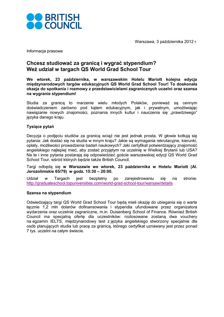 Warszawa, 3 października 2012 r. Informacja prasowa Chcesz studiować za granicą i wygrać stypendium? Weź udział w targach QS World Grad School Tour We wtorek, 23 października, w warszawskim Hotelu Mariott kolejna edycja międzynarodowych targów edukacyjnych QS World Grad School Tour! To doskonała okazja do spotkania i rozmowy z przedstawicielami zagranicznych uczelni oraz szansa na wygranie stypendium! Studia za granicą to marzenie wielu młodych Polaków, ponieważ są cennym doświadczeniem zarówno pod kątem edukacyjnym, jak i prywatnym, umożliwiając nawiązanie nowych znajomości, poznania innych kultur i nauczenia się „prawdziwego” języka danego kraju. Tysiące pytań Decyzja o podjęciu studiów za granicą wciąż nie jest jednak prosta. W głowie kotłują się pytania: Jak dostać się na studia w innym kraju? Jakie są wymagania rekrutacyjne, kierunki, opłaty, możliwości prowadzenia badań naukowych? Jaki certyfikat potwierdzający znajomość angielskiego najlepiej mieć, aby zostać przyjętym na uczelnię w Wielkiej Brytanii lub USA? Na te i inne pytania postarają się odpowiedzieć goście warszawskiej edycji QS World Grad School Tour, wśród których będzie także British Council. Targi odbędą się w Warszawie we wtorek, 23 października w Hotelu Mariott (Al. Jerozolimskie 65/79) w godz. 15:30 – 20:00. Udział w Targach jest bezpłatny po zarejestrowaniu się na http://graduateschool.topuniversities.com/world-grad-school-tour/warsaw/details stronie: Szansa na stypendium Odwiedzający targi QS World Grad School Tour będą mieli okazję do ubiegania się o warte łącznie 1,2 mln dolarów dofinansowania i stypendia ufundowane przez organizatora wydarzenia oraz uczelnie zagraniczne, m.in. Duisenberg School of Finance. Również British Council ma specjalną ofertę dla uczestników: rozlosowane zostaną dwa vouchery na egzamin IELTS, międzynarodowy test z języka angielskiego stworzony specjalnie dla osób planujących studia lub pracę za granicą, którego certyfikat uznawany jest przez ponad 7 tys. uczelni na całym świecie. *** British Council Organizacja założona w 1934 roku, reprezentująca Zjednoczone Królestwo Wielkiej Brytanii i Irlandii Północnej w dziedzinie współpracy kulturalnej i edukacyjnej ze szczególnym uwzględnieniem nauki języka angielskiego. W Polsce działa od 1938. Promuje wybitne osiągnięcia brytyjskie w dziedzinie nauki, edukacji i sztuki oraz programów społecznych, umożliwiając nawiązywanie partnerskiej współpracy pomiędzy polskimi i brytyjskimi instytucjami. Prowadzi działalność na całym świecie, stawiając na najwyższą jakość nauczania oraz rozwój współpracy w zakresie edukacji pomiędzy Wielką Brytanią a innymi krajami. British Council jest jednym z centrów egzaminacyjnych brytyjskich egzaminów językowych i niejęzykowych (Cambridge ESOL, IELTS, egzaminy różnych uczelni brytyjskich, egzaminy zawodowe). IELTS International English Language Testing System (IELTS) jest międzynarodowo rozpoznawanym egzaminem językowym, określającym poziom znajomości angielskiego osoby przystępującej do niego (jest to tzw. test poziomujący). W procesach rekrutacyjnych stosują go największe i najbardziej szanowane uniwersytety i pracodawcy na całym świecie, m.in. Uniwersytet Jagielloński, College of Europe, prestiżowe amerykańskie szkoły wyższe należące do Ivy League, najstarsze uniwersytety brytyjskie oraz firmy-marki, takie jak Coca Cola Inc, Emmerson Direct Communication, Shell International i Ernst & Young Australia. Jest produktem trzech szanowanych instytucji edukacyjnych: British Council, Univeristy of Cambridge ESOL Examinations oraz IDP Australia. Oferowany w tradycyjnej wersji papierowej, sprawdza cztery kluczowe umiejętności: słuchanie, rozumienie tekstów pisanych, pisanie oraz mówienie. Część ustna przeprowadzana jest w formacie 1 zdający: 1egzaminator. Wyniki, dostępne już 13 dnia od daty testu, opisane są na 9-cio stopniowej skali, dokładnie określającej poziom znajomości języka angielskiego. Więcej informacji o teście IELTS na stronie internetowej: www.britishcouncil.org/pl/polandielts.htm Kontakt dla mediów: Małgorzata Kurpias British Council | Aleje Jerozolimskie 59 | 00-697 Warszawa | Poland | T: +48 22 695-59-35 F: +48 22 695-59-30 M: +48 0660-737-246 [email protected]