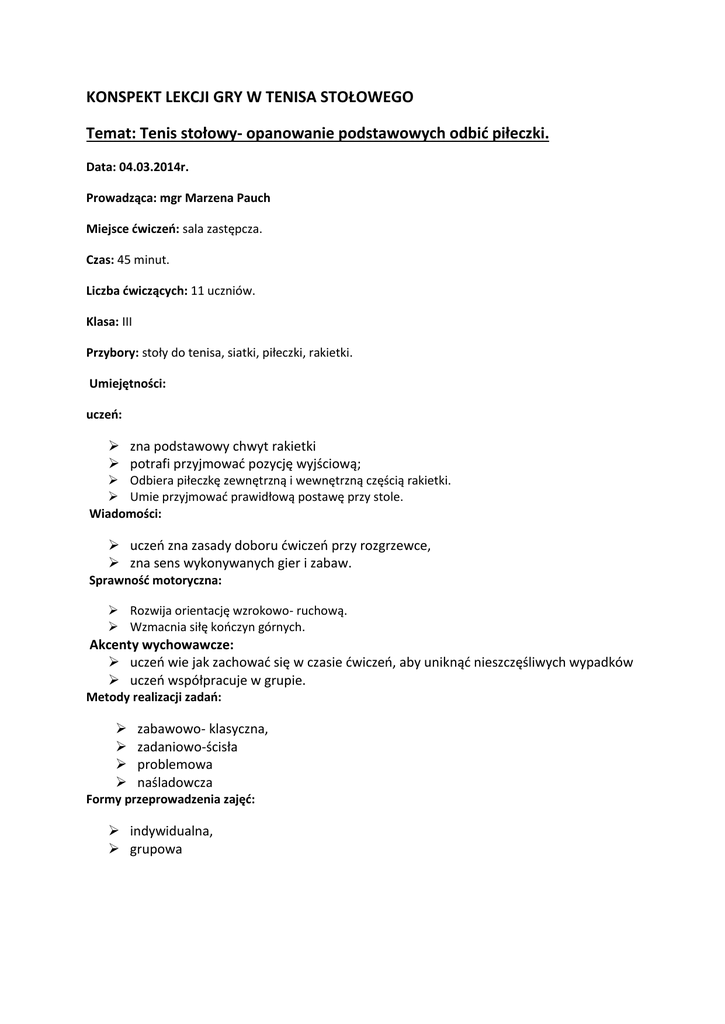 KONSPEKT LEKCJI GRY W TENISA STOŁOWEGO Temat: Tenis stołowy- opanowanie podstawowych odbić piłeczki. Data: 04.03.2014r. Prowadząca: mgr Marzena Pauch Miejsce ćwiczeń: sala zastępcza. Czas: 45 minut. Liczba ćwiczących: 11 uczniów. Klasa: III Przybory: stoły do tenisa, siatki, piłeczki, rakietki. Umiejętności: uczeń: zna podstawowy chwyt rakietki potrafi przyjmować pozycję wyjściową; Odbiera piłeczkę zewnętrzną i wewnętrzną częścią rakietki. Umie przyjmować prawidłową postawę przy stole. Wiadomości: uczeń zna zasady doboru ćwiczeń przy rozgrzewce, zna sens wykonywanych gier i zabaw. Sprawność motoryczna: Rozwija orientację wzrokowo- ruchową. Wzmacnia siłę kończyn górnych. Akcenty wychowawcze: uczeń wie jak zachować się w czasie ćwiczeń, aby uniknąć nieszczęśliwych wypadków uczeń współpracuje w grupie. Metody realizacji zadań: zabawowo- klasyczna, zadaniowo-ścisła problemowa naśladowcza Formy przeprowadzenia zajęć: indywidualna, grupowa Tok lekcji Zadania szczegółowe Czas Uwagi organizacyjnometodyczne 3’ - uczniowie stoją w dwuszeregu - zabawa ożywiająca ,,Numer pod stół”. 7’ Uczniowie po odliczeniu mają nadane Rozgrzewka numery. Biegają truchtem dookoła stołu. ogólnorozwojowa, Nauczyciel podaje numer ucznia, który na przygotowanie czworaka przechodzi pod stołem. Zabawa organizmu do trwa równocześnie przy dwóch stołach, wysiłku dlatego ważne jest kto szybciej skończy zadanie. - ogólne ćwiczenia mięśni RR, NN, tułowia, -ćwiczenia gibkościowe i zwinnościowe w różnych płaszczyznach. -n-l podaje uczniom reguły zabawy i czuwa nad prawidłowym jej przebiegiem - prezentuje uczniom ćwiczenia, - koryguje błędy, - omawia ćwiczenia pod względem ich przydatności. Część wstępna Czynności organizacyjnoporządkowe. - Zbiórka, powitanie, sprawdzenie gotowości do zajęć. Podanie celu lekcji. Część główna Ćwiczenia techniczne - postawa tenisisty - uczniowie krokiem odstawno- dostawnym 5’ biegają dookoła stołu, RR z rakietką ponad stołem, - biegają dookoła stołu ciągle odbijając piłeczkę rakietką. - odbijają piłeczkę raz wysoko, a raz nisko. - po odbiciu wykonują przysiad, - nauczyciel przedstawia prawidłową pozycję przy stole i koryguje błędy. - podrzut piłeczki i uderzenie wewnętrzną 5’ częścią rakietki, - j.w. zewnętrzną częścią rakietki, - ćwiczenie wykonywane seriami po prostej i po przekątnej. - gra pojedyncza do 6 pkt. 15’ - uczniowie czekający odbijają piłeczkę o ścianę wg. wskazań nauczyciela. -nauczyciel demonstruje odbicia piłeczki - uczniowie odbijają w parach -ćwiczenia koordynacyjne. Ćwiczenia doskonalące wprowadzenie piłeczki do gry ( serwis) Ćwiczenia doskonalące grę pojedynczą - uczniowie dobierają się w pary i próbują odbijać piłeczkę Część końcowa Ćwiczenia uspokajające, - marsz z piłeczką na rakietce, - dmuchanie w piłeczkę leżącą na stole. 5’ - zwrócenie uwagi na właściwą postawę Czynności końcowe: organizacyjnoporządkowe. - Zbiórka, omówienie lekcji. Wyróżnienie najlepiej ćwiczących. 5’ -uporządkowanie sprzętu