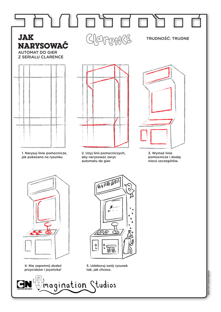 JAK NARYSOWAĆ TRUDNOŚĆ: TRUDNE AUTOMAT DO GIER Z SERIALU CLARENCE 1. Narysuj linie pomocnicze, jak pokazano na rysunku. 4. Nie zapomnij dodać przycisków i joysticka! 2. Użyj linii pomocniczych, aby narysować zarys automatu do gier. 5. Udekoruj swój rysunek tak, jak chcesz. 3. Wymaż linie pomocnicze i dodaj nieco szczegółów.