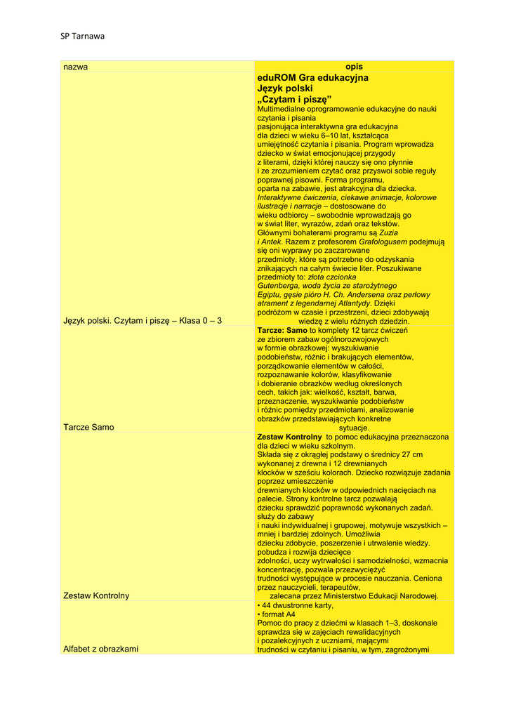 SP Tarnawa nazwa opis eduROM Gra edukacyjna Język polski „Czytam i piszę” Język polski. Czytam i piszę – Klasa 0 – 3 Tarcze Samo Zestaw Kontrolny Alfabet z obrazkami Multimedialne oprogramowanie edukacyjne do nauki czytania i pisania pasjonująca interaktywna gra edukacyjna dla dzieci w wieku 6–10 lat, kształcąca umiejętność czytania i pisania. Program wprowadza dziecko w świat emocjonującej przygody z literami, dzięki której nauczy się ono płynnie i ze zrozumieniem czytać oraz przyswoi sobie reguły poprawnej pisowni. Forma programu, oparta na zabawie, jest atrakcyjna dla dziecka. Interaktywne ćwiczenia, ciekawe animacje, kolorowe ilustracje i narracje – dostosowane do wieku odbiorcy – swobodnie wprowadzają go w świat liter, wyrazów, zdań oraz tekstów. Głównymi bohaterami programu są Zuzia i Antek. Razem z profesorem Grafologusem podejmują się oni wyprawy po zaczarowane przedmioty, które są potrzebne do odzyskania znikających na całym świecie liter. Poszukiwane przedmioty to: złota czcionka Gutenberga, woda życia ze starożytnego Egiptu, gęsie pióro H. Ch. Andersena oraz perłowy atrament z legendarnej Atlantydy. Dzięki podróżom w czasie i przestrzeni, dzieci zdobywają wiedzę z wielu różnych dziedzin. Tarcze: Samo to komplety 12 tarcz ćwiczeń ze zbiorem zabaw ogólnorozwojowych w formie obrazkowej: wyszukiwanie podobieństw, różnic i brakujących elementów, porządkowanie elementów w całości, rozpoznawanie kolorów, klasyfikowanie i dobieranie obrazków według określonych cech, takich jak: wielkość, kształt, barwa, przeznaczenie, wyszukiwanie podobieństw i różnic pomiędzy przedmiotami, analizowanie obrazków przedstawiających konkretne sytuacje. Zestaw Kontrolny to pomoc edukacyjna przeznaczona dla dzieci w wieku szkolnym. Składa się z okrągłej podstawy o średnicy 27 cm wykonanej z drewna i 12 drewnianych klocków w sześciu kolorach. Dziecko rozwiązuje zadania poprzez umieszczenie drewnianych klocków w odpowiednich nacięciach na palecie. Strony kontrolne tarcz pozwalają dziecku sprawdzić poprawność wykonanych zadań. służy do zabawy i nauki indywidualnej i grupowej, motywuje wszystkich – mniej i bardziej zdolnych. Umożliwia dziecku zdobycie, poszerzenie i utrwalenie wiedzy. pobudza i rozwija dziecięce zdolności, uczy wytrwałości i samodzielności, wzmacnia koncentrację, pozwala przezwyciężyć trudności występujące w procesie nauczania. Ceniona przez nauczycieli, terapeutów, zalecana przez Ministerstwo Edukacji Narodowej. • 44 dwustronne karty, • format A4 Pomoc do pracy z dziećmi w klasach 1–3, doskonale sprawdza się w zajęciach rewalidacyjnych i pozalekcyjnych z uczniami, mającymi trudności w czytaniu i pisaniu, w tym, zagrożonymi SP Tarnawa ryzykiem dysleksji. Zestaw dwustronnych kart to praktyczny materiał do demonstracji liter. Każda karta zawiera z jednej strony literę drukowaną i pisaną (wraz z kierunkiem jej pisania), ilustrację wraz z podpisem. Druga strona natomiast nie posiada obrazka - jedynie zapis litery, co daje możliwość zaadoptowania karty według własnych potrzeb. Wystarczy nakleić wybrany obrazek lub wykonać ilustrację. Wten sposób można dostosowywać wyrazy związane z wprowadzaną literą do umiejętności czy zainteresowań uczniów. Pomoc rozwija rozumienie mowy, wzbogaca słownictwo, orientację przestrzenną, koordynację wzrokowo – ruchową, umiejętność słuchania i spostrzegania. Pomoc przeznaczona jest dla dzieci, u których chcemy wspomagać rozwój mowy, z zaburzonym funkcjonowaniem analizatora słuchowego i wzrokowego, z obniżonym poziomem grafomotorycznym i płynnością ruchów, z zaburzoną koordynacją wzrokowo-ruchową, u których chcemy wspomagać umiejętność prawidłowego kreślenia liter pojedynczych jak również dwuznaków i zmiękczeń. Zestaw artykułów szkolnych najwyższej jakości dostosowany do potrzeb jednego dziecka. Wszystkie elementy zestawu mieszczą się w walizeczce, co ułatwia przechowywanie akcesoriów przez każde dziecko. • walizka z rączką Zestaw indywidualny podstawowy Wyprawka pierwszoklasisty Tabliczka ze szlaczkami – czerwona Tabliczka ze szlaczkami – żółta • 2 ołówki z nadrukiem + gumka • kredki 12 kol • kredki ołówkowe 12 kolorów • blok rysunkowy • zeszyt papierów wycinankowych • plastelina • farby akwarelowe Wyprawka Pierwszoklasisty to praktyczny komplet na dobry początek, a w nim: Zestaw Kontrolny, czyli okrągła podstawa wykonana z drewna z 12 drewnianym klockami w 6 kolorach, 2 tarcze blanko oraz 12 tematycznych tarcz (WPK) ze zbiorem zabaw dla dzieci od 6 lat, opartych na podstawowych założeniach programowych nauczania zintegrowanego: • dodawanie i odejmowanie w zakresie 20, • łączenie w pary obrazków logicznie do siebie pasujących, • rozpoznawanie i utrwalanie nazw zwierząt, owoców i warzyw, • rozpoznawanie liter alfabetu – pierwsze litery nazw obrazków, • łączenie sylab w proste wyrazy, • łączenie wyrazów jednosylabowych z obrazkami. zalecana przez pedagogów i psychologów, jest systemem skutecznej edukacji, który rozwija u dziecka spostrzegawczość i koncentrację, uczy myślenia i zapamiętywania oraz kształtuje osobowość i charakter. Tablica do ćwiczeń logopedycznych i manualnych, które przygotowują dzieci do nauki czytania i pisania. W zestawie wierszyki do ćwiczeń w mówieniu i sylabizowaniu. Wykonana z drewna, ma dołączony drewniany pisak mocowany do tablicy. • wym. 30 x 21 cm Tablica do ćwiczeń logopedycznych i manualnych, które przygotowują dzieci do nauki czytania i pisania. W zestawie wierszyki do SP Tarnawa Drewniana ósemka Labirynt ścienny Prosiaczek Krokodyl Kaczuszka Żabka ćwiczeń w mówieniu i sylabizowaniu. Wykonana z drewna, ma dołączony drewniany pisak mocowany do tablicy. • wym. 30 x 21 cm Toczenie kulki po torze rozpoczynamy od środka, w lewo do góry, przez środek w