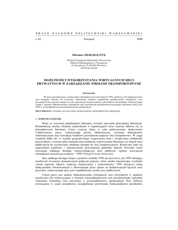 PRACE NAUKOWE z. 64 POLITECHNIKI WARSZAWSKIEJ Transport 2008 Mirosław SIERGIEJCZYK Wydział Transportu Politechnika Warszawska Zakład Telekomunikacji w Transporcie ul. Koszykowa 75, 00-662 Warszawa [email protected] MOŻLIWOŚCI WYKORZYSTANIA WIRTUALNYCH SIECI PRYWATNYCH W ZARZĄDZANIU FIRMAMI TRANSPORTOWYMI Streszczenie W pracy przedstawiona została istota wirtualnych sieci prywatnych VPN, podstawy ich funkcjonowania oraz dostępne metody ich tworzenia. Omówiono wybrane zagadnienia projektowania wirtualnych sieci prywatnych oraz sposoby mające na celu zapewnienie bezpieczeństwa i prawidłowe ich działanie. Wykorzystując zasady i sposoby funkcjonowania wirtualnych sieci prywatnych przedstawiono koncepcję wdrożenia takiej sieci VPN w wielooddziałowym przedsiębiorstwie spedycyjnym. Słowa kluczowe: wirtualne sieci prywatne, bezpieczeństwo, przedsiębiorstwo spedycyjne 1. WPROWADZENIE Wraz ze wzrostem popularności Internetu, wzrosło znaczenie przesyłanej informacji. Komunikacja miedzy firmami, jednostkami w organizacjach coraz częściej odbywa się za pośrednictwem Internetu. Coraz częściej firmy w celu podwyższenia skuteczności i efektywności pracy wykorzystują pocztę elektroniczną, wymianę dokumentów elektronicznych oraz transakcje handlowe prowadzone poprzez sieci komputerowe. W ciągu ostatnich kilku lat, w wyniku geograficznego rozproszenia firm i zwiększonej mobilności pracowników, wzrosła także dramatycznie tendencja wykorzystania Internetu czy innych sieci publicznych do uzyskiwania zdalnego dostępu do sieci korporacyjnych. Konieczne stało się zapewnienie poufności i autentyczności przesyłanych globalnie danych. Powstało wiele rozwiązań zdalnego dostępu wykorzystujących sieci publiczne ogólnie nazwanych wirtualnymi sieciami prywatnymi – VPN (Virtual Private Networks). Idea zdalnego dostępu leżąca u podstaw techniki VPN nie jest nowa, ale VPN oferujący możliwość tworzenia dynamicznych połączeń poprzez różne media transmisyjne wychodzi o krok naprzód. Oprócz większej elastyczności i skalowalności, VPN dostarcza usług funkcjonalnie równoważnych z oferowanymi przez oparte na dedykowanych łączach sieci prywatne, wykorzystując przy tym współdzielone zasoby sieci publicznych. Celem pracy jest analiza funkcjonowania wirtualnych sieci prywatnych w aspekcie możliwości ich wykorzystania w firmach wielooddziałowych oraz przedstawienie metodyki wdrożenia wirtualnej sieci prywatnej w przedsiębiorstwie spedycyjnym. Przy doborze rozwiązania w części projektowej uwzględniono porównanie funkcjonalności protokołów 122 Mirosław Siergiejczyk tworzenia wirtualnych sieci prywatnych – IPSec i SSL VPN oraz specyficznymi wymaganiami firmy spedycyjnej. 2. FUNKCJONOWANIA SIECI VPN 2.1. Istota sieci VPN Wirtualna Sieć Prywatna, zwaną potocznie „siecią VPN” (z ang. Virtual Private Network) jest siecią przekazu danych korzystającą z publicznej infrastruktury telekomunikacyjnej, która dzięki stosowaniu protokołów tunelowania i procedur bezpieczeństwa zachowuje poufność danych [5]. Infrastrukturą może być sieć szkieletowa operatora telekomunikacyjnego (np. Frame Relay lub ATM), a także globalna sieć Internet. Sieci te nazwano „wirtualnymi”, gdyż opierają się one na dynamicznych, wirtualnych połączeniach - wirtualnych obwodach (Virtual Circuit– wirtualny obwód – jest to połączenie zestawiane w sieci pomiędzy nadawcą a odbiorcą, w którym trasy przesyłu danych oraz przepływność pasma dla połączenia są ustawiane dynamicznie) czy też tunelach – nie mających fizycznego bytu i istniejącymi tylko wtedy, gdy jest nimi przenoszony ruch. Połączenia takie mogą być zestawiane między dwoma osobnymi urządzeniami, urządzeniem a siecią oraz między dwoma sieciami [3]. Sieć VPN w założeniu powinna zapewniać: poufność, integralność i autentyczność przesyłanych danych. Ogólnie wyróżniamy trzy powszechnie stosowane rodzaje sieci VPN: zaufany VPN, bezpieczny VPN oraz hybrydowy VPN [6]. Zaufany VPN (z ang. Trusted VPN) w nomenklaturze VPN Consortium lub inaczej Provider-based VPN - nomenklatura IETF, to łącza uzyskane od operatora telekomunikacyjnego z zapewnieniem, że dane są odpowiednio chronione. Z technicznego punktu widzenia nie ma gwarancji, iż urządzenia w sieci operatora, przez które przesyłane są dane nie zostaną przejęte przez osoby nieupoważnione. Usługa tego typu świadczona przez operatora może opierać się o łącza dzierżawione zestawione w technologii ATM, Frame Relay czy MPLS. Operator może zapewnić odpowiednio wysoką dostępność usługi, odpowiedni poziom jakości usług QoS (Quality-of-Service) i wymagane pasmo. Drugim rodzajem jest bezpieczny VPN (Secure VPN) wg VPN Consortium [6] oraz CEBased VPN (Customer Equipment Based VPN – sieć VPN bazująca na urządzeniach i oprogramowaniu klienta) wg IETF, gdzie transmisja odbywa się przez Internet, a do jej ochrony stosuje się techniki kryptograficzne. Użytkownik lub firma sama decyduje, jakie mechanizmy ochrony mają być zastosowane. Zaszyfrowany ruch jest widoczny jako tunel między dwoma sieciami i nawet, jeżeli napastnik widzi ruch sieciowy, to i tak nie może go odczytać, jak również zmodyfikować danych niezauważalnie dla strony odbiorczej. Dużą zaletą tego rozwiązania jest koszt , ponieważ VPN wykorzystuje zwykłe łącze internetowe posiadane przez firmę, którego koszt utrzymania jest o wiele niższy niż dedykowanego łącza dzierżawionego. Należy jednak zauważyć, że bezpieczny VPN realizowany jest przez łącza publiczne, gdzie operatorzy nie mogą zapewnić takich samych parametrów sieci na całej drodze transmisji. Istnieje jeszcze rodzaj sieci VPN integrujący dwa powyższe. Są to hybrydowe sieci VPN (z ang. Hybrid VPN), które stosuje się do przesyłania poufnych informacji wrażliwych na opóźnienia w sieci, np. VoIP. Transmisja w tym wypadku realizo
