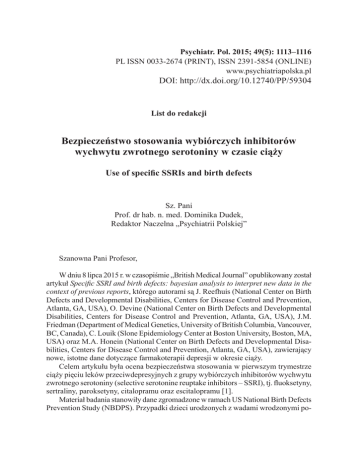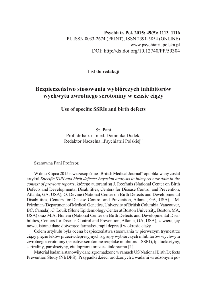 Psychiatr. Pol. 2015; 49(5): 1113–1116 PL ISSN 0033-2674 (PRINT), ISSN 2391-5854 (ONLINE) www.psychiatriapolska.pl DOI: http://dx.doi.org/10.12740/PP/59304 List do redakcji Bezpieczeństwo stosowania wybiórczych inhibitorów wychwytu zwrotnego serotoniny w czasie ciąży Use of specific SSRIs and birth defects Sz. Pani Prof. dr hab. n. med. Dominika Dudek, Redaktor Naczelna „Psychiatrii Polskiej” Szanowna Pani Profesor, W dniu 8 lipca 2015 r. w czasopiśmie „British Medical Journal” opublikowany został artykuł Specific SSRI and birth defects: bayesian analysis to interpret new data in the context of previous reports, którego autorami są J. Reefhuis (National Center on Birth Defects and Developmental Disabilities, Centers for Disease Control and Prevention, Atlanta, GA, USA), O. Devine (National Center on Birth Defects and Developmental Disabilities, Centers for Disease Control and Prevention, Atlanta, GA, USA), J.M. Friedman (Department of Medical Genetics, University of British Columbia, Vancouver, BC, Canada), C. Louik (Slone Epidemiology Center at Boston University, Boston, MA, USA) oraz M.A. Honein (National Center on Birth Defects and Developmental Disabilities, Centers for Disease Control and Prevention, Atlanta, GA, USA), zawierający nowe, istotne dane dotyczące farmakoterapii depresji w okresie ciąży. Celem artykułu była ocena bezpieczeństwa stosowania w pierwszym trymestrze ciąży pięciu leków przeciwdepresyjnych z grupy wybiórczych inhibitorów wychwytu zwrotnego serotoniny (selective serotonine reuptake inhibitors – SSRI), tj. fluoksetyny, sertraliny, paroksetyny, citalopramu oraz escitalopramu [1]. Materiał badania stanowiły dane zgromadzone w ramach US National Birth Defects Prevention Study (NBDPS). Przypadki dzieci urodzonych z wadami wrodzonymi po- 1114 Ewa Bałkowiec-Iskra chodziły z następujących stanów: Arkansas, California, Georgia, Iowa, Massachussetts, New Jersey, New York, North Carolina, Texas i Utah. Do badania włączono przypadki ciąż zakończonych urodzeniem dzieci żywych, poronień oraz indukowanych aborcji w latach 2002–2009, u których stwierdzono jedną z 30 wad wrodzonych, z wyłączeniem zaburzeń chromosomalnych lub monogenowych. Informacje dotyczące stosowania leków przeciwdepresyjnych przez badane kobiety uzyskiwano telefonicznie w czasie od sześciu tygodni do dwóch lat po porodzie. Należy podkreślić, iż w trakcie rozmowy nie zadawano pytania o występowanie depresji. Pytano natomiast ogólnie o występowanie jakichkolwiek chorób i ich leczenie. Dowiadywano się, czy w okresie od trzech miesięcy przed zapłodnieniem do czasu porodu pacjentka przyjmowała któryś z następujących leków: Prozac (fluoksetyna), Paxil (paroksetyna), Zoloft (sertralina), Celexa (citalopram). Nie zadano pytania o stosowanie Lexapro (escitalopramu). Do analizy włączano przypadki, w których kobieta potwierdziła przynajmniej jednokrotne zastosowanie leku z grupy SSRI w okresie od miesiąca przed zapłodnieniem do zakończenia trzeciego miesiąca ciąży. Kobiety, które deklarowały stosowanie kilku leków z grupy SSRI, zakwalifikowano do grupy „multiple SSRI”. Kobiety zostały zakwalifikowane jako niestosujące SSRI (unexposed), jeżeli nie stosowały żadnych leków przeciwdepresyjnych w okresie od trzech miesięcy przed zapłodnieniem do końca ciąży oraz nie zgłosiły występowania depresji, zaburzeń lękowych, zaburzenia afektywnego dwubiegunowego, zaburzenia obsesyjno-kompulsyjnego. Z badania wyłączono kobiety, które stosowały SSRI w okresie innym niż wskazany powyżej, stosowały inne leki przeciwdepresyjne niż z grupy SSRI (np. wenlafaksynę) lub nie udzieliły odpowiedzi dotyczących odpowiednich pytań. Na podstawie danych uzyskanych z NBDPS do analizy włączono 17 293 przypadki kobiet niestosujących SSRI, 659 przypadków kobiet stosujących citalopram, escitalopram, fluoksetynę, paroksetynę, sertralinę, 9 559 kobiet niestosujących SSRI z grupy kontrolnej oraz 298 przypadków kobiet z grupy kontrolnej, które stosowały jeden z SSRI. Wykazano związek między stosowaniem fluoksetyny oraz występowaniem ubytków przegrody międzykomorowej, zwężenia drogi odpływu z prawej komory oraz kraniosynostozy. Wykazano też związek stosowania paroksetyny z występowaniem bezmózgowia, wad przegrody międzyprzedsionkowej, zwężenia drogi odpływu z prawej komory, przepukliny pępowinowej oraz wytrzewienia wrodzonego. Warto podkreślić, iż o występowaniu wady wrodzonej serca – zwężenia drogi odpływu z prawej komory u dzieci matek stosujących we wczesnej ciąży fluoksetynę lub paroksetynę – donoszono już wcześniej [2]. Opisywano również przypadki bezmózgowia [3] i wad przegrody międzyprzedsionkowej [4] po stosowaniu paroksetyny. Iloraz szans (odds ratio – OR) wystąpienia bezmózgowia u dzieci matek stosujących paroksetynę wynosił 3,2, natomiast zwężenia drogi odpływu z prawej komory – 2,4. Oznacza to, że absolutne ryzyko wystąpienia bezmózgowia wzrasta przy stosowaniu paroksetyny we wczesnej ciąży z dwóch do siedmiu na 10 000, a ryzyko wystąpienia zwężenia drogi odpływu z prawej komory z 10 do 24 na 10 000. Należy zaznaczyć, iż w opisywanej pracy nie potwierdzono wcześniejszych doniesień dotyczących związku występowania wad wrodzonych ze stosowaniem List do redakcji. Bezpieczeństwo stosowania wybiórczych inhibitorów 1115 sertraliny [5, 6], pomimo że aż 40% z ankietowanych kobiet stosowało właśnie ją we wczesnej ciąży. W analizie nie potwierdzono też występowania 14 innych wcześniej opisywanych związków wad wrodzonych ze stosowaniem SSRI. Powyższa praca potwierdziła, iż grupa leków SSRI nie powinna być traktowana jako jednolita. Wiadomo było, że leki z tej grupy różnią się profilem farmakokinetycznym, obecnie wskazano, iż być może różnią się też potencjałem teratogennym. Ograniczeniem analizy jest brak uwzględnienia wys