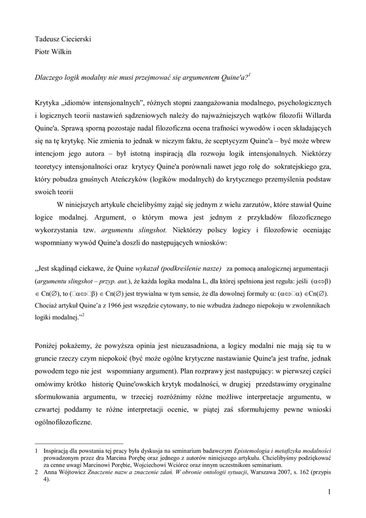 W niniejszych artykule chcielibyśmy zająć się jednym z wielu zarzutów, które stawiał Quine