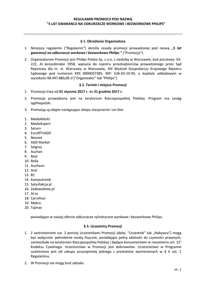 wysokości 68.497.880,00 zł ("Organizator" lub "Philips").