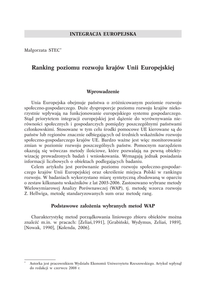 INTEGRACJA EUROPEJSKA Małgorzata STEC* Ranking poziomu rozwoju krajów Unii Europejskiej Wprowadzenie Unia Europejska obejmuje państwa o zróżnicowanym poziomie rozwoju społeczno-gospodarczego. Duże dysproporcje poziomu rozwoju krajów niekorzystnie wpływają na funkcjonowanie europejskiego systemu gospodarczego. Stąd priorytetem integracji europejskiej jest dążenie do wyrównywania nierówności społecznych i gospodarczych pomiędzy poszczególnymi państwami członkowskimi. Stosowane w tym celu środki pomocowe UE kierowane są do państw lub regionów znacznie odbiegających od średnich wskaźników rozwoju społeczno-gospodarczego krajów UE. Bardzo ważne jest więc monitorowanie zmian w poziomie rozwoju poszczególnych państw. Pomocnym narzędziem okazują się wówczas metody ilościowe, które pozwalają na pewną obiektywizację prowadzonych badań i wnioskowania. Wymagają jednak posiadania informacji liczbowych o obiektach podlegających badaniu. Celem artykułu jest porównanie poziomu rozwoju społeczno-gospodarczego krajów Unii Europejskiej oraz określenie miejsca Polski w rankingu rozwoju. W badaniach wykorzystano miarę syntetyczną zbudowaną w oparciu o zestaw kilkunastu wskaźników z lat 2003-2006. Zastosowano wybrane metody Wielowymiarowej Analizy Porównawczej (WAP), tj. metodę wzorca rozwoju Z. Hellwiga, metodę standaryzowanych sum oraz metodę rang. Podstawowe założenia wybranych metod WAP Charakterystykę metod porządkowania liniowego zbioru obiektów można znaleźć m.in. w pracach: [Zeliaś,1991], [Grabiński, Wydymus, Zeliaś, 1989], [Nowak, 1990], [Kolenda, 2006]. * Autorka jest pracownikiem Wydziału Ekonomii Uniwersytetu Rzeszowskiego. Artykuł wpłynął do redakcji w czerwcu 2008 r. 100 GOSPODARKA NARODOWA Nr 7-8/2008 Metoda wzorca rozwoju Z. Hellwiga Metoda ta została zaproponowana w pracy [Hellwig, 1968]. Proces konstruowania miary rozwoju rozpoczyna się od ustalenia elementów macierzy obserwacji, czyli wartości cech Xj (j = 1, 2, …, m) odpowiadających poszczególnym obiektom Oi (i = 1, 2, …, n). Następnie wartości cech Xj w badanej zbiorowości obiektów poddaje się standaryzacji według wzoru: zij = xij - xr j Sj (1) przy czym: xr j – średnia arytmetyczna j-tej cechy, Sj – odchylenie standardowe j-tej cechy Wyznacza się tzw. wzorzec rozwoju P0 o współrzędnych (z01, z02, …, z0m), określony za pomocą następujących relacji: Z z = max z , gdy Xj jest stymulantą ij ]] 0j i [ lub j = 1, 2, …, m (2) ]] z0j = min zij, gdy Xj jest destymulantą i \ Stymulanty to cechy, których wysokie wartości są zjawiskiem pożądanym z pewnego punktu widzenia (np. stopnia rozwoju społeczno-gospodarczego) natomiast niskie są zjawiskiem niepożądanym. Destymulanty zaś to cechy, których niskie wartości są zjawiskiem pożądanym z pewnego punktu widzenia, a wysokie wartości są zjawiskiem niepożądanym. Następnie oblicza się odległości euklidesowe wyróżnionych obiektów od ustalonego w powyższy sposób wzorca, zgodnie z wzorem: m się: Dio = / j=1 2 _ zij - z oj i , i = 1, f, n (3) Na podstawie otrzymanego ciągu odległości D10, D20, …, Dn0 – wyznacza r o = n- 1 D n / Dio, (4) i=1 n So = n- 1 / _ Dio - Dr o i2 , (5) i=1 r 0 + 2S0, D0 = D (6) D di = 1 - Dio , i = 1, f, n o (7) Małgorzata Stec, Ranking poziomu rozwoju krajów Unii Europejskiej 101 Wartości d1, d2, …, dn porządkujemy od wartości największej do najmniejszej. Obiekt jest tym bardziej rozwinięty, im wartość miary rozwoju di zbliża się do jedności. Metoda standaryzowanych wartości (standaryzowanych sum) W metodzie tej dokonuje się najpierw standaryzacji zmiennych według wzoru (1). Jeżeli w zbiorze cech występują destymulanty, należy zamienić je na stymulanty przez pomnożenie ich standaryzowanych wartości przez -1. Następnie wyznacza się średnią arytmetyczną z wartości standaryzowanych cech odpowiadających poszczególnym obiektom wg wzoru: 1 qi = m m / zij i = 1, 2, f, n (8) j=1 Wartości qi utworzą wektor R V S q1 W Sq W q = S 2W S hW S qn W T X Im większa jest wartość miary qi, tym bardziej rozwinięty z punktu widzenia uwzględnionych w analizie cech jest i-ty obiekt. Metoda rang W metodzie tej zmienne doprowadza się do porównywalności i addytywności przez rangowanie każdej z nich (od 1 do n dla stymulant oraz w porządku odwrotnym dla destymulant). Następnie dla każdego obiektu wyznacza się sumę przyporządkowanych mu rang ze względu na wszystkie badane cechy. Wartości te tworzą macierz o postaci: R V S w11 w12 f w1m W S w w f w2m W w = S 21 22 (9) W Sf f f f W S w n1 w n2 f w nm W T X gdzie: wij – jest rangą nadaną i-temu obiektowi ze względu na j-tą cechę Obliczając wartość średnią według wzoru: 1 wri = m m / wij j=1 (10) 102 GOSPODARKA NARODOWA Nr 7-8/2008 uzyskuje się wartości miernika rozwoju dla każdego obiektu. Im mniejszą wartość przybiera wri, tym bardziej rozwinięty jest dany obiekt z punktu widzenia rozpatrywanych cech. Zastosowanie wybranych metod WAP w porządkowaniu krajów UE pod względem poziomu rozwoju społeczno-gospodarczego Ocenę poziomu rozwoju społeczno-gospodarczego obiektów można przeprowadzić za pomocą różnych mierników rozwoju np. PKB, PKB na 1 mieszkańca albo za pomocą miary syntetycznej będącej agregatem zbioru zmiennych społeczno-gospodarczych. Początkowym etapem postępowania w badaniu przy użyciu miary syntetycznej jest określenie wyjściowego (potencjalnego) zestawu zmiennych, który następnie sprawdza się wykorzystując kryteria o charakterze merytorycznym i formalno-statystycznym. Kryteria merytoryczne określają, by w badaniu poziomu rozwoju społeczno-gospodarczego obiektów dobierać zmienne reprezentujące wszystkie jego aspekty. Kryteria formalno-statystyczne dotyczą odpowiedniego poziomu zróżnicowania wskaźników (przyjmuje się, że współczynnik zmienności danej cechy powinien być wyższy niż 0,10) oraz nisk