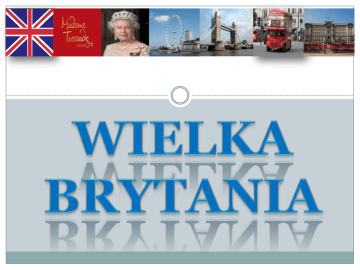 Zjednoczone Królestwo Wielkiej Brytanii i Irlandii Północnej obejmuje wyspę Wielką Brytanię, północno - wschodnią część wyspy Irlandii i liczne mniejsze wyspy. Dzieli się na 4 krainy historyczne: Anglia, Walia, Szkocja i Irlandia Północna. Językiem urzędowym jest angielski. Flaga Wielkiej Brytanii. Herb Wielkiej Brytanii. Powierzchnia 244 820 km 2 Stolica: Londyn Wielka Brytania jest monarchią parlamentarną z rządem odpowiedzialnym przed parlamentem. Głowa państwa: Królowa Elżbieta II Następca tronu: Książę William Premier: David Cameron DUŻE MIASTA Większe miasta to: Birmingham, Manchester, Leeds, Glasgow, Liverpool. LIVERPOOL BIRMINGHAM MANCHESTER LONDYN Londyn- stolica Wielkiej Brytanii, położony jest w południowej Anglii nad Tamizą. Pod względem mieszkańców Londyn jest jedną z największych aglomeracji miejskich świata. Miasto pełne zabytków i muzeów przyciąga rocznie 30 mln turystów. BIG BEN Big Ben jest to nazwa ważącego 14 ton dzwonu umieszczonego na 106 metrowej wieży. Dzwon ten zwisa z jednej z wież londyńskiego parlamentu. THE LONDON EYE Londyńskie oko Milenijne. Znajduję się w dzielnicy Lambeth, na południowym brzegu Tamizy. Koło ma wysokość 135 metrów, a jego pełny obrót trwa 40 minut. Na kole znajdują się 32 kapsuły pasarzerskie. PAŁAC BUCKINGHAM Pierwszą mieszkanką pałacu była królowa Wiktoria. Przed pałacem turyści mogą obejrzeć słynną na całym świecie ceremonię zmiany warty. KUCHNIA Angielskie jedzenie nie jest uważane za zbyt wykwintne i zdrowe. Mimo to jest kilka potraw wartych spróbowania. English breakfast Posiłek ten składa się głownie z kilku plastrów smażonego bekonu, jajek, tostów, fasolki i pomidorów. Do picia podaję się soki owoce, lub kawę i herbatę. Fish and chips Jest to smażona w głębokim oleju ryba podawana z frytkami. Dodatkami jest ketchup i fasolka. Wykonała: Agata Pałczyńska