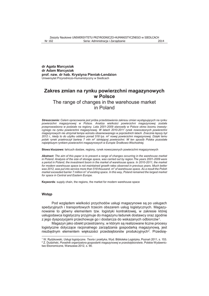 Zeszyty Naukowe UNIWERSYTETU PRZYRODNICZO-HUMANISTYCZNEGO w SIEDLCACH Nr 102 Seria: Administracja i Zarządzanie 2014 dr Agata Marcysiak dr Adam Marcysiak prof. nzw. dr hab. Krystyna Pieniak-Lendzion Uniwersytet Przyrodniczo-Humanistyczny w Siedlcach Zakres zmian na rynku powierzchni magazynowych w Polsce The range of changes in the warehouse market in Poland Streszczenie: Celem opracowania jest próba przedstawienia zakresu zmian występujących na rynku powierzchni magazynowej w Polsce. Analiza wielkości powierzchni magazynowej została przeprowadzona w podziale na regiony. Lata 2001-2009 stanowiły w Polsce okres boomu inwestycyjnego na rynku powierzchni magazynowej. W latach 2010-2011 rynek nowoczesnych powierzchni magazynowych nie utrzymał tempa wzrostu obserwowanego w poprzednich latach. Znacznie lepszy był 2012 r., kiedy to do użytku oddano ponad 518 tys. m2 nowej powierzchni magazynowej. Dzięki temu polski rynek przekroczył barierę 7 mln m2 istniejącej powierzchni. W ten sposób Polska pozostała największym rynkiem powierzchni magazynowych w Europie Środkowo-Wschodniej. Słowa kluczowe: łańcuch dostaw, regiony, rynek nowoczesnych powierzchni magazynowych Abstract: The aim of this paper is to present a range of changes occurring in the warehouse market in Poland. Analysis of the size of storage space, was carried out by region.The years 2001-2009 were a period in Poland, the investment boom in the market of warehouse space. In 2010-2011, the market for modern warehouse space is not maintained growth rates observed in previous years. Much better was 2012, was put into service more than 518 thousand. m2 of warehouse space. As a result the Polish market exceeded barrier 7 million m2 of existing space. In this way, Poland remained the largest market for space in Central and Eastern Europe. Keywords: supply chain, the regions, the market for modern warehouse space Wstęp Pod względem wielkości przychodów usługi magazynowe są po usługach spedycyjnych i transportowych trzecim obszarem usług logistycznych. Magazynowanie to główny elementem tzw. logistyki kontraktowej, w zakresie której usługodawca logistyczny przyjmuje do magazynu ładunek dostawcy oraz zgodnie z jego dyspozycjami przechowuje go i dostarcza do wskazanych odbiorców 1. Magazyn jako obiekt przestrzenny, w którym są realizowane liczne procesy logistyczne dotyczące racjonalnego zarządzania gospodarką magazynową, jest niezbędnym elementem większości przedsiębiorstw produkcyjnych2. PrzedsięW. Rydzkowski, Usługi logistyczne. Teoria i praktyka, Wyd. Biblioteka Logistyka, Poznań 2011, s. 153. Z. Dudziński, Poradnik organizatora gospodarki magazynowej w przedsiębiorstwie, Polskie Wydawnictwo Ekonomiczne, Warszawa 2012, s. 90. 1 2 98 A. Marcysiak, A. Marcysiak, K. Pieniak-Lendzion biorstwo może zainwestować w budowę własnego magazynu albo wynajmować powierzchnię magazynową u dewelopera lub innego przedsiębiorstwa na zasadzie outsourcingu. Obecnie coraz częściej spotyka się magazyny z wdrożonymi już nowoczesnymi systemami, które wspomagają funkcjonowanie magazynu. Nowoczesne technologie usprawniają i przyspieszają przepływ materiałów, jak również informacji3. Rynek powierzchni magazynowej w Polsce stanowi szeroki wachlarz możliwości wyboru przez potencjalnego klienta, chcącego skorzystać z oferty usług magazynowych. W Polsce głównymi inwestorami powierzchni magazynowej są inwestorzy zagraniczni. Na lokalizację magazynów decydujący wpływ ma czynnik infrastruktury. Największe skupisko wielko-powierzchniowych obiektów magazynowych można spotkać w obrębie skrzyżowań autostrad A1 i A2 oraz A1 i A4. Celem opracowania jest próba przedstawienia zakresu zmian występujących na rynku powierzchni magazynowej w Polsce. Analiza wielkości powierzchni magazynowej, zakresu jej wykorzystania, jak również wysokości czynszów płaconych przez najemców została przeprowadzona w podziale na główne regiony występowania oraz powszechnie przyjęte sektory. Podstawowym źródłem informacji były raporty przygotowywane przez firmy doradcze, prasę branżową oraz literatura przedmiotu. Miejsce magazynu w łańcuchu dostaw Łańcuch dostaw tworzy grupa przedsiębiorstw realizująca wspólnie działania niezbędne do zaspokojenia popytu na określone produkty. Działaniami tymi mogą być: rozwój, produkcja, sprzedaż, serwis, zaopatrzenie, dystrybucja, zarządzanie zasobami oraz różne działania wspomagające4. Najczęściej w łańcuchu dostaw występuje ogniwo początkowe, którym jest dostawca zaopatrujący producenta w surowce i materiały. Ogniwem pośrednim są podmioty uczestniczące w przetwarzaniu surowców w zespoły i gotowy wyrób. Ogniwo końcowe tworzy przedsiębiorstwo dostarczające wyrób klientowi 5. Współczesny rynek wymaga od łańcuchów dostaw znacznej elastyczności. Ma to bezpośrednie przełożenie na oczekiwania wobec magazynów, które są ogniwami łańcuchów6. Przedsiębiorstwa handlowe i logistyczne korzystają głównie z uniwersalnych magazynów usługowych wynajmowanych od deweloperów przemysłowych, przy czym są to nowoczesne magazyny określane często mianem magazynów klasy A. Dysponują także magazynami własnymi, co wynika ze specyfiki produktu lub technologii magazynowania, albo strategii przedsiębiorstwa7. Przedsiębiorstwa, aby móc konkurować na rynku, starają się zapewnić jak najwyższy poziom obsługi klienta przy możliwie jak najniższych kosztach8. W wyniku tego powstają różnego rodzaju nowoczesne strategie zarządzania C. Skowronek, Z. Sarjusz- Wolski, Logistyka w przedsiębiorstwie, PWE, Warszawa 2008, s. 94-95. I Fechner, Zarządzanie łańcuchem dostaw, WSL Poznań 2007, s 17-25. 5 M. Ciesielski, J. Długosz, Strategie łańcuchów dostaw, PWE, Warszawa 2010. s. 46-51. 6 A. Niemczyk, Logistyka wobec nowych wyzwań − materiały konferencyjne, Biblioteka Logistyka, Poznań 12 - 14 maj 2010, s. 201. 7 W.