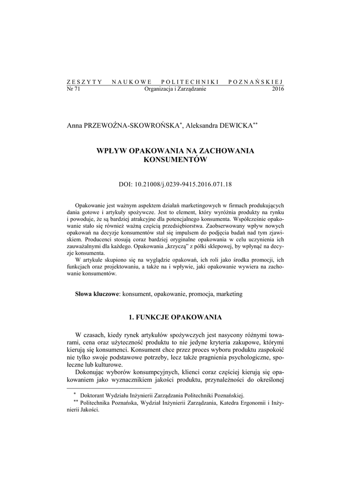 ZESZYTY Nr 71 NAUKOWE POLITECHNIKI Organizacja i Zarządzanie POZNAŃSKIEJ 2016 Anna PRZEWOŹNA-SKOWROŃSKA*, Aleksandra DEWICKA** WPŁYW OPAKOWANIA NA ZACHOWANIA KONSUMENTÓW DOI: 10.21008/j.0239-9415.2016.071.18 Opakowanie jest ważnym aspektem działań marketingowych w firmach produkujących dania gotowe i artykuły spożywcze. Jest to element, który wyróżnia produkty na rynku i powoduje, że są bardziej atrakcyjne dla potencjalnego konsumenta. Współcześnie opakowanie stało się również ważną częścią przedsiębiorstwa. Zaobserwowany wpływ nowych opakowań na decyzje konsumentów stał się impulsem do podjęcia badań nad tym zjawiskiem. Producenci stosują coraz bardziej oryginalne opakowania w celu uczynienia ich zauważalnymi dla każdego. Opakowania „krzyczą” z półki sklepowej, by wpłynąć na decyzje konsumenta. W artykule skupiono się na wyglądzie opakowań, ich roli jako środka promocji, ich funkcjach oraz projektowaniu, a także na i wpływie, jaki opakowanie wywiera na zachowanie konsumentów. Słowa kluczowe: konsument, opakowanie, promocja, marketing 1. FUNKCJE OPAKOWANIA W czasach, kiedy rynek artykułów spożywczych jest nasycony różnymi towarami, cena oraz użyteczność produktu to nie jedyne kryteria zakupowe, którymi kierują się konsumenci. Konsument chce przez proces wyboru produktu zaspokoić nie tylko swoje podstawowe potrzeby, lecz także pragnienia psychologiczne, społeczne lub kulturowe. Dokonując wyborów konsumpcyjnych, klienci coraz częściej kierują się opakowaniem jako wyznacznikiem jakości produktu, przynależności do określonej Doktorant Wydziału Inżynierii Zarządzania Politechniki Poznańskiej. Politechnika Poznańska, Wydział Inżynierii Zarządzania, Katedra Ergonomii i Inżynierii Jakości. * ** 204 Anna Przewoźna-Skowrońska, Aleksandra Dewicka warstwy społecznej lub mody. Opakowanie „przemawia” do klienta i jest czasem głównym determinantem wyborów zarówno przemyślanych, jak i impulsywnych. Z literatury marketingowej wynika, że opakowanie stanowi jedno z ważniejszych narzędzi marketingu. Według Nowackich (2012) opakowanie stanowi piąte narzędzie marketingu-mix (poza produktem, ceną, dystrybucją i promocją). Druga grupa specjalistów od marketingu zalicza opakowanie do elementów tworzących pozycję produktu na rynku. W tym aspekcie opakowanie pełni funkcję podrzędną w stosunku do produktu. Wielu uważa, że opakowanie odgrywa istotną rolę i razem z produktem stanowi system nierozerwalny, jednakże mimo wszystko to produkt powinien stanowić wartość dla konsumenta, a opakowanie ma wyłącznie go uzupełniać. Produkt zyskuje na wartości, gdy opakowanie jest również atrakcyjne. Uczucia wywołane przez opakowanie przekładają się na wyobrażenie o produkcie, w związku z czym istnieje coraz większa potrzeba wyróżnienia danego opakowania na tle innych. Opakowanie coraz częściej spełnia funkcję podstawowego środka komunikacji między przedsiębiorstwem a klientem i stanowi o wartości produktu. Opakowanie odgrywa ważną rolę w decyzjach zakupowych. Interesujące jest, jak bardzo można zmienić zachowanie nabywców przez zmianę kolorystyki, kształtu czy funkcjonalności opakowania. Rola oraz funkcje opakowania są zmienne – znaczenie tego instrumentu wiąże się bowiem z rozwojem zmiennego rynku. Opakowanie jest to gotowy produkt, którego głównym celem jest ochrona wyrobu przed szkodliwym oddziaływaniem czynników zewnętrznych, umożliwiający jego przemieszczanie i ochronę przed zniszczeniem podczas magazynowania, transportu, sprzedaży i użytkowania. Informuje o zawartości, oddziałuje na kupującego oraz nadaje walory ekonomiczne. Neil Farmer (2016) opisuje różne kryteria podziału opakowań: ochronne, identyfikacyjne, informacyjne, reklamowe, sprzedażne (łatwość otwierania i ponownego zamknięcia), użytkowe (ekologiczność, łatwość utylizacji, higieniczność). Najczęściej stosowany jest podział na funkcje: ochronne, zarządzające, informacyjne i marketingowe, czyli promocyjne. 1.1. Funkcja ochronna Opakowanie ma służyć do ochrony wszystkich fizycznych, chemicznych i sensorycznych cech zapakowanego produktu przed szkodliwym oddziaływaniem czynników zewnętrznych i wewnętrznych w procesach fizycznego przemieszczania towa- Wpływ opakowania na zachowania konsumentów 205 rów do konsumenta. Należy wziąć pod uwagę, że materiał opakowaniowy musi być zgodny z ostrymi wymaganiami sanitarnymi Światowej Organizacji Zdrowia (WHO) oraz z wymaganiami zawartymi w dyrektywach Unii Europejskiej. 1.2. Funkcja zarządzająca Ta funkcja opakowań wiąże się z umieszczaniem na nich różnych kodów celem usprawnienia i przyspieszenia przepływu informacji oraz automatyzacji procesów dystrybucji towarów. Do odczytywania symboli stosuje się elektroniczne urządzenia sprzężone z kasami lub komputerowymi systemami wspomagania obrotu towarowego. Obecnie na całym świecie przyjęty jest jednolity kod kreskowy EAN. Stosują go kraje należące do międzynarodowego stowarzyszenia znakowania towarów – European Article Numbering International (EANI). 1.3. Funkcja informacyjna Opakowanie to nośnik wielu informacji przeznaczonych dla konsumentów, handlowców, dystrybutorów, a także tych podmiotów, które są zainteresowane składem produktu, okresem przydatności do spożycia, sposobem użytkowania, warunkami przechowywania itp. Informacje są umieszczane na widocznej części opakowania, gdyż wówczas są najszybciej dostrzeżone przez konsumenta. Mogą być wyrażone za pomocą napisów, liter, cyfr, rysunków lub różnych kodów, np. radiowych, kreskowych, magnetycznych. Określony system znaków musi być oparty na zastosowaniu nowoczesnej grafiki, oryginalnej barwy, innowacyjnego wzornictwa i zasad reklamy. Spełnienie tej istotnej funkcji wpływa na zachowanie i lojalność kupującego i powoduje, że uwaga nabywcy zostaje ski