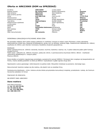 Oferta nr ARK23069 (DOM na SPRZEDAŻ) Id oferty Rodzaj umowy Stan prawny Stan prawny gruntu Cena Powierzchnia Powierzchnia działki Typ domu Powierzchnia użytkowa Liczba pokoi Materiał Dach Rok budowy Ogród Stan nieruchomości ARK23069 Liczba pięter Na wyłączność Rodzaj ogrzewania Własność Stan budynku Własność Woda 619 000 PLN Cena za m2 240 Rynek 1619 Droga dojazdowa Wolnostojący Kształt działki 130 Teren ogrodzony 5 Gaz Cegła Prąd Dachówka betonowa Kanalizacja 1930 Gorąca woda tak Typ kuchni Do remontu Piwnica 1 Gazowe Dobry tak 2 579 PLN Wtórny Asfaltowa Prostokąt tak tak tak tak Bojler Widna tak DOSKONAŁA LOKALIZACJA W PILCHOWIE, NISKA CENA Na sprzedaż zadbany dom wolno stojący położony w urokliwej i tonącej w zieleni części Pilchowa z niską zabudową jednorodzinną, blisko lasu. Budynek przedwojenny, gruby mur ze zdrowej, solidnej cegły. Powierzchnia całkowita ok. 240m2, użytkowa ok.130m2, jest również murowany niezależny budynek gospodarczy. ROZKŁAD: Parter (powierzchnia ok. 120m2): weranda, korytarz, kuchnia, łazienka z wanną i wc, 5 pokoi (obecnie jeden pełni funkcję drugiej kuchni). Piętro (pow. całkowita ok. 100m2): korytarz, pokój (ok.13m2), 2 pomieszczenia strychowe (50m2, 38m2) - możliwość utworzenia dodatkowych 2. dużych pokoi. Piwnica (40m2). Duża działka w kształcie regularnego prostokąta o powierzchni ponad 1600m2. Ponieważ dom znajduje się bezpośrednio od frontu, można działkę podzielić na dwie po 800m2 i wybudować w głębi ogrodu drugi dom. Ogrzewanie z pieca gazowego i alternatywnie na paliwo stałe. Wszystkie instalacje są sprawne, starszego typu. Nieruchomość świetnie nadaje się dla rodziny, dla dwóch lub na siedzibę firmy. Fantastyczna lokalizacja - cicha i zielona uliczka blisko przystanków komunikacji miejskiej, przedszkola i szkoły, do Centrum Szczecina zaledwie 12 minut. Zapraszam do obejrzenia. NR OFERTY SWO: ARK23053 Dane maklera Arka Nieruchomości tel. tel. 91 433 59 85, tel. 91 433 52 49, tel. tel. 512 080 803, tel. 508 382 979 Świat nieruchomości Powered by TCPDF (www.tcpdf.org)