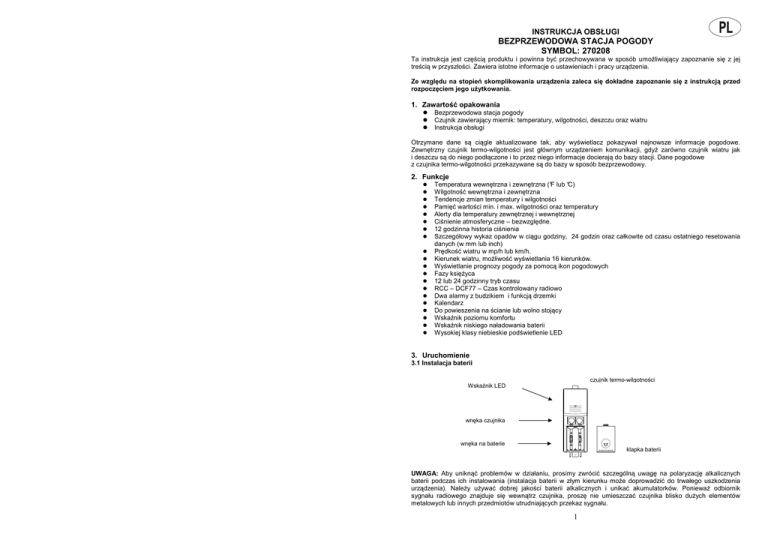 INSTRUKCJA OBSŁUGI BEZPRZEWODOWA STACJA POGODY SYMBOL: 270208 Ta instrukcja jest częścią produktu i powinna być przechowywana w sposób umożliwiający zapoznanie się z jej treścią w przyszłości. Zawiera istotne informacje o ustawieniach i pracy urządzenia. Ze względu na stopień skomplikowania urządzenia zaleca się dokładne zapoznanie się z instrukcją przed rozpoczęciem jego użytkowania. 1. Zawartość opakowania Bezprzewodowa stacja pogody Czujnik zawierający miernik: temperatury, wilgotności, deszczu oraz wiatru Instrukcja obsługi Otrzymane dane są ciągle aktualizowane tak, aby wyświetlacz pokazywał najnowsze informacje pogodowe. Zewnętrzny czujnik termo-wilgotności jest głównym urządzeniem komunikacji, gdyż zarówno czujnik wiatru jak i deszczu są do niego podłączone i to przez niego informacje docierają do bazy stacji. Dane pogodowe z czujnika termo-wilgotności przekazywane są do bazy w sposób bezprzewodowy. 2. Funkcje Temperatura wewnętrzna i zewnętrzna (°F lub °C) Wilgotność wewnętrzna i zewnętrzna Tendencje zmian temperatury i wilgotności Pamięć wartości min. i max. wilgotności oraz temperatury Alerty dla temperatury zewnętrznej i wewnętrznej Ciśnienie atmosferyczne – bezwzględne. 12 godzinna historia ciśnienia Szczegółowy wykaz opadów w ciągu godziny, 24 godzin oraz całkowite od czasu ostatniego resetowania danych (w mm lub inch) Prędkość wiatru w mp/h lub km/h. Kierunek wiatru, możliwość wyświetlania 16 kierunków. Wyświetlanie prognozy pogody za pomocą ikon pogodowych Fazy księżyca 12 lub 24 godzinny tryb czasu RCC – DCF77 – Czas kontrolowany radiowo Dwa alarmy z budzikiem i funkcją drzemki Kalendarz Do powieszenia na ścianie lub wolno stojący Wskaźnik poziomu komfortu Wskaźnik niskiego naładowania baterii Wysokiej klasy niebieskie podświetlenie LED 3. Uruchomienie 3.1 Instalacja baterii czujnik termo-wilgotności Wskaźnik LED wnęka czujnika wnęka na baterie klapka baterii UWAGA: Aby uniknąć problemów w działaniu, prosimy zwrócić szczególną uwagę na polaryzację alkalicznych baterii podczas ich instalowania (instalacja baterii w złym kierunku może doprowadzić do trwałego uszkodzenia urządzenia). Należy używać dobrej jakości baterii alkalicznych i unikać akumulatorków. Ponieważ odbiornik sygnału radiowego znajduje się wewnątrz czujnika, proszę nie umieszczać czujnika blisko dużych elementów metalowych lub innych przedmiotów utrudniających przekaz sygnału. 1 1. Odsunąć obudowanie czujnika termo-wilgotności odsłaniając dwie wnęki (na czujnik wiatru i deszczu). 2. Otworzyć klapkę baterii w czujniku termo-wilgotności poniżej obu wnęk czujnikowych i włożyć dwie baterie alkaliczne AA, 1.5V. Szczegółowa instrukcja montażu czujnika została opisana w następnych punkcie. 3. Otworzyć pokrywę baterii znajdującą się z tyłu stacji bazowej i włożyć 2 baterie alkaliczne AA, 1.5V. Zamontować urządzenia i upewnić się, czy stacja pogody odbiera sygnał z czujnika. Aby mierzyć zewnętrzną temperaturę i wilgotność umieścić czujnik na zewnątrz. Czujnik będzie mierzył i wysyłał pomierzone wartości z miejsca, w którym jest zamontowany. 4. Aby zsynchronizować czujnik ze stacją bazową należy nacisnąć i przytrzymać (przez 3sek) przycisk ALARM znajdujący się z tyłu stacji. Po włożeniu baterii do stacji pogody słychać będzie krótki dźwięk i zapalą się na 3 s wszystkie segmenty wyświetlacza LCD. Stacja rozpocznie synchronizację z bezprzewodowym czujnikiem. UWAGA: Nie naciskać żadnego przycisku przez pierwsze 10 minut działania urządzenia lub dopóki wyświetla ono czas radiowy. Kiedy na wyświetlaczu pojawią się dane pogodowe wraz z czasem radiowym, można umieścić czujnik w miejscu docelowym oraz nastawić czas ręcznie (jeśli nie można otrzymać sygnału drogą radiową). Jeśli na bazie nie pojawia się odczyt temperatury, należy upewnić się że baza i czujnik nie znajdują się zbyt daleko od siebie lub ponownie włożyć baterie. Proszę poczekać 10 sekund przed ponownym włożeniem baterii by zapewnić odpowiedni restart obu elementów. UWAGA: Po zmianie baterii w czujniku, urządzenie zostanie ponownie zsynchronizowane w przeciągu 3 godzin. Aby przyspieszyć czas synchronizacji, należy wyjąć i ponownie włożyć baterie do stacji, aby baza nauczyła się nowego kodu ochronnego, ale wówczas wszystkie ustawienia i zapamiętane dane zostaną utracone. UWAGA dla czasu radiowego DCF: Zegar jest synchronizowany radiowo z nadajnika w Mainflingen pod Frankfurtem i bazuje na Cezowym Zegarze Atomowym, którego odchylenia nie są większe niż jedna sekunda na milion lat. Sygnał DCF-77 nadawany jest na częstotliwości 77.5 MHz i ma zasięg 1500 km. Stacja 270208 odbiera ten sygnał i przetwarza na czytelną godzinę. Tak więc czas wyświetlany na ekranie zegara będącego w zasięgu sygnału DCF-77 jest idealnie dokładny. Czas na stacji pogody można ustawić ręcznie. Należy jednak pamiętać, że stacja pogody będzie szukała sygnału radiowego pomimo ręcznych ustawień. Jeśli to się nie powiedzie, nie ukaże się wprawdzie ikonka czasu radiowego, ale czujnik nadal będzie szukał sygnału radiowego codziennie. W przypadku, gdy zostanie on zarejestrowany, dane odebrane przez czujnik zastąpią dane ustawione przez użytkowania. Szczególną uwagę należy zwrócić na ustawienie odpowiedniej strefy czasowej. Błędny wybór strefy czasowej spowoduje, że dane czasu otrzymane drogą radiową będą nieprawidłowe. Polska znajduje się w strefie czasowej UTC + 1h w czasie zimowym lub w strefie UTC + 2h w czasie letnim. 4. Montaż 1. Stacja bazowa Stacja posiada 2 opcje montażu: − może zostać umieszczona na każdej powierzchni płaskiej. − może zostać powieszona na ścianie za pomocą otworu znajdującego się z tyłu obudowy. Należy sprawdzić, czy baza pobiera dane z czujnika, zanim oba e
