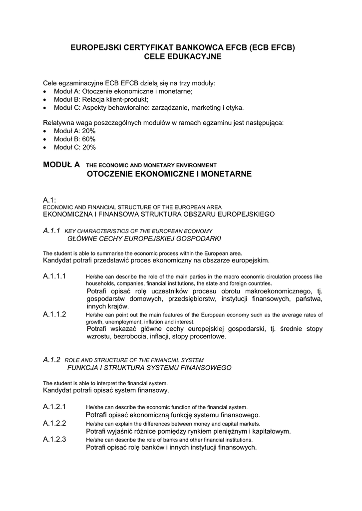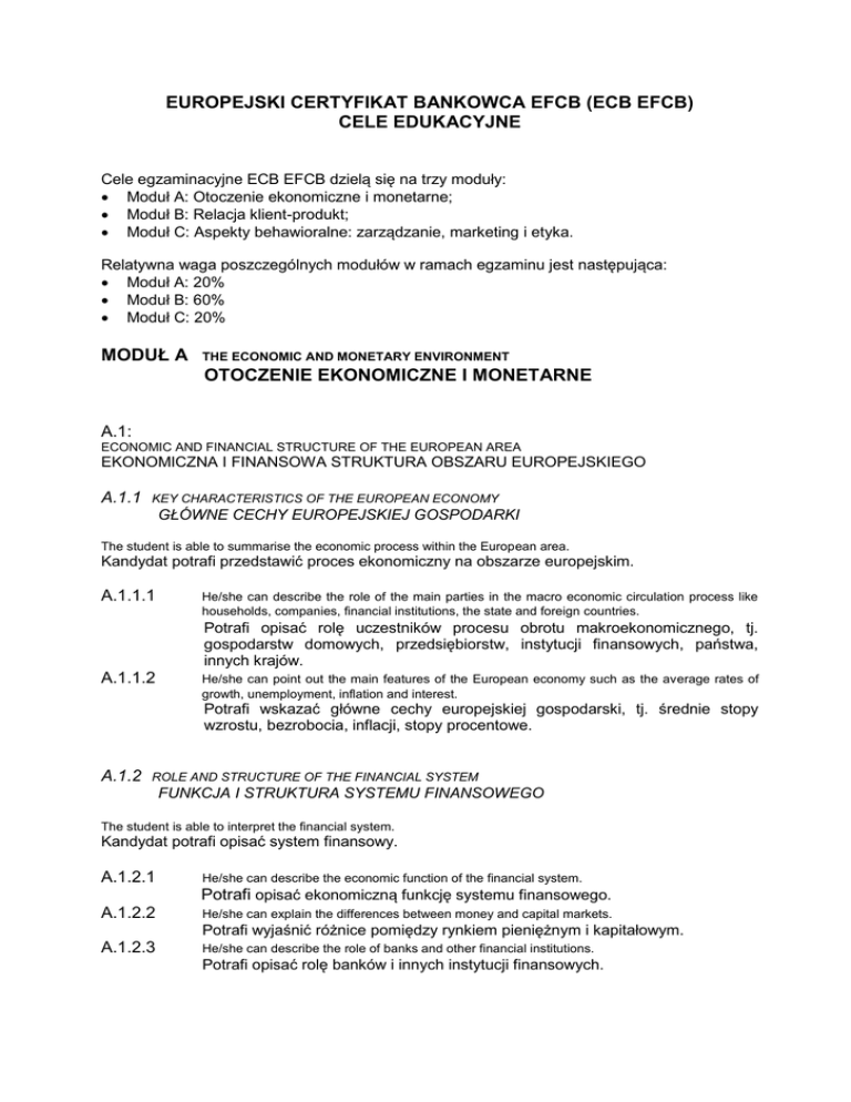 EUROPEJSKI CERTYFIKAT BANKOWCA EFCB (ECB EFCB) CELE EDUKACYJNE Cele egzaminacyjne ECB EFCB dzielą się na trzy moduły: Moduł A: Otoczenie ekonomiczne i monetarne; Moduł B: Relacja klient-produkt; Moduł C: Aspekty behawioralne: zarządzanie, marketing i etyka. Relatywna waga poszczególnych modułów w ramach egzaminu jest następująca: Moduł A: 20% Moduł B: 60% Moduł C: 20% MODUŁ A THE ECONOMIC AND MONETARY ENVIRONMENT OTOCZENIE EKONOMICZNE I MONETARNE A.1: ECONOMIC AND FINANCIAL STRUCTURE OF THE EUROPEAN AREA EKONOMICZNA I FINANSOWA STRUKTURA OBSZARU EUROPEJSKIEGO A.1.1 KEY CHARACTERISTICS OF THE EUROPEAN ECONOMY GŁÓWNE CECHY EUROPEJSKIEJ GOSPODARKI The student is able to summarise the economic process within the European area. Kandydat potrafi przedstawić proces ekonomiczny na obszarze europejskim. A.1.1.1 He/she can describe the role of the main parties in the macro economic circulation process like households, companies, financial institutions, the state and foreign countries. Potrafi opisać rolę uczestników procesu obrotu makroekonomicznego, tj. gospodarstw domowych, przedsiębiorstw, instytucji finansowych, państwa, innych krajów. A.1.1.2 He/she can point out the main features of the European economy such as the average rates of growth, unemployment, inflation and interest. Potrafi wskazać główne cechy europejskiej gospodarski, tj. średnie stopy wzrostu, bezrobocia, inflacji, stopy procentowe. A.1.2 ROLE AND STRUCTURE OF THE FINANCIAL SYSTEM FUNKCJA I STRUKTURA SYSTEMU FINANSOWEGO The student is able to interpret the financial system. Kandydat potrafi opisać system finansowy. A.1.2.1 He/she can describe the economic function of the financial system. Potrafi opisać ekonomiczną funkcję systemu finansowego. A.1.2.2 He/she can explain the differences between money and capital markets. Potrafi wyjaśnić różnice pomiędzy rynkiem pieniężnym i kapitałowym. A.1.2.3 He/she can describe the role of banks and other financial institutions. Potrafi opisać rolę banków i innych instytucji finansowych. Wymogi kwalifikacyjne ECB EFCB w postaci celów egzaminacyjnych A.1.3 THE BANKING ENVIRONMENT IN THE EUROPEAN AREA OTOCZENIE BANKOWE OBSZARU EUROPEJSKIEGO The student is able to describe the context in which European banks operate. Kandydat potrafi opisać kontekst w jakim działają banki europejskie. A.1.3.1 He/she can explain the national banking and financial system, its structure and particularities as well as its relationship with the European banking market. Potrafi opisać narodowy system bankowy i finansowy, jego strukturę i elementy, a także jego powiązania z europejskim rynkiem bankowym. A.1.3.2 He/she can identify the impact of EU directives concerning banking regulation. Potrafi zidentyfikować wpływ dyrektyw UE na regulacje bankowe. A.1.3.3 He/she can explain the role and functions of the supervisory authority or authorities respectively within the national banking regulatory system. Potrafi wytłumaczyć rolę i funkcje władz nadzorczych i innych w ramach narodowego bankowego systemu regulacyjnego. A.1.3.4 The student is also able to describe the main provisions of the New Basel Capital Accord (NBCA, June 2004) and its impact on the European banking sector. Potrafi określić główne klauzule Nowej Umowy Kapitałowej z Bazylei (NBCA, czerwiec 2004). A.1.3.5 The student can explain in general terms the relationship and influences of the global market on Europe. Potrafi ogólnie wytłumaczyć związki i wpływ rynku światowego na rynek europejski. A.1.3.6 The student is able to describe the main characteristics of the Single Euro Payment Area (SEPA) Potrafi określić główne cechy Jednolitego Obszaru Płatniczego w Euro (SEPA). A.2: MONETARY POLICY IN THE EUROPEAN AREA POLITYKA MONETARNA NA OBSZARZE EUROPEJSKIM A.2.1 THE EURO SYSTEM EUROSYSTEM The student is able to describe the monetary system related to the euro. Kandydat potrafi opisać system monetarny w odniesieniu do euro. A.2.1.1 He/she can define the three general functions of money and depict at least one of them. Potrafi zdefiniować trzy główne funkcje pieniądza i opisać przynajmniej jedną z nich. A.2.1.2 He/she can name in general the functions of central banks. Potrafi wymienić główne funkcje banku centralnego. A.2.1.3 He/she can explain the reasons why the central bank has become independent from the government. Potrafi wymienić powody uniezależnienia się banku centralnego od rządu. A.2.1.4 He/she can classify the objectives of the EMU. A.2.1.5 He/she can point out the relationship between the ECB, the ESCB and the Eurosystem. Potrafi sklasyfikować cele EUM. Potrafi wskazać zależności pomiędzy EBC, ESBC i Eurosystemem. 2 wersja_2009 Wymogi kwalifikacyjne ECB EFCB w postaci celów egzaminacyjnych A.2.1.6 He/she can name the two decision making bodies of the ECB and describe the difference between them. Potrafi wskazać dwa ciała decyzyjne EBC i opisać różnice pomiędzy nimi. A.2.1.7 He/she can recite the ECB’s definition of price stability. Potrafi przedstawić definicję stabilności ceny określoną przez EBC. A.2.1.8 He/she can describe the difference between the first and the second pillar of the ECB’s monetary policy strategy. Potrafi opisać różnice pomiędzy pierwszym i drugim filarem strategii polityki monetarnej EBC. A.2.1.9 He/she can name the three operational tools of the ECB for monetary policy implementation. Potrafi wymienić trzy narzędzia operacyjne EBC służące do wdrażania polityki monetarnej. A.2.1.10 He/she can name the three kinds of interest rates that compose the so-called ‘corridor’ on the money market in the Eurozone. Potrafi wymienić trzy rodzaje stop procentowych, które składają się na tzw. „korytarz” na rynku pieniężnym w strefie euro. A.2.1.11 He/she can describe the current state of monetary policy in the Euro Area. Potrafi opisać stan obecny polityki monetarnej w strefie euro. A.2.2 NATIONAL MONETARY SY