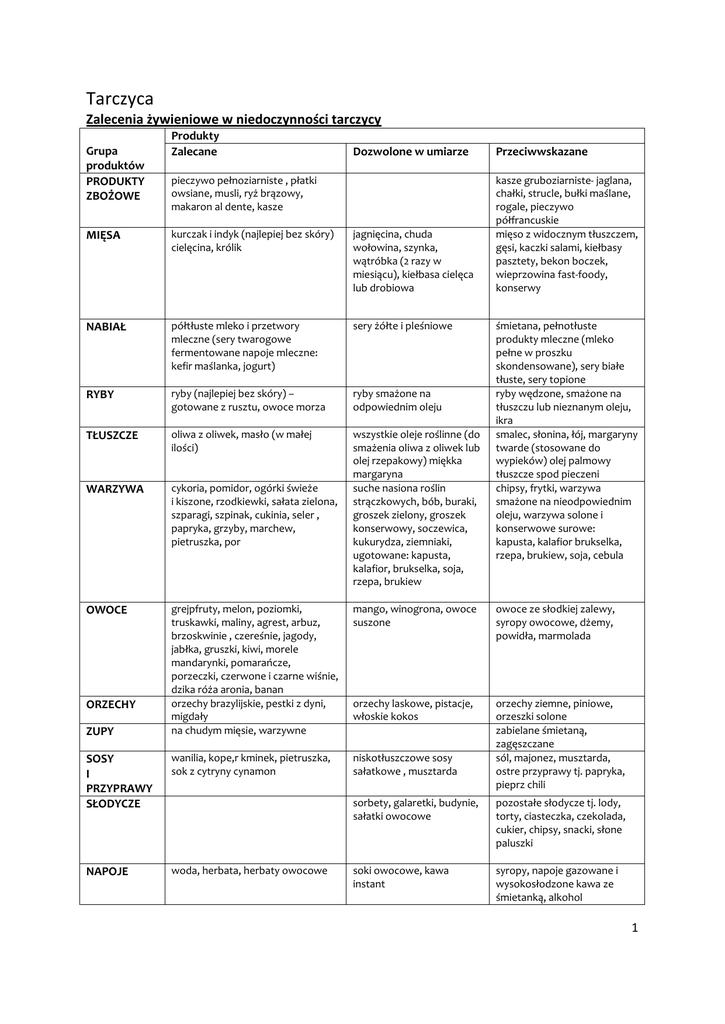 Tarczyca Zalecenia żywieniowe w niedoczynności tarczycy Grupa produktów PRODUKTY ZBOŻOWE Produkty Zalecane Dozwolone w umiarze Przeciwwskazane kasze gruboziarniste- jaglana, chałki, strucle, bułki maślane, rogale, pieczywo półfrancuskie mięso z widocznym tłuszczem, gęsi, kaczki salami, kiełbasy pasztety, bekon boczek, wieprzowina fast-foody, konserwy pieczywo pełnoziarniste , płatki owsiane, musli, ryż brązowy, makaron al dente, kasze MIĘSA kurczak i indyk (najlepiej bez skóry) cielęcina, królik jagnięcina, chuda wołowina, szynka, wątróbka (2 razy w miesiącu), kiełbasa cielęca lub drobiowa NABIAŁ półtłuste mleko i przetwory mleczne (sery twarogowe fermentowane napoje mleczne: kefir maślanka, jogurt) sery żółte i pleśniowe RYBY ryby (najlepiej bez skóry) – gotowane z rusztu, owoce morza ryby smażone na odpowiednim oleju TŁUSZCZE oliwa z oliwek, masło (w małej ilości) WARZYWA cykoria, pomidor, ogórki świeże i kiszone, rzodkiewki, sałata zielona, szparagi, szpinak, cukinia, seler , papryka, grzyby, marchew, pietruszka, por wszystkie oleje roślinne (do smażenia oliwa z oliwek lub olej rzepakowy) miękka margaryna suche nasiona roślin strączkowych, bób, buraki, groszek zielony, groszek konserwowy, soczewica, kukurydza, ziemniaki, ugotowane: kapusta, kalafior, brukselka, soja, rzepa, brukiew OWOCE grejpfruty, melon, poziomki, truskawki, maliny, agrest, arbuz, brzoskwinie , czereśnie, jagody, jabłka, gruszki, kiwi, morele mandarynki, pomarańcze, porzeczki, czerwone i czarne wiśnie, dzika róża aronia, banan orzechy brazylijskie, pestki z dyni, migdały na chudym mięsie, warzywne mango, winogrona, owoce suszone owoce ze słodkiej zalewy, syropy owocowe, dżemy, powidła, marmolada orzechy laskowe, pistacje, włoskie kokos SOSY I PRZYPRAWY SŁODYCZE wanilia, kope,r kminek, pietruszka, sok z cytryny cynamon niskotłuszczowe sosy sałatkowe , musztarda orzechy ziemne, piniowe, orzeszki solone zabielane śmietaną, zagęszczane sól, majonez, musztarda, ostre przyprawy tj. papryka, pieprz chili NAPOJE woda, herbata, herbaty owocowe ORZECHY ZUPY śmietana, pełnotłuste produkty mleczne (mleko pełne w proszku skondensowane), sery białe tłuste, sery topione ryby wędzone, smażone na tłuszczu lub nieznanym oleju, ikra smalec, słonina, łój, margaryny twarde (stosowane do wypieków) olej palmowy tłuszcze spod pieczeni chipsy, frytki, warzywa smażone na nieodpowiednim oleju, warzywa solone i konserwowe surowe: kapusta, kalafior brukselka, rzepa, brukiew, soja, cebula sorbety, galaretki, budynie, sałatki owocowe pozostałe słodycze tj. lody, torty, ciasteczka, czekolada, cukier, chipsy, snacki, słone paluszki soki owocowe, kawa instant syropy, napoje gazowane i wysokosłodzone kawa ze śmietanką, alkohol 1 Podstawowe zalecenia postępowania przy niedoczynności tarczycy 1. Jedz regularnie 4-5 posiłków dziennie, nie pomijając śniadania. Posiłki powinny byd spożywane regularnie co 2,5 do 4 godzin. 2. Codzienne pożywienie powinno zawierad zarówno żywnośd pochodzenia roślinnego jak i zwierzęcego. 3. Codziennie spożywaj produkty zbożowe, jedz produkty gruboziarniste, razowe. 4. Do wszystkich posiłków dodawaj warzywa lub owoce. 5. Trzy razy dziennie spożywaj mleko i jego przetwory (sery, jogurty, kefiry), najlepiej o obniżonej zawartości tłuszczu( light zabronione). 6. Chude mięso jedz do 3 razy w tygodniu, w pozostałe dni wybieraj dania z ryb lub roślin strączkowych (fasola, groch). 7. Tłuszcze zwierzęce (masło, smalec) zastępuj tłuszczami roślinnymi (margaryny, oliwa z oliwek, oleje roślinne). 8. Ograniczaj spożycie soli kuchennej do mniej niż 1 płaskiej łyżeczki na dzieo. 9. Zachowaj umiar w spożyciu cukru. Słodycze zastępuj owocami. 10. Należy wypijad około 2 litrów płynów obojętnych dziennie (wody, herbat owocowych, ziołowych, zielonych). Należy wybierad te wody mineralne, które zawierają jod. 11. Należy spożywad produkty bogate w jod, który jest pierwiastkiem niezbędnym do prawidłowego funkcjonowania tarczycy. Duże ilości jodu dostarczają ryby morskie i owoce morza. Ryby powinny byd spożywane minimum 2 razy w tygodniu. 12. Ważne jest również dostarczenie organizmowi, wspomagają wchłanianie jodu: cynku - (występuje w mięsie drobiowym oraz skorupiakach), witaminy E – (w dużej ilości występuje w bananach i mięsie łososia) selen - (zawarty w orzechach i produktach zbożowych). 13. Przy niedoczynności tarczycy niekorzystne jest spożywanie niestepujących warzyw: kapusta, kalafior, brukselka, soja, fasola, groch, cebula, rzepa oraz brukiew, orzechy ziemne i gorczyca ponieważ zmniejszają one przyswajanie jodu z pożywienia. 14. Korzystne jest natomiast spożywanie dużych ilości pomidorów, szparagów i jarmużu. 18. Dozwolone formy obróbki kulinarnej: gotowanie w wodzie lub na parze, duszenie bez tłuszczu, czy pieczenie w kombiwarze. Tłuszcz można dodawad do już gotowych potraw. Należy unikad smażenia i tradycyjnego pieczenia. Ze względu na zwiększone tempo przemian metabolicznych, a co za tym idzie duże ryzyko powstania niedoborów, w diecie osób z nadczynnością tarczycy zaleca się: * Zwiększyd ilośd warzyw i owoców bogatych w antyoksydanty ponieważ przy nadczynności tarczycy zwiększa się ilośd przyspieszających starzenie się skóry i uszkadzających komórki wolnych rodników. Silne antyoksydanty to witaminy A, C i E. *Zwiększyd podaż witamin z grupy B które "uspokajają" układ nerwowy oraz wzmacniającego kości wapnia. *Unikanie potraw nadmiernie obciążających układ pokarmowy czyli wzdymających, tłustych, smażonych (krótkie podsmażanie jest dozwolone). *Mocno ograniczyd kawę i mocną herbatę (pobudzają i tak już nadmiernie pobudzony układ nerwowy). *W przypadku występowania biegunek unikanie potraw o dużej zawartości błonnika np. gruboziarnistych kasz ( porozmawiaj ze swoim lekarzem prowadzącym ) 2 Modyfikacja sty