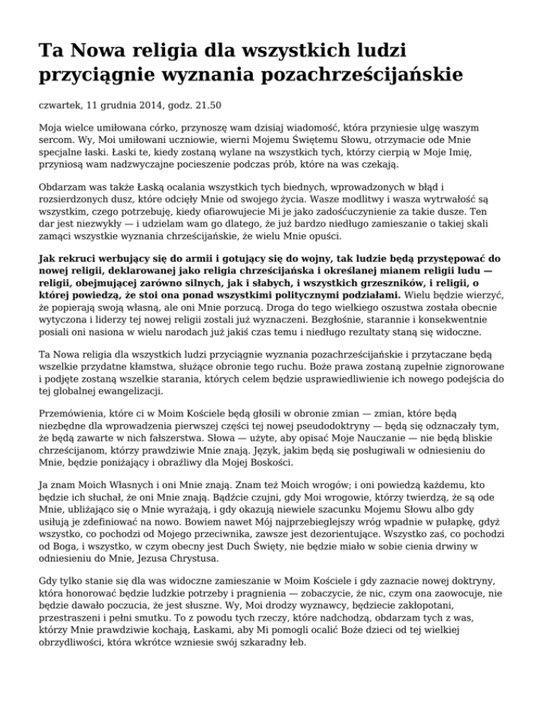Ta Nowa religia dla wszystkich ludzi przyciągnie wyznania pozachrześcijańskie czwartek, 11 grudnia 2014, godz. 21.50 Moja wielce umiłowana córko, przynoszę wam dzisiaj wiadomość, która przyniesie ulgę waszym sercom. Wy, Moi umiłowani uczniowie, wierni Mojemu Świętemu Słowu, otrzymacie ode Mnie specjalne łaski. Łaski te, kiedy zostaną wylane na wszystkich tych, którzy cierpią w Moje Imię, przyniosą wam nadzwyczajne pocieszenie podczas prób, które na was czekają. Obdarzam was także Łaską ocalania wszystkich tych biednych, wprowadzonych w błąd i rozsierdzonych dusz, które odcięły Mnie od swojego życia. Wasze modlitwy i wasza wytrwałość są wszystkim, czego potrzebuję, kiedy ofiarowujecie Mi je jako zadośćuczynienie za takie dusze. Ten dar jest niezwykły — i udzielam wam go dlatego, że już bardzo niedługo zamieszanie o takiej skali zamąci wszystkie wyznania chrześcijańskie, że wielu Mnie opuści. Jak rekruci werbujący się do armii i gotujący się do wojny, tak ludzie będą przystępować do nowej religii, deklarowanej jako religia chrześcijańska i określanej mianem religii ludu — religii, obejmującej zarówno silnych, jak i słabych, i wszystkich grzeszników, i religii, o której powiedzą, że stoi ona ponad wszystkimi politycznymi podziałami. Wielu będzie wierzyć, że popierają swoją własną, ale oni Mnie porzucą. Droga do tego wielkiego oszustwa została obecnie wytyczona i liderzy tej nowej religii zostali już wyznaczeni. Bezgłośnie, starannie i konsekwentnie posiali oni nasiona w wielu narodach już jakiś czas temu i niedługo rezultaty staną się widoczne. Ta Nowa religia dla wszystkich ludzi przyciągnie wyznania pozachrześcijańskie i przytaczane będą wszelkie przydatne kłamstwa, służące obronie tego ruchu. Boże prawa zostaną zupełnie zignorowane i podjęte zostaną wszelkie starania, których celem będzie usprawiedliwienie ich nowego podejścia do tej globalnej ewangelizacji. Przemówienia, które ci w Moim Kościele będą głosili w obronie zmian — zmian, które będą niezbędne dla wprowadzenia pierwszej części tej nowej pseudodoktryny — będą się odznaczały tym, że będą zawarte w nich fałszerstwa. Słowa — użyte, aby opisać Moje Nauczanie — nie będą bliskie chrześcijanom, którzy prawdziwie Mnie znają. Język, jakim będą się posługiwali w odniesieniu do Mnie, będzie poniżający i obraźliwy dla Mojej Boskości. Ja znam Moich Własnych i oni Mnie znają. Znam też Moich wrogów; i oni powiedzą każdemu, kto będzie ich słuchał, że oni Mnie znają. Bądźcie czujni, gdy Moi wrogowie, którzy twierdzą, że są ode Mnie, ubliżająco się o Mnie wyrażają, i gdy okazują niewiele szacunku Mojemu Słowu albo gdy usiłują je zdefiniować na nowo. Bowiem nawet Mój najprzebieglejszy wróg wpadnie w pułapkę, gdyż wszystko, co pochodzi od Mojego przeciwnika, zawsze jest dezorientujące. Wszystko zaś, co pochodzi od Boga, i wszystko, w czym obecny jest Duch Święty, nie będzie miało w sobie cienia drwiny w odniesieniu do Mnie, Jezusa Chrystusa. Gdy tylko stanie się dla was widoczne zamieszanie w Moim Kościele i gdy zaznacie nowej doktryny, która honorować będzie ludzkie potrzeby i pragnienia — zobaczycie, że nic, czym ona zaowocuje, nie będzie dawało poczucia, że jest słuszne. Wy, Moi drodzy wyznawcy, będziecie zakłopotani, przestraszeni i pełni smutku. To z powodu tych rzeczy, które nadchodzą, obdarzam tych z was, którzy Mnie prawdziwie kochają, Łaskami, aby Mi pomogli ocalić Boże dzieci od tej wielkiej obrzydliwości, która wkrótce wzniesie swój szkaradny łeb. Przyjmijcie Moje Dary; Moją Obietnicę, że wam pomogę i was poprowadzę. Moje Słowo zostało dane ludzkości dawno temu. Słowo nie jest nowe. Człowiek, który coś do niego dodaje i je zmienia, będzie ogromnie cierpieć. Zostało to przepowiedziane w Świętej Biblii i teraz dokładnie to się wydarzy. Moje Słowo zostanie zmanipulowane przez Mojego przeciwnika, a świat przełknie kłamstwa, które będą tego rezultatem. Wasz Jezus