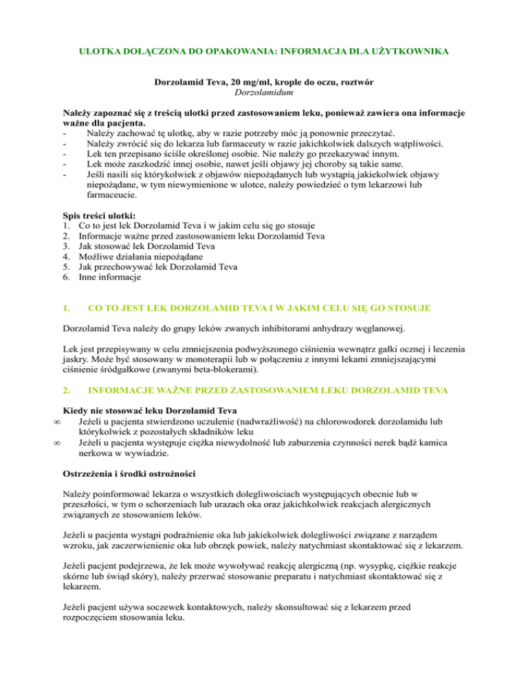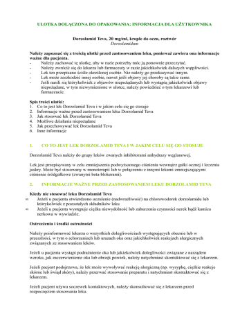 ULOTKA DOŁĄCZONA DO OPAKOWANIA: INFORMACJA DLA UśYTKOWNIKA Dorzolamid Teva, 20 mg/ml, krople do oczu, roztwór Dorzolamidum NaleŜy zapoznać się z treścią ulotki przed zastosowaniem leku, poniewaŜ zawiera ona informacje waŜne dla pacjenta. NaleŜy zachować tę ulotkę, aby w razie potrzeby móc ją ponownie przeczytać. NaleŜy zwrócić się do lekarza lub farmaceuty w razie jakichkolwiek dalszych wątpliwości. Lek ten przepisano ściśle określonej osobie. Nie naleŜy go przekazywać innym. Lek moŜe zaszkodzić innej osobie, nawet jeśli objawy jej choroby są takie same. Jeśli nasili się którykolwiek z objawów niepoŜądanych lub wystąpią jakiekolwiek objawy niepoŜądane, w tym niewymienione w ulotce, naleŜy powiedzieć o tym lekarzowi lub farmaceucie. Spis treści ulotki: 1. Co to jest lek Dorzolamid Teva i w jakim celu się go stosuje 2. Informacje waŜne przed zastosowaniem leku Dorzolamid Teva 3. Jak stosować lek Dorzolamid Teva 4. MoŜliwe działania niepoŜądane 5. Jak przechowywać lek Dorzolamid Teva 6. Inne informacje 1. CO TO JEST LEK DORZOLAMID TEVA I W JAKIM CELU SIĘ GO STOSUJE Dorzolamid Teva naleŜy do grupy leków zwanych inhibitorami anhydrazy węglanowej. Lek jest przepisywany w celu zmniejszenia podwyŜszonego ciśnienia wewnątrz gałki ocznej i leczenia jaskry. MoŜe być stosowany w monoterapii lub w połączeniu z innymi lekami zmniejszającymi ciśnienie śródgałkowe (zwanymi beta-blokerami). 2. INFORMACJE WAśNE PRZED ZASTOSOWANIEM LEKU DORZOLAMID TEVA Kiedy nie stosować leku Dorzolamid Teva JeŜeli u pacjenta stwierdzono uczulenie (nadwraŜliwość) na chlorowodorek dorzolamidu lub którykolwiek z pozostałych składników leku • JeŜeli u pacjenta występuje cięŜka niewydolność lub zaburzenia czynności nerek bądź kamica nerkowa w wywiadzie. • OstrzeŜenia i środki ostroŜności NaleŜy poinformować lekarza o wszystkich dolegliwościach występujących obecnie lub w przeszłości, w tym o schorzeniach lub urazach oka oraz jakichkolwiek reakcjach alergicznych związanych ze stosowaniem leków. JeŜeli u pacjenta wystąpi podraŜnienie oka lub jakiekolwiek dolegliwości związane z narządem wzroku, jak zaczerwienienie oka lub obrzęk powiek, naleŜy natychmiast skontaktować się z lekarzem. JeŜeli pacjent podejrzewa, Ŝe lek moŜe wywoływać reakcję alergiczną (np. wysypkę, cięŜkie reakcje skórne lub świąd skóry), naleŜy przerwać stosowanie preparatu i natychmiast skontaktować się z lekarzem. JeŜeli pacjent uŜywa soczewek kontaktowych, naleŜy skonsultować się z lekarzem przed rozpoczęciem stosowania leku. Dzieci Przeprowadzono badania dotyczące stosowania dorzolamidu u niemowląt i dzieci poniŜej 6 roku Ŝycia z podwyŜszonym ciśnieniem śródgałkowym lub stwierdzoną jaskrą. W celu uzyskania dalszych informacji naleŜy skontaktować się z lekarzem. Stosowanie leku u pacjentów w podeszłym wieku W badaniach stwierdzono podobne działanie dorzolamidu u pacjentów w podeszłym wieku oraz osób młodszych. Stosowanie leku u pacjentów z niewydolnością wątroby JeŜeli u pacjenta występują lub występowały jakiekolwiek dolegliwości wątroby, naleŜy skontaktować się z lekarzem. Inne leki i Dorzolamid Teva NaleŜy powiedzieć lekarzowi o wszystkich przyjmowanych ostatnio lekach (takŜe o kroplach do oczu), równieŜ tych, które wydawane są bez recepty, szczególnie innych inhibitorach anhydrazy węglanowej, jak acetazolamid lub sulfonamidy. CiąŜa i karmienie piersią Przed zastosowaniem kaŜdego leku naleŜy poradzić się lekarza lub farmaceuty. CiąŜa Nie naleŜy stosować leku podczas ciąŜy. JeŜeli pacjentka jest w ciąŜy lub planuje ciąŜę, naleŜy skontaktować się z lekarzem. Karmienie piersią Nie zaleca się karmienia piersią w przypadku konieczności leczenia dorzolamidem. NaleŜy poinformować lekarza, jeśli pacjentka karmi piersią lub zamierza karmić piersią. Prowadzenie pojazdów i obsługiwanie maszyn Nie przeprowadzono badań dotyczących wpływu produktu na zdolność prowadzenia pojazdów lub obsługiwania maszyn. Niektóre działania niepoŜądane leku, np. zawroty głowy lub niewyraźne widzenie, mogą wpływać na zdolność prowadzenia pojazdów i (lub) obsługiwania maszyn. Nie naleŜy prowadzić pojazdów ani obsługiwać maszyn do czasu ustąpienia tych objawów. WaŜne informacje o niektórych składnikach leku Dorzolamid Teva Preparat zawiera środek konserwujący - chlorek benzalkonium. Środek ten moŜe osadzać się w miękkich soczewkach kontaktowych i powodować ich odbarwienie. JeŜeli pacjent uŜywa miękkich soczewek, naleŜy skontaktować się z lekarzem przed zastosowaniem leku. Istotne jest, by soczewki zostały zdjęte przed zastosowaniem kropli do oczu i nie były zakładane w ciągu 15 minut po ich wkropleniu. Wszelkie wątpliwości zostaną wyjaśnione przez lekarza. 3. JAK STOSOWAĆ LEK DORZOLAMID TEVA Lek naleŜy zawsze stosować zgodnie z zaleceniami lekarza. W przypadku wątpliwości naleŜy ponownie skontaktować się z lekarzem lub farmaceutą. Odpowiednie dawkowanie i czas trwania leczenia zostaną określone przez lekarza. W przypadku stosowania leku w monoterapii, zazwyczaj zalecana dawka to jedna kropla leku podawana do chorego oka (oczu) rano, po południu i wieczorem. JeŜeli lekarz zaleci stosowanie leku w skojarzeniu z beta-blokerem w postaci kropli do oczu zmniejszających ciśnienie śródgałkowe, zalecana dawka to jedna kropla leku Dorzolamid Teva, podawana do chorego oka (oczu) rano i wieczorem. JeŜeli lek stosowany jest jednocześnie z innymi kroplami do oczu, naleŜy zastosować co najmniej dziesięciominutowy odstęp pomiędzy wkropleniem kolejnych leków. Nie naleŜy zmieniać dawki leku bez konsultacji z lekarzem. NaleŜy unikać kontaktu końcówki zakraplacza z okiem lub powierzchnią otaczającą oko. Na końcówce mogą być obecne bakterie, mogące powodować stany zapalne oka prowadzące do powaŜnych us