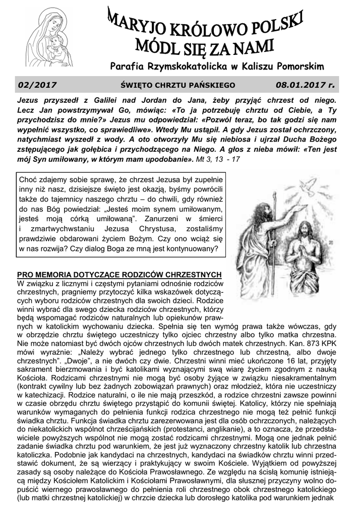 Parafia Rzymskokatolicka w Kaliszu Pomorskim 02/2017 ŚWIĘTO CHRZTU PAŃSKIEGO 08.01.2017 r. Jezus przyszedł z Galilei nad Jordan do Jana, żeby przyjąć chrzest od niego. Lecz Jan powstrzymywał Go, mówiąc: «To ja potrzebuję chrztu od Ciebie, a Ty przychodzisz do mnie?» Jezus mu odpowiedział: «Pozwól teraz, bo tak godzi się nam wypełnić wszystko, co sprawiedliwe». Wtedy Mu ustąpił. A gdy Jezus został ochrzczony, natychmiast wyszedł z wody. A oto otworzyły Mu się niebiosa i ujrzał Ducha Bożego zstępującego jak gołębica i przychodzącego na Niego. A głos z nieba mówił: «Ten jest mój Syn umiłowany, w którym mam upodobanie». Mt 3, 13 - 17 Choć zdajemy sobie sprawę, że chrzest Jezusa był zupełnie inny niż nasz, dzisiejsze święto jest okazją, byśmy powrócili także do tajemnicy naszego chrztu – do chwili, gdy również do nas Bóg powiedział: „Jesteś moim synem umiłowanym, jesteś moją córką umiłowaną”. Zanurzeni w śmierci i zmartwychwstaniu Jezusa Chrystusa, zostaliśmy prawdziwie obdarowani życiem Bożym. Czy ono wciąż się w nas rozwija? Czy dialog Boga ze mną jest kontynuowany? PRO MEMORIA DOTYCZĄCE RODZICÓW CHRZESTNYCH W związku z licznymi i częstymi pytaniami odnośnie rodziców chrzestnych, pragniemy przytoczyć kilka wskazówek dotyczących wyboru rodziców chrzestnych dla swoich dzieci. Rodzice winni wybrać dla swego dziecka rodziców chrzestnych, którzy będą wspomagać rodziców naturalnych lub opiekunów prawnych w katolickim wychowaniu dziecka. Spełnia się ten wymóg prawa także wówczas, gdy w obrzędzie chrztu świętego uczestniczy tylko ojciec chrzestny albo tylko matka chrzestna. Nie może natomiast być dwóch ojców chrzestnych lub dwóch matek chrzestnych. Kan. 873 KPK mówi wyraźnie: „Należy wybrać jednego tylko chrzestnego lub chrzestną, albo dwoje chrzestnych”. „Dwoje”, a nie dwóch czy dwie. Chrzestni winni mieć ukończone 16 lat, przyjęty sakrament bierzmowania i być katolikami wyznającymi swą wiarę życiem zgodnym z nauką Kościoła. Rodzicami chrzestnymi nie mogą być osoby żyjące w związku niesakramentalnym (kontrakt cywilny lub bez żadnych zobowiązań prawnych) oraz młodzież, która nie uczestniczy w katechizacji. Rodzice naturalni, o ile nie mają przeszkód, a rodzice chrzestni zawsze powinni w czasie obrzędu chrztu świętego przystąpić do komunii świętej. Katolicy, którzy nie spełniają warunków wymaganych do pełnienia funkcji rodzica chrzestnego nie mogą też pełnić funkcji świadka chrztu. Funkcja świadka chrztu zarezerwowana jest dla osób ochrzczonych, należących do niekatolickich wspólnot chrześcijańskich (protestanci, anglikanie), a to oznacza, że przedstawiciele powyższych wspólnot nie mogą zostać rodzicami chrzestnymi. Mogą one jednak pełnić zadanie świadka chrztu pod warunkiem, że jest już wyznaczony chrzestny katolik lub chrzestna katoliczka. Podobnie jak kandydaci na chrzestnych, kandydaci na świadków chrztu winni przedstawić dokument, że są wierzący i praktykujący w swoim Kościele. Wyjątkiem od powyższej zasady są osoby należące do Kościoła Prawosławnego. Ze względu na ścisłą komunię istniejącą między Kościołem Katolickim i Kościołami Prawosławnymi, dla słusznej przyczyny wolno dopuścić wiernego prawosławnego do pełnienia roli chrzestnego obok chrzestnego katolickiego (lub matki chrzestnej katolickiej) w chrzcie dziecka lub dorosłego katolika pod warunkiem jednak wystarczającego zabezpieczenia edukacji ochrzczonego oraz wiedzy o tym, że dany chrzestny nadaje się do tej roli. Drodzy Rodzice Chrzestni, Wasza rola nigdy nie polega, a przynajmniej polegać nie powinna, na zastępowaniu i wyręczaniu rodziców naturalnych. Zaistnieją jednak sytuacje, kiedy to rodzice poczują się osamotnieni, a może i bezradni w określonych trudnościach, kiedy to będzie należało podjąć ważną dla dziecka decyzję życiową. I wtedy w ich horyzoncie myślowym winny pojawić się sylwetki rodziców chrzestnych. Rodzice chrzestni to swego rodzaju mężowie zaufania w życiu rodzinnym. Zdaniem wielu duszpasterzy dobór rodziców chrzestnych w licznych wypadkach odbywa się na zasadzie pokrewieństwa, związków przyjacielskich, bądź też bierze się pod uwagę zamożność tych osób, aby zapewnić doczesny byt dziecku. Brakuje natomiast niezmiernie często odniesienia religijnego, nie mówiąc o poziomie wiary i zaangażowania we wspólnocie Kościoła rodziców chrzestnych. Ileż bywa nieporozumień w tym względzie, kiedy pada pytanie duszpasterza, czy kandydaci na matkę chrzestną i ojca chrzestnego to ludzie wierzący i praktykujący. Życie uczy, że wydawane zaświadczenia w tym względzie nie oddają w pełni obrazu ludzi mających podjąć ciężar pomocy wychowania religijnego dziecka. Chrzestny ma więc pomóc podopiecznemu poznawać słowo Boże. Najlepiej, gdy to słowo Boże jest wcielone w niego, w nim żyje…. Moi Drodzy, z racji tego, że dzisiaj obchodzimy Święto Chrztu Pańskiego, pragnę poruszyć kwestie znaczenia sakramentu chrztu i naszego odnoszenia się do niego. Czy naprawdę jesteśmy praktykującymi katolikami i czym dla katolika jest jego własny chrzest? Większość z nas ochrzczono we wczesnym dzieciństwie, nie mamy z tego wydarzenia żadnych wspomnień (prócz fotografii). Byliśmy małymi, rozdartymi, kilkumiesięcznymi dziećmi. Czasem słyszy się opinie, że chrzest powinna przyjmować osoba dorosła, świadoma swych wyborów, bo to właśnie osoba dorosła intencjonalnie (synonim słowa „świadomie” – nieprzypadkowo, z pełną świadomością) wybiera i kontynuuje drogę wiary. W tych postulatach pomija się jednak najważniejsze aspekty chrztu - zbawienną dla człowieka moc wylania Ducha Świętego i zgładzenia grzechu pierworodnego. Patrząc na postępowanie wielu osób można by pomyśleć, iż chrzest był w ich życiu tylko pewną formalno