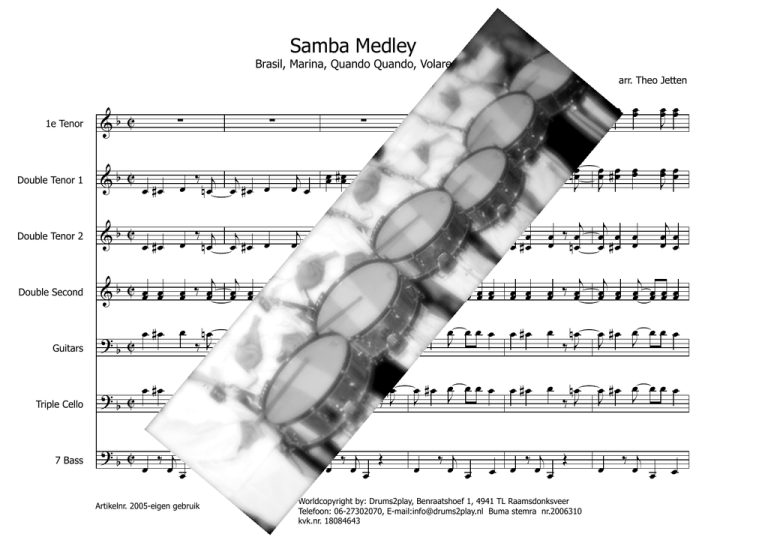 Samba Medley Brasil, Marina, Quando Quando, Volare arr. Theo Jetten 1e Tenor &b C Double Tenor 1 &b C ‰ j j œ #œ œ nœ œ #œ œ Double Tenor 2 &b C ‰ j j œ #œ œ nœ œ #œ œ Double Second Guitars Triple Cello 7 Bass ∑ ∑ j j C b ‰ œ œ œ œ & œ œ œ œ œœ œœ œœ ∑ ∑ j œœ # œœ œœ ‰ n œœ œ œ J œœ # œœ œœ J j œ œ œ ‰ œj œj œ œ œ œ œ #œ œ nœ œ #œ œ œœ œœ œœ œœ ‰J œœ œœ œœ J œœ œœ J œœ œœ œœ # œœ œœ ‰ n œœ J J œœ # œœ œœ J œœ œœ J j œœ œœ œœ # œœ j j œœ ‰ œ œ œ œœ nœ œ #œ j œœ œ œ j j j j j j j œœ œœ œœ œœ œœ ‰ œœ œœ œœ œœ œœ œœ œœ œœ œœ œœ ‰ œœ œœ œœ œœ œœ œœ œœ œ nœ ? b C œ #œ ‰J œ #œ œ J œ œ œ #œ œ nœ J ‰J œ # œ œJ œ œ œ œ # œ œ n œ J ‰J œ # œ Jœ œ œ œ J œ nœ ? b C œ #œ ‰J œ #œ œ J œ œ œ #œ œ nœ J ‰J œ # œ œJ œ œ œ œ # œ œ n œ J ‰J œ # œ Jœ œ œ œ J ?b C œ œ ‰ j Œ œ œ Artikelnr. 2005-eigen gebruik ‰ j œ œ œ œ ‰ j Œ œ œ œ ‰ j œ œ œ œ ‰ j Œ œ œ Worldcopyright by: Drums2play, Benraatshoef 1, 4941 TL Raamsdonksveer Telefoon: 06-27302070, E-mail:[email protected] Buma stemra nr.2006310 kvk.nr. 18084643 œ ‰ j œ œ œ 2 7 1e Ten 7 DT 1 œœ œœ œ b Œ Œ œœ œ Œ & ˙ w w œ œ œ œ œ œ œœ œ J J w w œ œ œ œ œ œ j j œœ œ w œ#œ œ ‰ nœ J œ #œ œ J œ#œ œ ‰ nœ J œ #œ œ J œœ J 7 & b œœ Œ Œ œœ œœ œœ Œ ˙ 7 & b œœ Œ Œ œœ œœ œœ Œ Ó œœ œœ j j j œœ ‰ œœ œœ œœ œœ œœ œœ œœ œœ œœ œ nœ ‰J œ # œ Jœ œ œ œ J œ#œ ?b œ Œ Œ œœ œ Œ Ó œ#œ œ nœ ‰J œ # œ Jœ œ œ œ J œ#œ DT 2 DS 7 Gtrs 7 Trp C 7 7 Bss œœ œ b Œ Œ œ œ Œ ˙ & "Brasil" ? b œœ Œ Œ œœ œœ œœ Œ Ó ?b œ Œ Œ œœ œ Œ Ó œ#œ œ ‰ j Œ œ œ œ w œ ‰ nœ J œœ J œ #œ j j j œœ ‰ œœ œœ œœ œœ œœ œœ œœ œ nœ ‰J œ #œ œ J œœ J œœ œœ j œœ ‰ œœ œ nœ ‰ J œ #œ œ J œœ J œ #œ œ ‰ j ‰ j Œ œ œ œ œ œ œ Worldcopyright by: drums2play œ ‰ j œ œ œ œ #œ œ nœ ‰J nœ ‰J j Œ œ ‰œ œ w œ œ œ œ œ œ œ J œ œ J w w œ œ œ œ &b w œ œ œ œ œ œ j œ œ j œ w w œ œ œ œ œ ‰ nœ J œ #œ J &b 14 1e Ten 14 DT 1 œ & b œJ # œ 14 DT 2 j b œ & œ œœ œœ 14 DS œ #œ œ ?b J 14 Gtrs œ #œ œ ?b J 14 Trp C ?b 14 7 Bss œ œ œ œ #œ J j œœ œœ œœ œœ j j œœ ‰ œœ œœ œœ œ œ J œ #œ œ œ œ J ‰ œj œ œ œ #œ œ œ œ œ J J j œœ œœ œœ œœ nœ ‰ J œ #œ J œ œ œ œ J nœ ‰ J œ #œ J œ œ œ œ J j Œ œ ‰œ œ œ ‰ œj œ œ œ J œ #œ œ ‰ nœ J œ # œ œ œJ œ œ œ # œ J J J œ ‰ nœ J œœ œœ j j j œœ ‰ œœ œœ œœ œœ œœ œœ œœ œœ œœ j œœ ‰ œœ œ #œ œ œ #œ œ œ #œ œ nœ ‰ J nœ ‰ J j Œ œ ‰œ œ Worldcopyright by: drums2play œ #œ œ œ œ œ J J œ #œ œ œ œ œ J J œ ‰ œj œ œ œ #œ œ nœ ‰ J nœ ‰ J ‰ jœ Œ œ œ 3 4 &b 20 1e Ten œ &b œ 20 DT 1 œ œ œ Jœ J œ j œœ j j b œ œ œ & œ œ œ œœ œœ œœ 20 DS œ #œ œ œ œ nœ ?b J J 20 Gtrs œ #œ œ œ œ nœ ?b J J 20 Trp C ?b 20 7 Bss œ j œ w œ œ œœ & b œJ # œ J J n Jœ 20 DT 2 w œ ‰ jœ œ œ œ# œ œ ‰ n œ J Œ ˙ w œ Œ ˙ œ Œ ˙ w œ Œ ˙ ˙ œ Œ ˙ b˙ œ # œ œ œJ œ n œ œ Œ ˙ J J J n˙ b˙ œœ Œ ˙˙ b ˙˙ b ˙˙ œ # œ œ œ œ œ œ # œ œ ‰ n Jœ J J j j j j j j ‰ œ œ œ ‰ œ œ œ œ œœ œœ œœ œœ œœ œœ œœ œœ œœ œœ œ œ œ œ œ œ œ œœ œœ œœ œ# œ œ n œ ‰J œ# œ œ n œ ‰J œ ‰ j Œ œ œ œ # œ œJ œ œ œ œ # œ œ n Jœ J ‰ œ # œ œJ œ œ œ œ # œ œ n Jœ J ‰ œ j ‰ œj Œ œ œ ‰ œ œ œ œ #œ œ œ œ nœ J J œ œ #œ œ œ œ nœ J J œ j œ ‰œ œ œ Worldcopyright by: drums2play œ Œ ˙ b˙ ˙ ˙˙ Œ # n ˙˙ n b ˙˙ Œ ˙ ˙ b˙ Œ ˙ ˙ b˙ w w œ œ & b # ww bw w œ œ #œ œ nœ bœ & b ww b ww œ œ œ œ bœ j œ #œ nœ #œ j œœ ‰ œœ j œœ # œœ œœ œ nœ œ &b 27 1e Ten 27 DT 1 27 DT 2 & b # œœ œœ 27 DS ? b # œœ œœ 27 Gtrs j ‰ œ œœ œ œœ œœ ‰J œ œ #œ ‰ œ J ?b ‰ jœ œ #œ œ 27 7 Bss œœ œœ œœ œœ œœ J J ?b œ ‰ œ œ Œ J 27 Trp C j j œœ œœ œœ œœ œœ ‰ jœ Œ œ œ # œœ œœ # œœ œœ œ œ œ nœ œœ œœ ‰J ‰ jœ Œ œ œ bœ œœ # œœ J œ œ J w w j j œ œ #œ œ #œ w w bw w j œ œ ww b ww œ #œ œ J œœ j œœ œœ œœ œœ J œ #œ œ J ‰ jœ œ # œœ œœ # œœ œœ ‰ œ Worldcopyright by: drums2play j ‰ œ œœ œ œœ œœ ‰J 5 j j œœ œœ œœ œœ œœ œœ œœ œœ œœ œœ œœ œœ J J œ ‰œ œ Œ J #œ ‰ œ J œ œ ‰ jœ Œ œ œ ‰ j œ #œ œ œ 6 &b 33 1e Ten œ œ œ nœ œ œ œ nœ œ œ œ œ œJ J w w bw w œ œ œ nœ #œ œ œ j œ #œ œ J ww b ww œ œ œ bœ œ œ #œ j œj œ œ œ #œ j j œ nœ #œ œ j & b # œœ œœ œœ ‰ œœ ? b # œœ œœ œœ ‰ œœ J ? b œ œ œ nœ ?b 33 7 Bss w & b œœ œ œ b œ 33 Trp C w œ 33 Gtrs œ J bœ 33 DS #œ œ J j j œ #œ œ #œ 33 DT 2 œ & b # œœ œ œ n œ 33 DT 1 bœ ‰ jœ Œ œ œ j j œœ # œœ œœ œœ œœ œœ œœ # œœ œœ œœ œœ œœ J J œ œ œ ‰ j œ œ #œ œ ‰ J œ j ‰ œ # œœ œœ œœ œ # œœ œœ œœ ‰ Jœœ j j j j j œœ œœ œœ œœ œœ œœ # œœ œœ œœ ‰ œœ œœ # œœ œœ œœ œœ œœ œœ œœ œœ œœ œœ œœ # œœ œœ œœ œœ ‰J J J œ ‰œœ Œ J #œ ‰ œ J œ œ ‰ jœ Œ œ œ ‰ j œ #œ œ œ Worldcopyright by: drums2play œ œ œ nœ ‰ jœ Œ œ œ œœ # œœ œœ œœ œœ œœ J J # œ œ œJ J œ œ œ ‰ j œ œ œ &b 39 1e Ten w œ # >œ . &b ˙ 39 DT 1 &b w 39 DT 2 w w w >˙ . w w j j j b œ œ œ ‰ œ œ œ œ œ & œ œ œ œ œ œ œ œ œœ 39 DS ?b 39 Gtrs ?b 39 Trp C ?b 39 7 Bss œ œ œ 