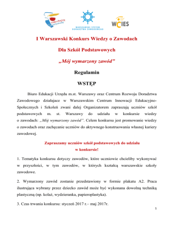 I Warszawski Konkurs Wiedzy o Zawodach Dla Szkół Podstawowych „Mój wymarzony zawód” Regulamin WSTĘP Biuro Edukacji Urzędu m.st. Warszawy oraz Centrum Rozwoju Doradztwa Zawodowego działajace w Warszawskim Centrum Innowacji EdukacyjnoSpołecznych i Szkoleń zwani dalej Organizatorem zapraszają uczniów szkół podstawowych m. st. Warszawy do udziału w konkursie wiedzy o zawodach: „Mój wymarzony zawód”. Celem konkursu jest promowanie wiedzy o zawodach oraz zachęcanie uczniów do aktywnego konstruowania własnej kariery zawodowej. Zapraszamy uczniów szkół podstawowych do udziału w konkursie! 1. Tematyka konkursu dotyczy zawodów, które uczniowie chcieliby wykonywać w przyszłości, w tym zawodów, w których kształcą warszawskie szkoły zawodowe. 2. Wymarzony zawód zostanie przedstawiony w formie plakatu A2. Praca ilustrująca wybrany przez dziecko zawód może być wykonana dowolną techniką plastyczną (np. kolaż, wydzieranka, papieroplastyka). 3. Czas trwania konkursu: styczeń 2017 r.– maj 2017r. 1 Konkurs będzie przebiegał w trzech etapach: I etap, tzw. szkolny: odbędzie się na terenie każdej szkoły podstawowej biorącej udział w konkursie – Komisja Szkolna oceni i wybierze najlepsze prace. II etap, tzw. międzyszkolny: 18 Komisji Dzielnicowych wybierze maksymalnie dwie prace sposród przesłanych przez Komisje Szkolne. III etap, tzw. finałowy: Kapituła Konkursu oceni nadesłane prace wg. ustalonych kryteriów. Najlepsze prace zostaną nagrodzone. CELE KONKURSU 1. Pogłębianie wiedzy na temat zawodów. 2. Rozbudzanie zainteresowań nowymi zawodami pojawiającymi się na współczesnym rynku pracy. 3. Rozwijanie umiejętności planowania własnej kariery edukacyjno-zawodowej. 4. Rozwijanie wyobraźni i kreatywnego myślenia poprzez komponowanie treści pracy konkursowej. ZASADY KONKURSU Konkurs jest adresowany do uczniów klas V i VI szkół podstawowych. 1. Konkurs polega na opracowaniu przez ucznia szkoły podstawowej plakatu ilustrującego wybrany przez niego zawód. Plakat należy wykonać w formacie A2 dowolną techniką plastyczną (np. kolaż, wydzieranka, papieroplastyka). 2. Każdy uczeń może zgłosić jedną pracę konkursową. 3. Jedna szkoła może zgłosić co najwyżej dwie prace konkursowe. Uczestnik konkursu zobowiązany jest do przedstawienia zgody rodziców/opiekunów prawnych na przetwarzanie danych osobowych, rozpowszechnianie wizerunku uczestnika konkursu oraz upowszechnienie pracy konkursowej. ( zał.1) 2 4. Pracę konkursową należy opisać na odwrocie. Za opisanie pracy odpowiedzialny jest nauczyciel – opiekun dziecka. 5. Każda praca powinna być opisana wg. schematu: tytuł pracy imię i nazwisko autora, nazwa i adres szkoły imię i nazwisko szkolnego koordynatora ds. doradztwa zawodowego e- mail i telefon kontaktowy koordynatora szkolnego 6. Do pracy konkursowej powinna być dołączona w kopercie zgoda rodzica/prawnego opiekuna na przetwarzanie danych osobowych ucznia, zgodnie z załącznikiem do regulaminu. (zał. 1) ORGANIZACJA KONKURSU 1. I etap konkursu: komisja powołana przez Szkolnego Koordynatora Doradztwa Zawodowego ogłasza konkurs w danej szkole i przeprowadza szkolne eliminacje wg. opisanych kryteriów. 2. Komisja wybiera dwie najlepsze prace uczniów i wysyła je do Wydziału Oświaty właściwego dla dzielnicy m.st. Warszawy. 3. II etap konkursu: eliminacje zewnętrzne. Koordynatorzy Doradztwa Zawodowego w dzielnicach powołują i uczestniczą wraz z Koordynatorami Doradztwa Zawodowego z Poradni Psychologiczno – Pedagogicznych w pracach Komisji Dzielnicowych. 4. Komisja dokonuje oceny prac plastycznych. Maksymalnie dwie prace z każdej dzielnicy przekazywane są do Centrum Rozwoju Doradztwa Zawodowego WCIES ul. Stara 4 ( sekretariat WCIES). 3 5. III etapu konkursu: finał konkursu. Nadesłane prace zostają ocenione przez Kapitułę Konkursu powołaną przez Dyrektora Biura Edukacji Urzędu m.st. Warszawy. Kapituła ocenia prace plastyczne uczniów wg. kryteriów opisanych poniżej. 6. Kapituła przy ocenie prac bierze pod uwagę: zgodność wykonanej pracy z podaną tematyką, oryginalność i pomysłowość pracy oraz wrażenie estetyczne. 7. Kapituła wyłania sześć najwyżej ocenionych prac przyznając I, II, III miejsce oraz wyróżnienia. 8. Ogłoszenie wyników i prezentacja nagrodzonych prac nastąpi na Gali Finałowej. Autorzy tych prac zostaną uhonorowani wartościowymi nagrodami rzeczowymi. TERMINY KONKURSU 1.I etap konkursu – od 16.01.2017 - do 01.03.2017r. 2.II etap konkursu – od 02.03.2017r. do 17.03.2017r. 3. III etap konkursu – 20.03.2017 r. do 14.04. 2017r. 4. Gala Finałowa – 30.05. 2016r. PRAWA AUTORSKIE 1. Uczestnicy konkursu przesyłając pracę konkursową dokonują przeniesienia na Organizatora konkursu autorskich praw majątkowych do nadesłanej pracy. 2. Organizator ma prawo do publicznego udostępniania prac konkursowych na stronach internetowych należących do Organizatora w tym na portalach społecznościowych. 4 OCHRONA DANYCH OSOBOWYCH 1. Uczestnicy Konkursu wyrażają zgodę na przetwarzanie danych osobowych do celów związanych z realizacją Konkursu. 2. W imieniu uczniów niepełnoletnich biorących udział w Konkursie zgodę w powyższym zakresie wyrażają rodzice lub prawni opiekunowie wypełniając formularz zgody dołączony do Regulaminu Konkursu w postaci załącznika. 3. Zgoda na przetwarzanie danych osobowych uczestnika musi być dostarczona w I etapie konkursu do koordynatora szkolnego, który przesyła zgodę do Organizatorów Konkursu wraz z pracą konkursową. 3. Brak zgody na przetwarzanie danych osobowych uczestnika jest jednoznaczne z jego rezygnacją udziału w konkursie. Serdecznie zapraszamy uczniów do udziału w konkursie! 5