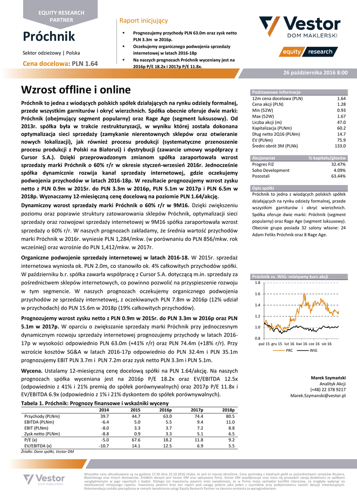 EQUITY RESEARCH PARTNER Raport inicjujący Próchnik Prognozujemy przychody PLN 63.0m oraz zysk netto PLN 3.3m w 2016p. Oczekujemy organicznego podwojenia sprzedaży internetowej w latach 2016-18p Na naszych prognozach Próchnik wyceniany jest na 2016p P/E 18.2x i 2017p P/E 11.8x. Sektor odzieżowy | Polska Cena docelowa: PLN 1.64 26 października 2016 8:00 Wzrost offline i online Próchnik to jedna z wiodących polskich spółek działających na rynku odzieży formalnej, przede wszystkim garniturów i okryć wierzchnich. Spółka obecnie oferuje dwie marki: Próchnik (obejmujący segment popularny) oraz Rage Age (segment luksusowy). Od 2013r. spółka była w trakcie restrukturyzacji, w wyniku której została dokonana optymalizacja sieci sprzedaży (zamykanie nierentownych sklepów oraz otwieranie nowych lokalizacji), jak również procesu produkcji (systematyczne przenoszenie procesu produkcji z Polski na Białoruś) i dystrybucji (zawarcie umowy współpracy z Cursor S.A.). Dzięki przeprowadzonym zmianom spółka zaraportowała wzrost sprzedaży marki Próchnik o 60% r/r w okresie styczeń-wrzesień 2016r. Jednocześnie spółka dynamicznie rozwija kanał sprzedaży internetowej, gdzie oczekujemy podwojenia przychodów w latach 2016-18p. W rezultacie prognozujemy wzrost zysku netto z PLN 0.9m w 2015r. do PLN 3.3m w 2016p, PLN 5.1m w 2017p i PLN 6.5m w 2018p. Wyznaczamy 12-miesięczną cenę docelową na poziomie PLN 1.64/akcję. Dynamiczny wzrost sprzedaży marki Próchnik o 60% r/r w 9M16. Dzięki zwiększeniu poziomu oraz poprawie struktury zatowarowania sklepów Próchnik, optymalizacji sieci sprzedaży oraz rozwojowi sprzedaży internetowej w 9M16 spółka zaraportowała wzrost sprzedaży o 60% r/r. W naszych prognozach zakładamy, że średnia wartość przychodów marki Próchnik w 2016r. wyniesie PLN 1,284/mkw. (w porównaniu do PLN 856/mkw. rok wcześniej) oraz wzrośnie do PLN 1,412/mkw. w 2017r. Organiczne podwojenie sprzedaży internetowej w latach 2016-18. W 2015r. sprzedaż internetowa wyniosła ok. PLN 2.0m, co stanowiło ok. 4% całkowitych przychodów spółki. W październiku b.r. spółka zawarła współpracę z Cursor S.A. dotyczącą m.in. sprzedaży za pośrednictwem sklepów internetowych, co powinno pozwolić na przyspieszenie rozwoju w tym segmencie. W naszych prognozach oczekujemy organicznego podwojenia przychodów ze sprzedaży internetowej, z oczekiwanych PLN 7.8m w 2016p (12% udział w przychodach) do PLN 15.6m w 2018p (19% całkowitych przychodów). Prognozujemy wzrost zysku netto z PLN 0.9m w 2015r. do PLN 3.3m w 2016p oraz PLN 5.1m w 2017p. W oparciu o zwiększanie sprzedaży marki Próchnik przy jednoczesnym dynamicznym rozwoju sprzedaży internetowej prognozujemy przychody w latach 201617p w wysokości odpowiednio PLN 63.0m (+41% r/r) oraz PLN 74.4m (+18% r/r). Przy wzroście kosztów SG&A w latach 2016-17p odpowiednio do PLN 32.4m i PLN 35.1m prognozujemy EBIT PLN 3.7m i PLN 7.2m oraz zysk netto PLN 3.3m i PLN 5.1m. Wycena. Ustalamy 12-miesięczną cenę docelową spółki na PLN 1.64/akcję. Na naszych prognozach spółka wyceniana jest na 2016p P/E 18.2x oraz EV/EBITDA 12.5x (odpowiednio z 41% i 21% premią do spółek porównywalnych) oraz 2017p P/E 11.8x i EV/EBITDA 6.9x (odpowiednio z 1% i 21% dyskontem do spółek porównywalnych). Podstawowe informacje 21 listopada 2014 12m cena docelowa (PLN) 1.64 Cena akcji (PLN) 1.28 Min (52W) 0.93 Max (52W) 1.67 Liczba akcji (m) 47.0 Kapitalizacja (PLNm) 60.2 Dług netto 2Q16 (PLNm) 14.7 EV (PLNm) 75.9 Średni obrót 3M (PLNk) 133.0 Akcjonariat Progres FIZ Soho Development Pozostali % kapitału/głosów 32.47% 4.09% 63.44% Opis spółki Próchnik to jedna z wiodących polskich spółek działających na rynku odzieży formalnej, przede wszystkim garniturów i okryć wierzchnich. Spółka oferuje dwie marki: Próchnik (segment popularny) oraz Rage Age (segment luksusowy). Obecnie grupa posiada 32 salony własne: 24 Adam Feliks Próchnik oraz 8 Rage Age. Próchnik vs. WIG: relatywny kurs akcji 1.8 1.6 1.4 1.2 1.0 0.8 paź 15 gru 15 lut 16 kwi 16 cze 16 sie 16 PRC WIG Marek Szymański Analityk Akcji (+48) 22 378 9217 [email protected] Tabela 1. Próchnik: Prognozy finansowe i wskaźniki wyceny Przychody (PLNm) EBITDA (PLNm) EBIT (PLNm) Zysk netto (PLNm) P/E (x) EV/EBITDA (x) 2014 39.7 -6.4 -8.0 -8.8 -5.0 -10.7 2015 44.7 5.0 3.3 0.9 67.6 14.1 2016p 63.0 5.5 3.7 3.3 18.2 12.5 2017p 74.4 9.4 7.2 5.1 11.8 6.9 2018p 80.5 11.0 8.8 6.5 9.2 5.5 Źródło: Dane spółki, Vestor DM Wszystkie ceny aktualizowane są na godzinę 17:30 dnia 25.10.2016 chyba, że jest to inaczej określone. Ceny pochodzą z lokalnych giełd za pośrednictwem serwisów Reutera, Bloomberga oraz innych dostawców. Źródłem danych jest Vestor DM oraz opisywane firmy. Vestor DM współpracuje oraz stara się prowadzić swoją działalność ze spółkami uwzględnionymi w jego raportach z badań. Dlatego też inwestorzy powinni mieć świadomość, że w firmie może zachodzić konflikt interesów, co mogłyby wpłynąć na obiektywność niniejszego raportu. Inwestorzy powinni brać ten raport pod uwagę jedynie jako jeden z czynników przy podejmowaniu swoich decyzji inwestycyjnych. Rekomendacja została sporządzona w ramach świadczenia usługi Equity Research Partner na zlecenie emitenta za wynagrodzeniem. Próchnik| Październik 2016 Próchnik Rachunek zysków i strat (PLNm) 2014 2015 2016p 2017p 2018p Przychody 39.7 44.7 63.0 74.4 80.5 P/E (x) 2014 2015 2016p 2017p 2018p -5.0 67.6 18.2 11.8 Próchnik 22.5 28.2 41.2 48.1 49.6 9.2 EV/EBITDA (x) -10.7 14.1 12.5 6.9 Rage Age 11.9 12.2 10.7 11.7 5.5 12.9 P/BV (x) 12.0 15.6 Stopa dywidendy (%) 1.74 0.0% 1.28 0.0% 1.19 0.0% 1.08 0.0% 0.97 0.0% Internet 0.1 2.0 7.8 Pozostałe 5.1 2.2 3.3 2.6 2.4 -19.2 -19.8 20.5 24.9 -27.3 -32.1 -34.1 Dane spółki 2014 2015 2016p 2017p 2018p 35.7 42.3 46.4 34.5 47.0 47.0 47.0 -26.1 47.0 -19.1 -27.7 -30.4 -32.7 -0.26 0.02 0.07 0.11 Koszty ogólnego zarządu