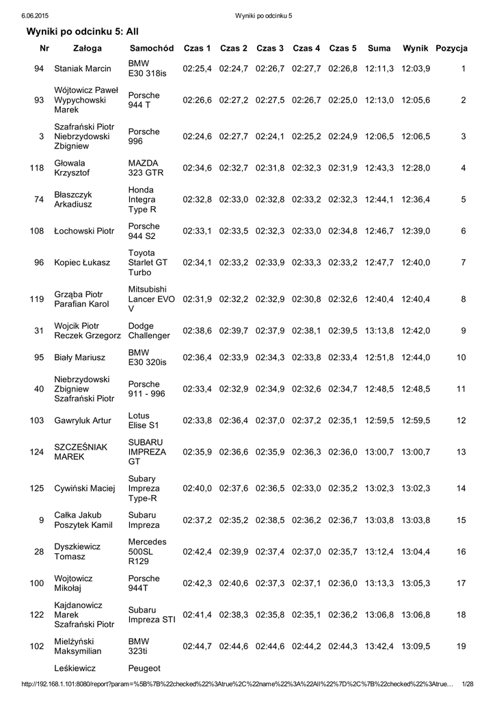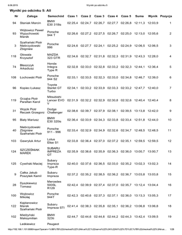 6.06.2015 Wyniki po odcinku 5 Wyniki po odcinku 5: All Nr Załoga Samochód Czas 1 Czas 2 Czas 3 Czas 4 Czas 5 Suma Wynik Pozycja BMW E30 318is 02:25,4 02:24,7 02:26,7 02:27,7 02:26,8 12:11,3 12:03,9 1 94 Staniak Marcin 93 Wójtowicz Paweł Porsche Wypychowski 944 T Marek 02:26,6 02:27,2 02:27,5 02:26,7 02:25,0 12:13,0 12:05,6 2 Szafrański Piotr Niebrzydowski Zbigniew Porsche 996 02:24,6 02:27,7 02:24,1 02:25,2 02:24,9 12:06,5 12:06,5 3 118 Głowala Krzysztof MAZDA 323 GTR 02:34,6 02:32,7 02:31,8 02:32,3 02:31,9 12:43,3 12:28,0 4 74 Błaszczyk Arkadiusz Honda Integra Type R 02:32,8 02:33,0 02:32,8 02:33,2 02:32,3 12:44,1 12:36,4 5 108 Łochowski Piotr Porsche 944 S2 02:33,1 02:33,5 02:32,3 02:33,0 02:34,8 12:46,7 12:39,0 6 96 Kopiec Łukasz Toyota Starlet GT Turbo 02:34,1 02:33,2 02:33,9 02:33,3 02:33,2 12:47,7 12:40,0 7 119 Grząba Piotr Parafian Karol Mitsubishi Lancer EVO 02:31,9 02:32,2 02:32,9 02:30,8 02:32,6 12:40,4 12:40,4 V 8 3 31 Wojcik Piotr Dodge Reczek Grzegorz Challenger 95 Biały Mariusz 40 02:38,6 02:39,7 02:37,9 02:38,1 02:39,5 13:13,8 12:42,0 9 BMW E30 320is 02:36,4 02:33,9 02:34,3 02:33,8 02:33,4 12:51,8 12:44,0 10 Niebrzydowski Zbigniew Szafrański Piotr Porsche 911 996 02:33,4 02:32,9 02:34,9 02:32,6 02:34,7 12:48,5 12:48,5 11 103 Gawryluk Artur Lotus Elise S1 02:33,8 02:36,4 02:37,0 02:37,2 02:35,1 12:59,5 12:59,5 12 124 SZCZEŚNIAK MAREK SUBARU IMPREZA GT 02:35,9 02:36,6 02:35,9 02:36,3 02:36,0 13:00,7 13:00,7 13 125 Cywiński Maciej Subary Impreza TypeR 02:40,0 02:37,6 02:36,5 02:33,0 02:35,2 13:02,3 13:02,3 14 9 Całka Jakub Poszytek Kamil Subaru Impreza 02:37,2 02:35,2 02:38,5 02:36,2 02:36,7 13:03,8 13:03,8 15 Dyszkiewicz Tomasz Mercedes 500SL R129 02:42,4 02:39,9 02:37,4 02:37,0 02:35,7 13:12,4 13:04,4 16 100 Wojtowicz Mikołaj Porsche 944T 02:42,3 02:40,6 02:37,3 02:37,1 02:36,0 13:13,3 13:05,3 17 122 Kajdanowicz Marek Szafrański Piotr Subaru 02:41,4 02:38,3 02:35,8 02:35,1 02:36,2 13:06,8 13:06,8 Impreza STI 18 102 Mielżyński Maksymilian BMW 323ti 19 Leśkiewicz Peugeot 28 02:44,7 02:44,6 02:44,6 02:44,2 02:44,3 13:42,4 13:09,5 http://192.168.1.101:8080/report?param=%5B%7B%22checked%22%3Atrue%2C%22name%22%3A%22All%22%7D%2C%7B%22checked%22%3Atrue… 1/28 6.06.2015 Wyniki po odcinku 5 18 Bartosz 205 02:39,8 02:38,1 02:37,1 02:38,9 02:39,4 13:13,3 13:13,3 20 76 Augustyniak Adam Augustyniak Liliana BMW E30 325e 02:43,1 02:42,1 02:41,6 02:41,1 02:42,8 13:30,7 13:14,4 21 78 Mazurek Mirosław Porsche 944S 02:44,9 02:43,4 02:44,8 02:41,5 02:41,6 13:36,2 13:19,8 22 112 Piwowarski Nikodem Kava Anna Opel Corsa A 02:43,3 02:41,5 02:43,3 02:39,6 02:40,5 13:28,2 13:20,1 23 105 Kacperek Marcin BMW 318 is 02:45,4 02:40,1 02:40,8 02:41,3 02:42,2 13:29,8 13:21,7 24 41 Słomski Radosław Toyota Mr2 02:42,5 02:41,9 02:46,2 02:44,5 02:43,0 13:38,1 13:21,7 25 51 Grzegory Konrad Opel Manta B 02:41,2 02:40,4 02:39,0 02:42,1 02:39,2 13:21,9 13:21,9 26 55 Gałganow Łukasz Wiercioch Sylwia BMW E30 M20 02:43,0 02:42,9 02:40,7 02:39,5 02:36,9 13:23,0 13:23,0 27 24 Łukasiewicz Witold Mercedes 124 500e 02:49,2 02:47,9 02:46,7 02:47,9 02:47,6 13:59,3 13:25,7 28 84 Słomska Agata Toyota Mr2 02:47,4 02:45,2 02:45,5 02:47,1 02:45,5 13:50,7 13:34,0 29 33 Kozdryk Bartlomiej Ford Mustang 02:42,9 02:45,7 02:42,8 02:45,0 02:37,9 13:34,3 13:34,3 30 81 Sapinski Jacek Umgelter Dorota Porsche 911 02:46,9 02:46,6 02:46,0 02:43,8 02:41,4 13:44,7 13:36,4 31 86 Kaczmarek Filip BMW 325 (E30) 02:45,3 02:45,6 02:55,0 02:45,6 02:45,0 13:56,5 13:39,7 32 Kozłowski Andrzej BMW E30 02:45,0 02:44,5 02:44,8 02:44,1 02:42,1 13:40,5 13:40,5 33 43 Chwist Marcin Porsche 944 02:48,1 02:44,9 02:44,1 02:43,2 02:43,4 13:43,7 13:43,7 34 80 Malessa Sebastian Malessa Sylwia Volvo 850 02:48,0 02:47,8 02:47,4 02:46,4 02:45,6 13:55,2 13:46,8 35 90 Gacek Arkadiusz Peugeot 205 GTI 02:50,3 02:47,5 02:50,6 02:49,0 02:49,5 14:06,9 13:49,9 36 79 MOŁDA szymon bmw e30 02:46,0 02:47,4 Kara: 02:47,3 02:46,0 02:44,9 14:06,6 13:49,9 15 37 65 Biłyk Marek Alfa Romeo Giulia 02:52,8 02:51,6 02:51,8 02:51,4 02:49,8 14:17,4 13:51,6 38 26 Machudera Andrzej Mercedes W107 SLC 02:52,2 02:51,3 02:51,1 02:57,4 02:54,5 14:26,5 13:51,8 39 53 Maleszewski Mariusz BMW 635 CSi 02:46,9 02:47,9 02:46,3 02:45,9 02:45,5 13:52,5 13:52,5 40 82 Biegoń Jan TOYOTA MR 2 02:55,8 02:52,9 02:50,4 02:49,5 02:50,5 14:19,1 14:01,9 41 7 http://192.168.1.101:8080/report?param=%5B%7B%22checked%22%3Atrue%2C%22name%22%3A%22All%22%7D%2C%7B%22checked%22%3Atrue… 2/28 6.06.2015 Wyniki po odcinku 5 104 Czuba Tomasz 113 ŁASZKIEWICZ MACIEJ ŁASZKIEWICZ MATEUSZ 109 Mazda MX5 02:40,0 02:39,2 02:40,0 02:38,7 03:38,4 14:16,3 14:07,7 42 FORD FIESTA 02:53,0 02:51,7 02:54,0 02:49,6 02:51,5 14:19,8 14:11,2 43 Pałacha Marek Cyrkowicz Wojciech Mazda 323 4WD turbo 02:52,5 02:53,7 02:54,0 02:51,4 02:51,5 14:23,1 14:14,4 44 64 Śliwka Waldemar Porsche 924 02:57,8 02:51,8 02:49,7 02:48,9 02:48,6 14:16,8 14:16,8 45 59 Nowakowski Jakub Skoda 100 02:52,1 02:53,1 Kara: 02:52,7 02:52,4 02:51,7 14:27,0 14:18,3 5 46 89 Kurek Krzysztof Peugeot 205 GTI 02:56,7 02:57,7 02:56,4 02:53,4 02:56,0 14:40,2 14:22,5 47 114 Wodziński Andrzej Lancia Fulvia 02:51,2 02:54,2 02:50,7 03:02,5 02:54,2 14:32,8 14:24,0 48 14 Pawluczuk Konrad BMW 316i E36 02:58,5 02:52,0 02:55,8 02:48,4 02:49,7 14:24,4 14:24,4 49 62 Świrk Krzysztof FSO 125p 02:57,2 02:53,4 02:53,2 02:51,6 02:50,0 14:25,4 14:25,4 50 16 Walkowski Antoni Renault Machowski Clio RS Adam 02:53,9 02:53,3 02:53,6 02:54,5 02:52,5 14:27,8 14:27,8 51 25 Karkut Jakub Karkut Marek Mercedes W124 03:06,4 03:03,5 03:03,5 03:03,1 03:04,8 15:21,3 14:35,2 52 54 Mazur Jakub Mazur Łukasz Ford Capri 02:58,4 02:59,1 03:02,1 02:51,9 02:53,2 14:44,7 14:35,8 53 66 Pawłowski Marek Lancia Wodziński Fulvia Andrzej 02:57,2 02:56,1 02:55,4 02:57,2 02:59,4 14:45,3 14:36,4 54 67 Wierzbicki Jacek Mazda Wierzbicki RX7 Aleksander 03:00,5 02:54,8 02:54,6 02:54,5 02:54,0 14:38,4 14:38,4 55 10 Slomski Jarosław Toyota Bartkowski Mr2 Radosław 02:51,5 03:02,0 02:51,8 03:05,8 02:48,9