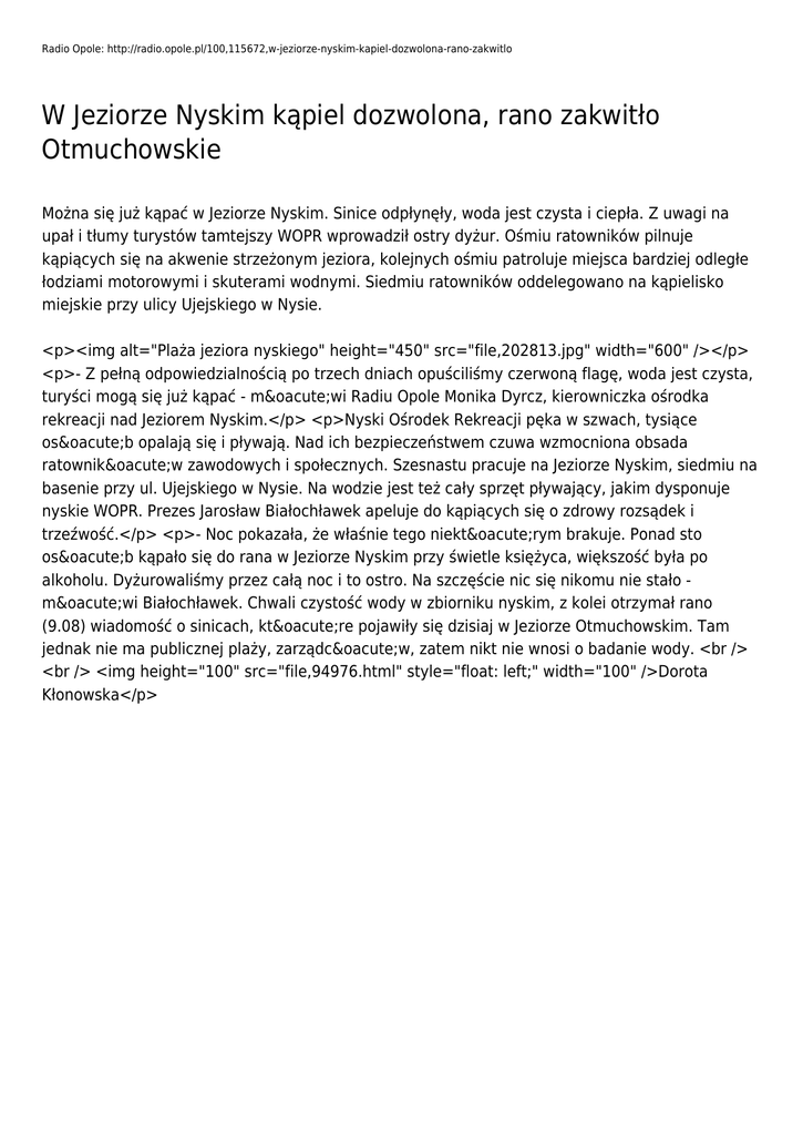 Radio Opole: http://radio.opole.pl/100,115672,w-jeziorze-nyskim-kapiel-dozwolona-rano-zakwitlo W Jeziorze Nyskim kąpiel dozwolona, rano zakwitło Otmuchowskie Można się już kąpać w Jeziorze Nyskim. Sinice odpłynęły, woda jest czysta i ciepła. Z uwagi na upał i tłumy turystów tamtejszy WOPR wprowadził ostry dyżur. Ośmiu ratowników pilnuje kąpiących się na akwenie strzeżonym jeziora, kolejnych ośmiu patroluje miejsca bardziej odległe łodziami motorowymi i skuterami wodnymi. Siedmiu ratowników oddelegowano na kąpielisko miejskie przy ulicy Ujejskiego w Nysie. <p><img alt="Plaża jeziora nyskiego" height="450" src="file,202813.jpg" width="600" /></p> <p>- Z pełną odpowiedzialnością po trzech dniach opuściliśmy czerwoną flagę, woda jest czysta, turyści mogą się już kąpać - mówi Radiu Opole Monika Dyrcz, kierowniczka ośrodka rekreacji nad Jeziorem Nyskim.</p> <p>Nyski Ośrodek Rekreacji pęka w szwach, tysiące osób opalają się i pływają. Nad ich bezpieczeństwem czuwa wzmocniona obsada ratowników zawodowych i społecznych. Szesnastu pracuje na Jeziorze Nyskim, siedmiu na basenie przy ul. Ujejskiego w Nysie. Na wodzie jest też cały sprzęt pływający, jakim dysponuje nyskie WOPR. Prezes Jarosław Białochławek apeluje do kąpiących się o zdrowy rozsądek i trzeźwość.</p> <p>- Noc pokazała, że właśnie tego niektórym brakuje. Ponad sto osób kąpało się do rana w Jeziorze Nyskim przy świetle księżyca, większość była po alkoholu. Dyżurowaliśmy przez całą noc i to ostro. Na szczęście nic się nikomu nie stało mówi Białochławek. Chwali czystość wody w zbiorniku nyskim, z kolei otrzymał rano (9.08) wiadomość o sinicach, które pojawiły się dzisiaj w Jeziorze Otmuchowskim. Tam jednak nie ma publicznej plaży, zarządców, zatem nikt nie wnosi o badanie wody. <br /> <br /> <img height="100" src="file,94976.html" style="float: left;" width="100" />Dorota Kłonowska</p>