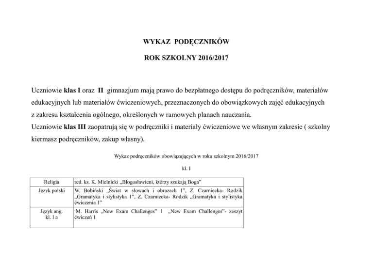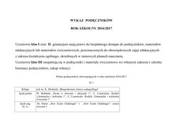 WYKAZ PODĘCZNIKÓW ROK SZKOLNY 2016/2017 Uczniowie klas I oraz II gimnazjum mają prawo do bezpłatnego dostępu do podręczników, materiałów edukacyjnych lub materiałów ćwiczeniowych, przeznaczonych do obowiązkowych zajęć edukacyjnych z zakresu kształcenia ogólnego, określonych w ramowych planach nauczania. Uczniowie klas III zaopatrują się w podręczniki i materiały ćwiczeniowe we własnym zakresie ( szkolny kiermasz podręczników, zakup własny). Wykaz podręczników obowiązujących w roku szkolnym 2016/2017 kl. I Religia Język polski Język ang. kl. I a red. ks. K. Mielnicki „Błogosławieni, którzy szukają Boga” W. Bobiński „Świat w słowach i obrazach 1”, Z. Czarniecka- Rodzik „Gramatyka i stylistyka 1”, Z. Czarniecka- Rodzik „Gramatyka i stylistyka ćwiczenia 1” M. Harris „New Exam Challenges” 1 ćwiczeń 1 „New Exam Challenges”- zeszyt Język ang. kl. I b Język niemiecki M. Harris, „New Exam Challenges 2” „New Exam Challenges – zeszyt ćwiczeń 2” E. Kręciejewska „Mit links 1” „Mit links zeszyt ćwiczeń 1” Plastyka S. Stopczyk „Bliżej sztuki” Muzyka J. Oleszkowicz „Gra muzyka” Geografia R. Malarz „Planeta Nowa 1” Biologia M. Jefimow, M. Sęktas „Puls życia 1” Chemia J. Kulawik, T. Kulawik, M. Litwin „Chemia Nowej Ery1” Fizyka G. Francuz- Ornat „Spotkania z fizyką cz. 1” Matematyka E. Duvnjak „Matematyka wokół nas 1” Zajęcia tech. W. Czyżewski „Technika w praktyce” Historia red. S. Roszak „Śladami przeszłości 1” kl. II Religia red. ks. K. Mielnicki „Błogosławieni, którzy ufają Bogu” Język polski W. Bobiński „Świat w słowach i obrazach 2”, Z. Czarniecka- Rodzik „Gramatyka i stylistyka 2”, Z. Czarniecka- Rodzik „Gramatyka i stylistykaćwiczenia 2” Język ang. kl. II a,c M. Harris „New Exam Challenges 2” zeszyt ćwiczeń -„New Exam Challenges 2” Język ang. kl. II b M. Harris „New Exam Challenges 3” „New Exam Challenges – zeszyt ćwiczeń 3” Język niemiecki C. Serzysko „Mit links 2” „Mit links- zeszyt ćwiczeń 2” Informatyka P. Durka „Informatyka dla ciebie” Geografia D. Szczypiński „Planeta Nowa 2” M. Szubert „Planeta Nowa 3” Biologia M. Jefimow „Puls życia 2” Chemia J. Kulawik „Chemia Nowej Ery 2” Fizyka G. Francuz- Ornat „Spotkania z fizyką cz. 2” Matematyka A. Drążek „Matematyka wokół nas 2” Zajęcia tech. W. Czyżewski „Technika w praktyce” Historia red. S. Roszak „Śladami przeszłości 2” WOS I. Janicka „Dziś i jutro” KLASA III Przedmiot Język polski Autor Tytuł W. Bobiński „Świat w słowach i obrazach” – kl. III Z. Czarniecka - Rodzik Wydawnictwo WSiP „Gramatyka i stylistyka” kl. III Język obcy nowożytny angielski. Harris, Mower, Sikorzyńska "Exam Challenges 3" Pearson Edukation Polska Sp. z o.o Język obcy nowożytny niemiecki J. Kamińska „Mit links 3” kurs podstawowy Podręcznik + ćwiczenia Wydawnictwo Pearson "Historia 3" Historia J.Ustrzycki Wydawnictwo Pedagogiczne "OPERON" Sp.z o.o + ćwiczenia , atlas wyd. „OPERON” Wiedza o społeczeństwie Dobrzycka, Makara "Wiedza o społeczeństwie" Cz.II Wydawnictwo Pedagogiczne "Operon" sp. z o.o Biologia Jefimow, Sęktas "Puls życia" Podręcznik dla gimnazjum kl. III i II , ćwiczenia cz.III i II Wydawnictwo "Nowa era" Sp. z o.o Chemia Kulawik, Litwin "Chemia Nowej Ery" Cz.III i II "Nowa Era" Sp. z o.o + zbiór zadań + ćwiczenia cz. III i II Fizyka Kulawik, Francuz-Ornat, "Spotkania z fizyką" cz.IV Nowotny -Różańska Nowa Era Sp. z o.o Tylko podręcznik Duvnjak, Kokiernak-Jurkiewicz "Matematyka wokół nas kl. III" Drążek Wydawnictwo Szkolne i Pedagogiczne S.A. T.Król „Wędrując ku dorosłości” Wydawnictwo Rubikon, 2011 Religia T. Śmiech "Błogosławieni, którzy naśladują Jezusa” Informatyka M. Kołodziej Matematyka podręcznik + zbiór zadań + ćwiczenia internetowe WDŻR (na stanie szkoły) "Informatyka" Cz.II Wydawnictwo Pedagogiczne "Operon" Sp. z o.o Edukacja dla bezpieczeństwa J. Lauk :edukacja dla bezpieczeństwa” PWN 2009 Geografia A. Przybył - tylko zeszyt do ćwiczeń D. Szczypiński, M. Wójtowicz Kontynuacja „Planeta Nowa 3” Wydawnictwo „Nowa Era” podręcznik + ćwiczenia