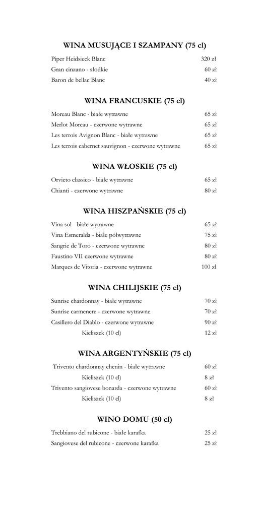 WINA MUSUJĄCE I SZAMPANY (75 cl) Piper Heidsieck Blanc 320 zł Gran cinzano - słodkie 60 zł Baron de bellac Blanc 40 zł WINA FRANCUSKIE (75 cl) Moreau Blanc - białe wytrawne 65 zł Merlot Moreau - czerwone wytrawne 65 zł Les terrois Avignon Blanc - białe wytrawne 65 zł Les terrois cabernet sauvignon - czerwone wytrawne 65 zł WINA WŁOSKIE (75 cl) Orvieto classico - białe wytrawne 65 zł Chianti - czerwone wytrawne 80 zł WINA HISZPAŃSKIE (75 cl) Vina sol - białe wytrawne 65 zł Vina Esmeralda - białe półwytrawne 75 zł Sangrie de Toro - czerwone wytrawne 80 zł Faustino VII czerwone wytrawne 80 zł Marques de Vitoria - czerwone wytrawne 100 zł WINA CHILIJSKIE (75 cl) Sunrise chardonnay - białe wytrawne 70 zł Sunrise carmenere - czerwone wytrawne 70 zł Casillero del Diablo - czerwone wytrawne 90 zł Kieliszek (10 cl) 12 zł WINA ARGENTYŃSKIE (75 cl) Trivento chardonnay chenin - białe wytrawne Kieliszek (10 cl) Trivento sangiovese bonarda - czerwone wytrawne Kieliszek (10 cl) 60 zł 8 zł 60 zł 8 zł WINO DOMU (50 cl) Trebbiano del rubicone - białe karafka 25 zł Sangiovese del rubicone - czerwone karafka 25 zł