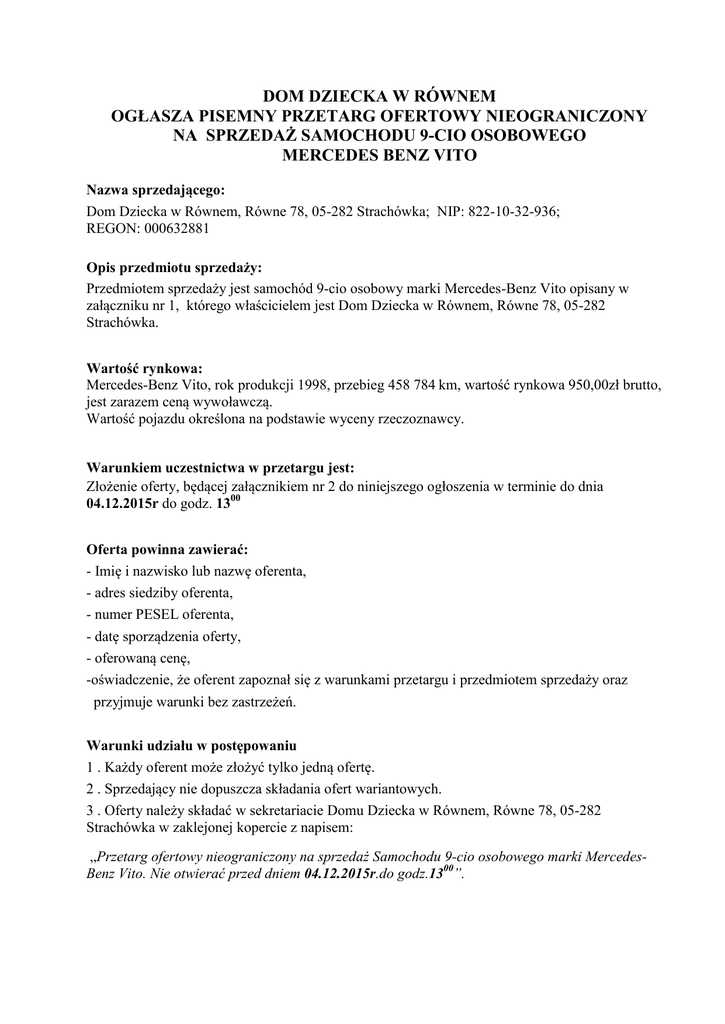 DOM DZIECKA W RÓWNEM OGŁASZA PISEMNY PRZETARG OFERTOWY NIEOGRANICZONY NA SPRZEDAŻ SAMOCHODU 9-CIO OSOBOWEGO MERCEDES BENZ VITO Nazwa sprzedającego: Dom Dziecka w Równem, Równe 78, 05-282 Strachówka; NIP: 822-10-32-936; REGON: 000632881 Opis przedmiotu sprzedaży: Przedmiotem sprzedaży jest samochód 9-cio osobowy marki Mercedes-Benz Vito opisany w załączniku nr 1, którego właścicielem jest Dom Dziecka w Równem, Równe 78, 05-282 Strachówka. Wartość rynkowa: Mercedes-Benz Vito, rok produkcji 1998, przebieg 458 784 km, wartość rynkowa 950,00zł brutto, jest zarazem ceną wywoławczą. Wartość pojazdu określona na podstawie wyceny rzeczoznawcy. Warunkiem uczestnictwa w przetargu jest: Złożenie oferty, będącej załącznikiem nr 2 do niniejszego ogłoszenia w terminie do dnia 04.12.2015r do godz. 1300 Oferta powinna zawierać: - Imię i nazwisko lub nazwę oferenta, - adres siedziby oferenta, - numer PESEL oferenta, - datę sporządzenia oferty, - oferowaną cenę, -oświadczenie, że oferent zapoznał się z warunkami przetargu i przedmiotem sprzedaży oraz przyjmuje warunki bez zastrzeżeń. Warunki udziału w postępowaniu 1 . Każdy oferent może złożyć tylko jedną ofertę. 2 . Sprzedający nie dopuszcza składania ofert wariantowych. 3 . Oferty należy składać w sekretariacie Domu Dziecka w Równem, Równe 78, 05-282 Strachówka w zaklejonej kopercie z napisem: „Przetarg ofertowy nieograniczony na sprzedaż Samochodu 9-cio osobowego marki MercedesBenz Vito. Nie otwierać przed dniem 04.12.2015r.do godz.1300”. Miejsce i termin, w którym można obejrzeć przedmiot sprzedaży. 1. Samochód 9-cio osobowy Mercedes Benz Vito, będący przedmiotem sprzedaży można obejrzeć od poniedziałku do piątku od godz. 830 do godz. 1530 na terenie Domu Dziecka w Równem, Równe 78, 05-282 Strachówka, po wcześniejszym telefonicznym uzgodnieniu godziny oględzin. Osoba do kontaktowania się z oferentem: Jan Nowak, tel. 25 676 09 14, 508 322 962 Pozostałe informacje: 1. Otwarcie ofert nastąpi w dniu 04.12.2015 roku o godz. 1330 w sekretariacie Domu Dziecka w Równem. Po wybraniu najkorzystniejszej oferty, oferent zostanie powiadomiony o wyborze jego oferty: osobiście w dniu wyboru (w przypadku obecności oferenta), telefoniczni i lub e-mailem wg. danych przedstawionych w ofercie w ciągu 2 dni roboczych od otwarcia ofert. Jeżeli oferent nie zgłosi się w ciągu 7 dni w celu zawarcia umowy to przetarg zostanie unieważniony. 2. Samochód zostanie sprzedany za najwyższą zaoferowaną cenę. Odbiór następuje po wpłacie oferowanej kwoty na rachunek bankowy nr. 46 1020 1042 0000 8102 0115 7304. 3. W przypadku zaoferowania takiej samej ceny przez więcej niż jednego oferenta, zostanie przeprowadzona licytacja poprzez zbieranie ofert drogą elektroniczną 4. Kupujący oświadcza, że znany jest mu stan techniczny przedmiotu sprzedaży, z uwagi na który nie zostaje udzielona gwarancja oraz stosownie do treści art. 558 § 1 KC zostaje wyłączona rękojmia (w zakresie w jakim przepisy obowiązującego prawa taką możliwość dopuszczają), a ponadto oświadcza, że z tego tytułu nie będzie rościł żadnych pretensji do Sprzedającego. 5. Oferty cenowe poniżej ceny wywoławczej nie będą rozpatrywane. 6. Wszelkie informacje na temat sprzedaży samochodu Mercedes Benz Vito można uzyskać u Dyrektora Domu Dziecka w Równem, Równe 78, 05-282 Strachówka w godz. 830-1530 lub pod nr telefonu 25 676 09 14, 508 322 962. Zastrzega się, że przysługuje prawo unieważnienia przetargu bez wybrania którejkolwiek z ofert. Załączniki: 1. Opis techniczny (1) 2. Oferta i oświadczenie (2) 3. Umowa kupna-sprzedaży (3) 4. Protokół przekazania (4) Równe, 18.11.2015r.