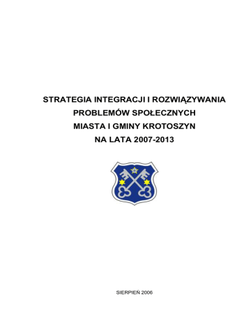 STRATEGIA INTEGRACJI I ROZWIĄZYWANIA PROBLEMÓW SPOŁECZNYCH MIASTA I GMINY KROTOSZYN NA LATA 2007-2013 SIERPIEŃ 2006 SPIS TREŚCI 1. CZĘŚĆ WSTĘPNA......................................................................................................3 1.1. TŁO I PRZYCZYNY..............................................................................................4 1.2. WARTOŚCI, ZASADY, DEFINICJE .....................................................................6 1.3. STRUKTURA DOKUMENTU .............................................................................10 1.4. PRZESŁANKI WYNIKAJĄCE Z DOKUMENTÓW STRATEGICZNYCH..............12 2. CZĘŚĆ DIAGNOSTYCZNA ......................................................................................21 2.1. CHARAKTERYSTYKA GMINY ..........................................................................22 2.2. DEMOGRAFIA ...................................................................................................23 2.3. MARGINALIZACJA I WYKLUCZENIE W PERSPEKTYWIE OŚRODKA POMOCY SPOŁECZNEJ ...................................................................................26 2.4. KWESTIA DZIECKA...........................................................................................35 2.5. KWESTIA OSÓB BEZROBOTNYCH .................................................................40 2.6. KWESTIA UZALEśNIEŃ....................................................................................45 2.7. KWESTIA PRZESTĘPCZOŚCI..........................................................................48 2.8. KWESTIA NIEPEŁNOSPRAWNOŚCI................................................................49 2.9. IDENTYFIKACJA NAJWAśNIEJSZYCH PROBLEMÓW SPOŁECZNYCH NA TERENIE GMINY.........................................................................................51 2.10. ANALIZA SWOT...............................................................................................55 2.11. ZASOBY UMOśLIWIAJĄCE ROZWIĄZYWANIE PROBLEMÓW SPOŁECZNYCH ..............................................................................................62 2.12. PODSUMOWANIE CZĘŚCI DIAGNOSTYCZNEJ ...........................................76 3. CZĘŚĆ PROGRAMOWA ..........................................................................................78 3.1. MISJA.................................................................................................................79 3.2. CELE STRATEGICZNE .....................................................................................81 3.3. MONITORING I WDRAśANIE STRATEGII........................................................92 4. UWAGI KOŃCOWE ..................................................................................................96 STRATEGIA INTEGRACJI I ROZWIĄZYWANIA PROBLEMÓW SPOŁECZNYCH MIASTA I GMINY KROTOSZYN 2 1. CZĘŚĆ WSTĘPNA Część wstępna zawiera elementarne informacje dotyczące zasad konstruowania dokumentu. Przedstawione w niej zostały aspekty prawne, będące podstawą działania samorządu lokalnego, zasady i wartości, na których opiera się lokalna polityka społeczna oraz najwaŜniejsze informacje dotyczące metodyki pracy nad strategią. Jest tutaj takŜe pokazany związek analizy z innymi dokumentami strategicznymi funkcjonującymi na róŜnych poziomach administrowania i zarządzania. STRATEGIA INTEGRACJI I ROZWIĄZYWANIA PROBLEMÓW SPOŁECZNYCH MIASTA I GMINY KROTOSZYN 3 1.1. TŁO I PRZYCZYNY Strategia Integracji i Rozwiązywania Problemów Społecznych ma stanowić podstawę do realizacji względnie trwałych wzorów interwencji społecznych, podejmowanych w celu zmiany (poprawy) tych stanów rzeczy (zjawisk) występujących w obrębie danej społeczności, które oceniane są negatywnie. Dokument charakteryzuje w szczególności działania publicznych i prywatnych instytucji rozwiązujących kwestie społeczne, podejmowane dla poprawy warunków zaspokojenia potrzeb przez wybrane kategorie osób i rodzin. Obowiązek opracowania Strategii Integracji i Rozwiązywania Problemów Społecznych wynika wprost z art. 17. ust. 1 ustawy o pomocy społecznej z dnia 12 marca 2004 r. (Dz. U. z 2004 r. Nr 64, poz. 593 z późn. zm.). RóŜnorodność problemów społecznych występujących w gminie powoduje konieczność wzięcia pod uwagę takŜe innych aktów prawnych, które mają istotny wpływ na konstrukcję dokumentu i rozwiązywanie zadań społecznych w przyszłości. Są to m.in.: • ustawa z dnia 24 kwietnia 2003 r. o działalności poŜytku publicznego i o wolontariacie (Dz. U. z 2003 r. Nr 96, poz. 873 z późn. zm.), • ustawa z dnia 13 czerwca 2003 r. o zatrudnieniu socjalnym (Dz. U. z 2003 r. Nr 122, poz. 1143 z późn. zm.), • ustawa z dnia 20 kwietnia 2004 r. o promocji zatrudnienia i instytucjach rynku pracy (Dz. U. z 2004 r. Nr 99, poz. 1001), • ustawa z dnia 26 października 1982 r. o wychowaniu w trzeźwości i przeciwdziałaniu alkoholizmowi (Dz. U. z 2002 r. Nr 147, poz. 1231 z późn. zm.), • ustawa z dnia 27 sierpnia 1997 r. o rehabilitacji zawodowej i społecznej oraz zatrudnianiu osób niepełnosprawnych (Dz. U. z 1997 r. Nr 123, poz. 776 z późn. zm.), • ustawa z 28 listopada 2003 r. o świadczeniach rodzinnych (Dz. U. z 2003 r. Nr 228 poz. 2255 z późn. zm.), • ustawa z dnia 29 lipca 2005 r. o przeciwdziałaniu narkomanii (Dz. U. z 2005 r. Nr 179, poz. 1485), • ustawa z dnia 29 lipca 2005 r. o przeciwdziałaniu przemocy w rodzinie (Dz. U z 2005 r. Nr 180 poz. 1493). STRATEGIA INTEGRACJI I ROZWIĄZYWANIA PROBLEMÓW SPOŁECZNYCH MIASTA I GMINY KROTOSZYN 4 Oprócz wspomnianych aktów prawnych przy realizacji strategii moŜe zachodzić potrzeba odwołania się równieŜ do ustaw i aktów wykonawczych z zakresu ochrony zdrowia, oświaty i edukacji publicznej, budownictwa socjalnego. Europejska polityka społeczna została określona w głównej mierze podczas Szczytu Lizbońskiego w 2000 roku, na którym kraje cz